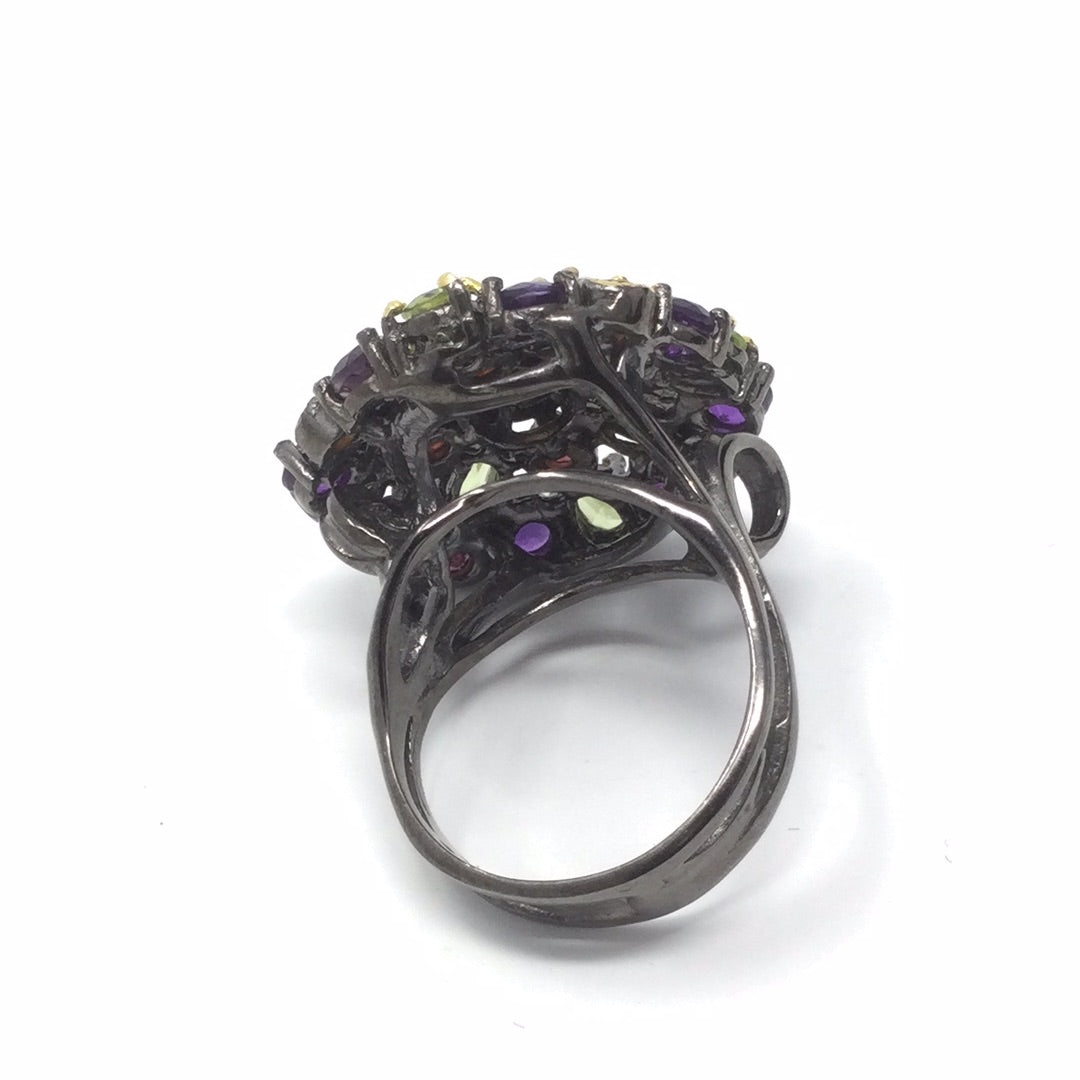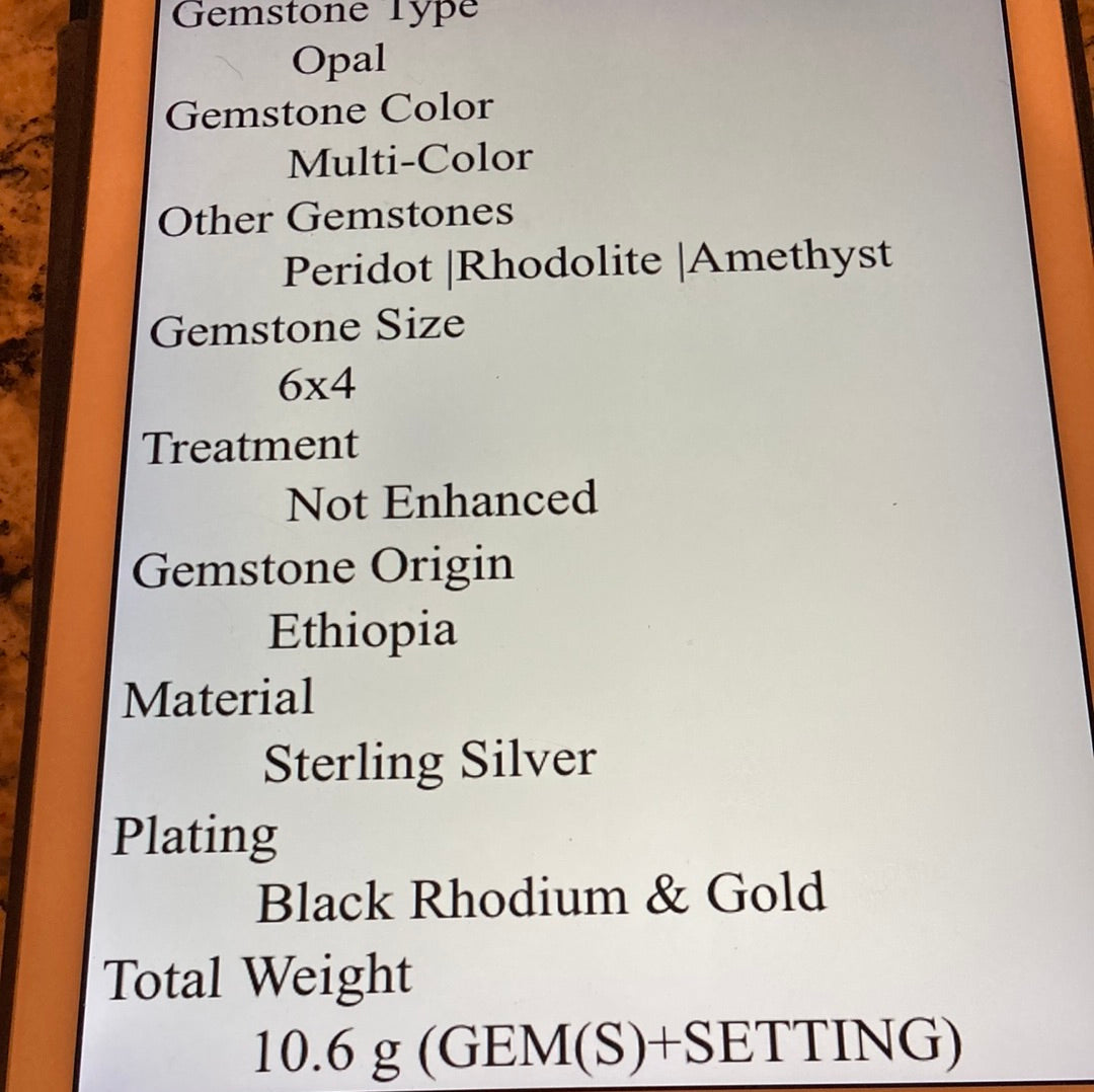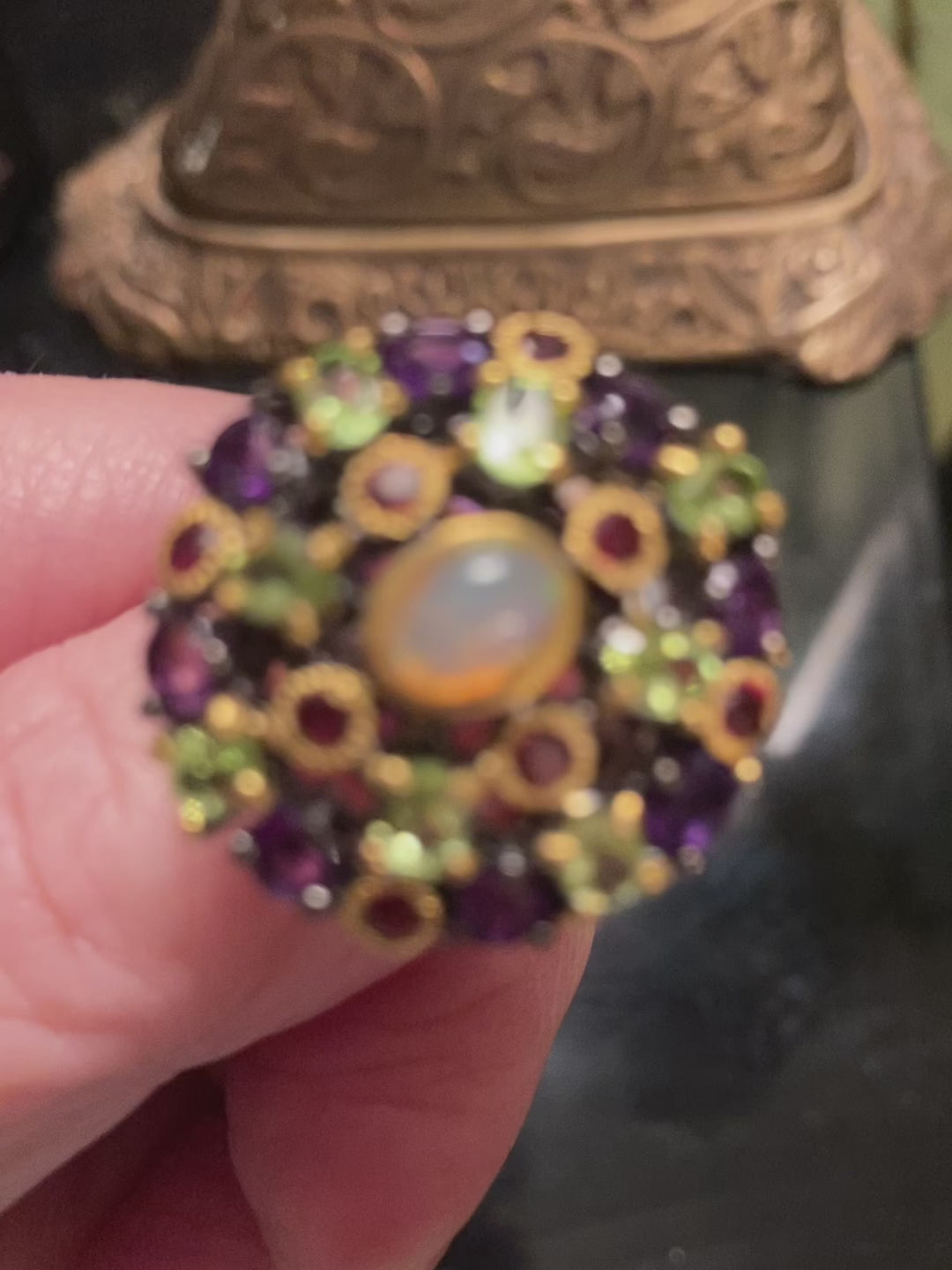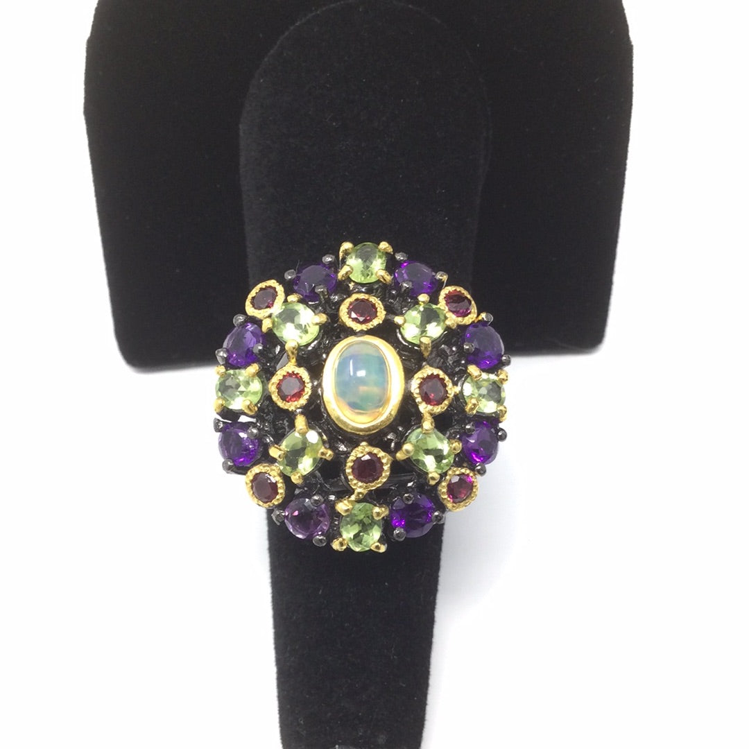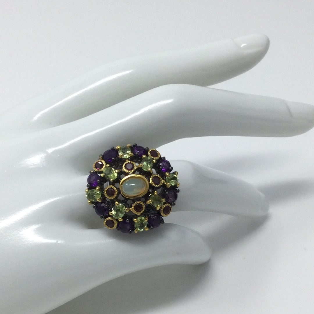 A dramatic look in deep rich jewel tones that is a gemstone fireworks show. Featuring all top quality genuine gemstones, Fiery Opal, deep purple Amethysts, Garnets & Peridot. A gorgeous color palette with a high end look. Set in .925 with a Rhodium overlay, this is a one of a kind custom made ring. The gemstones are very artistic in this masterpiece of a ring. Size 6 1/2 Resize at your jeweler.