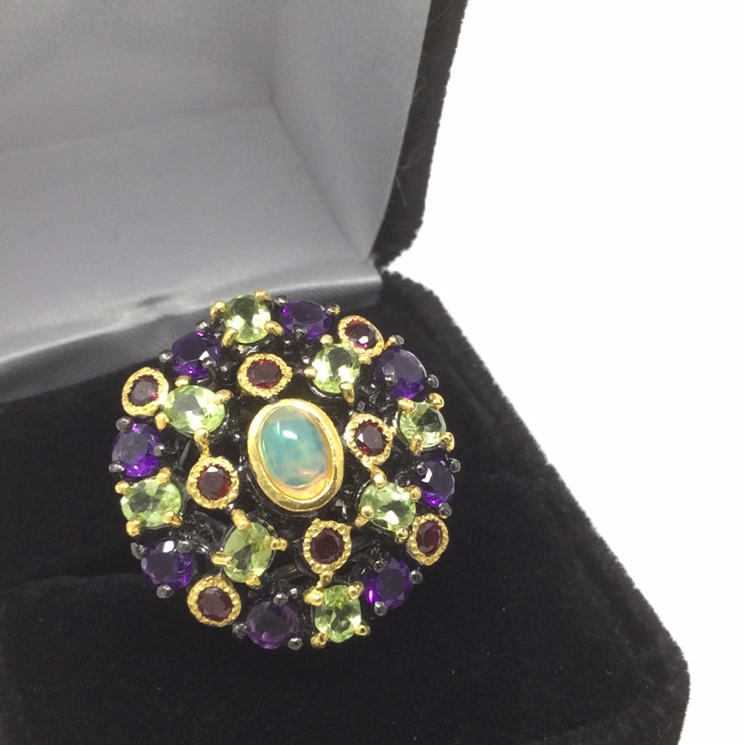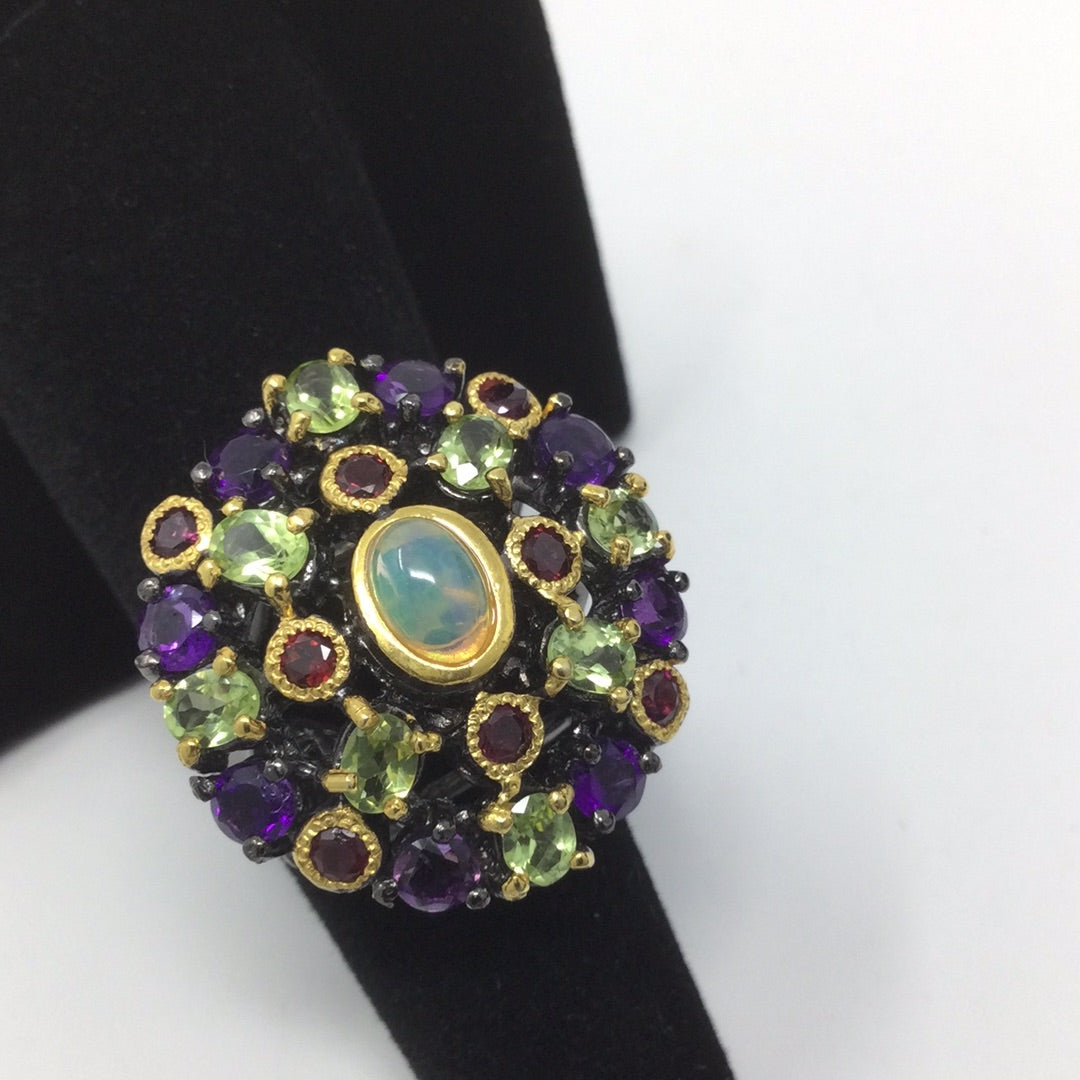 Genuine Fiery Opal, Amethysts, Garnets & Peridot Ring