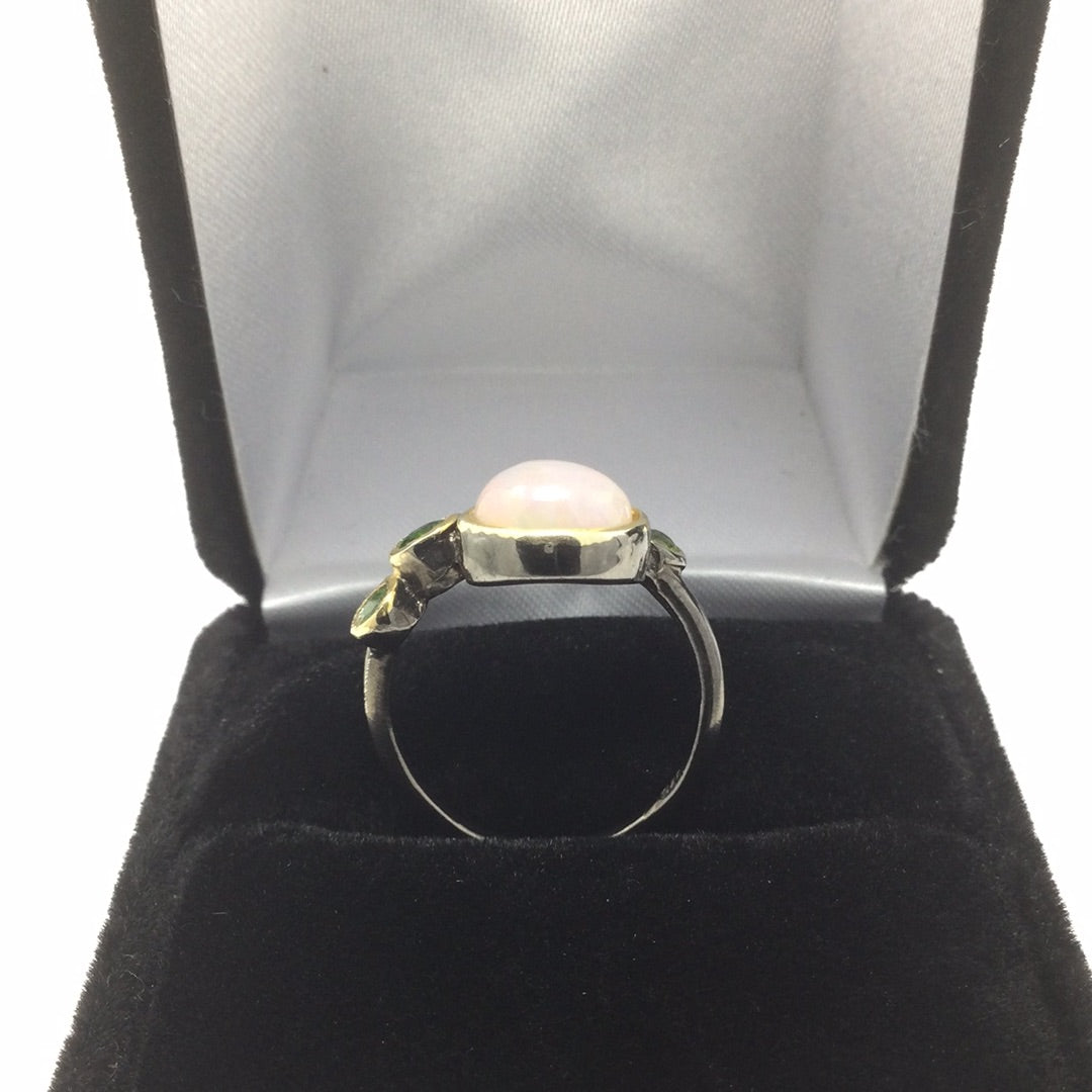 An opulent, natural, fiery Opal kissed by genuine Russian Chrome Diopside in this contemporary setting. It has an edgy look, a work of modern art to adorn your hand. All custom made setting in .925 silver, with a Rhodium overlay for durability and beauty. Each gemstone is encircled with brushed yellow gold. All genuine gemstones as unique as you are. Size 5 3/4 Resize at your jeweler.