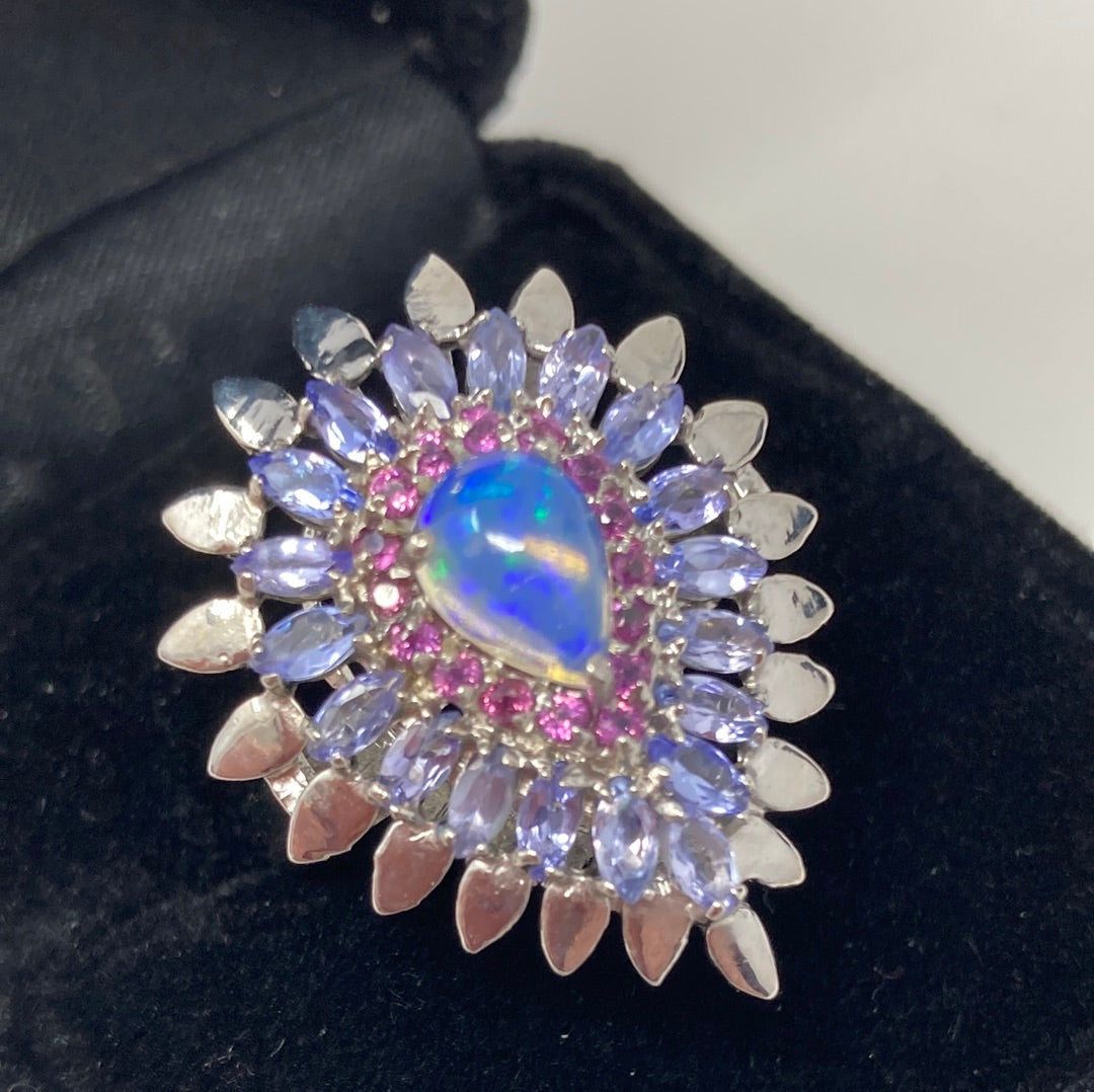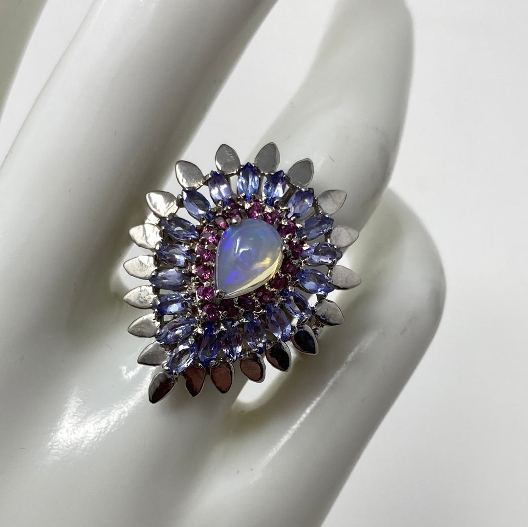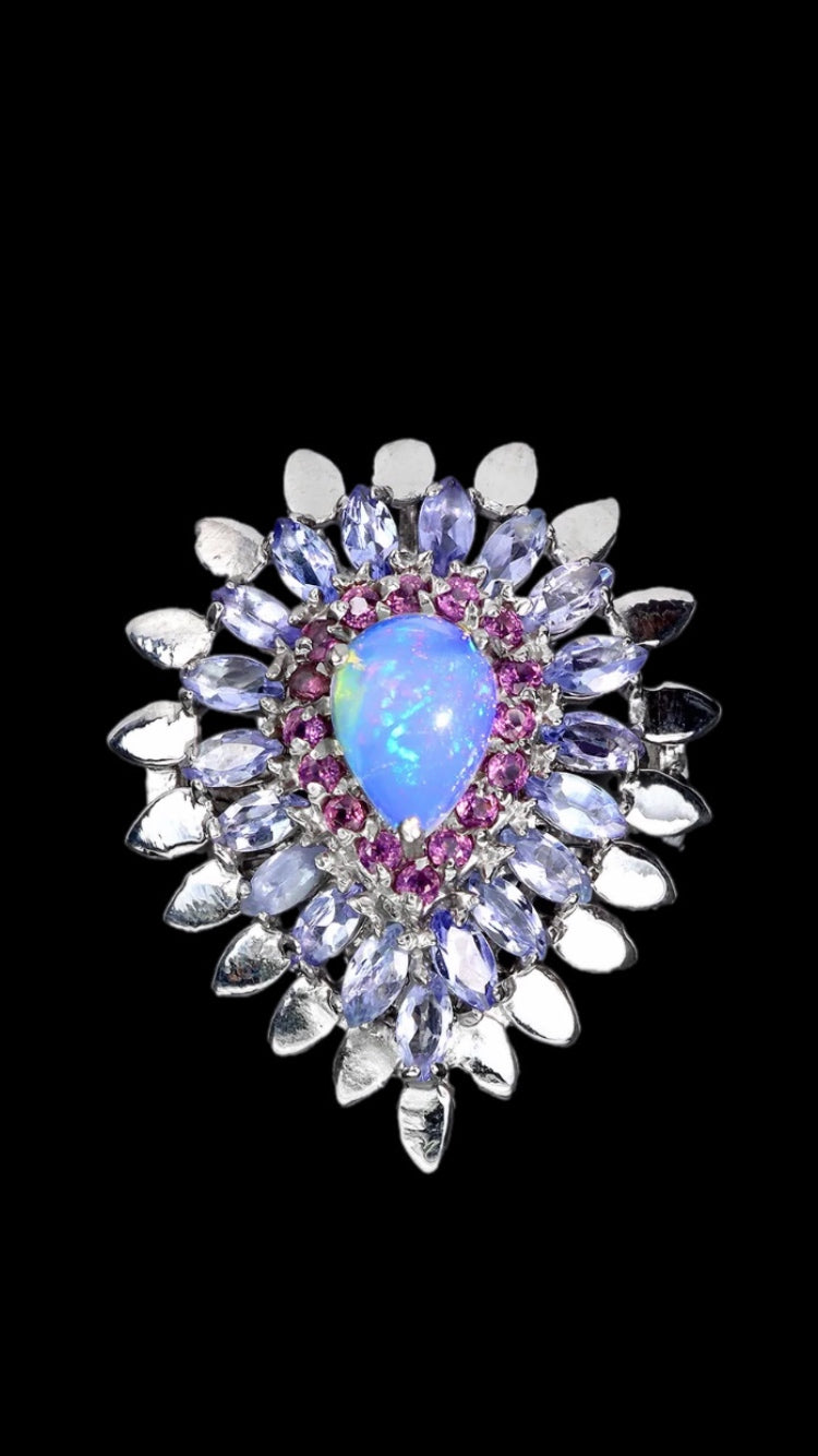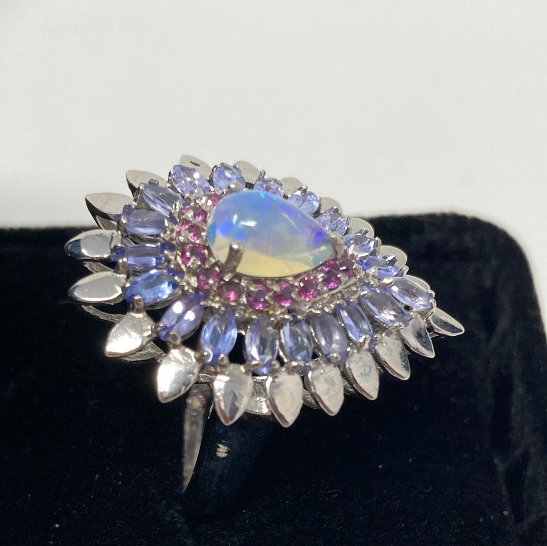 An exquisite, fiery Genuine Opal measuring 8mm by 6mm surrounded by rare Genuine Tanzanite and Rhodolite Garnets. A wonderful work of art to wear upon your hand. This is a custom made, one of a kind treasure to cherish now and for future generations to come. Investing in genuine gemstones is a lifetime of beauty and class. Set in .925 Sterling silver in a custom made, one of a kind setting. Size 7, Β Resize at your jeweler or use a ring guard Β Β