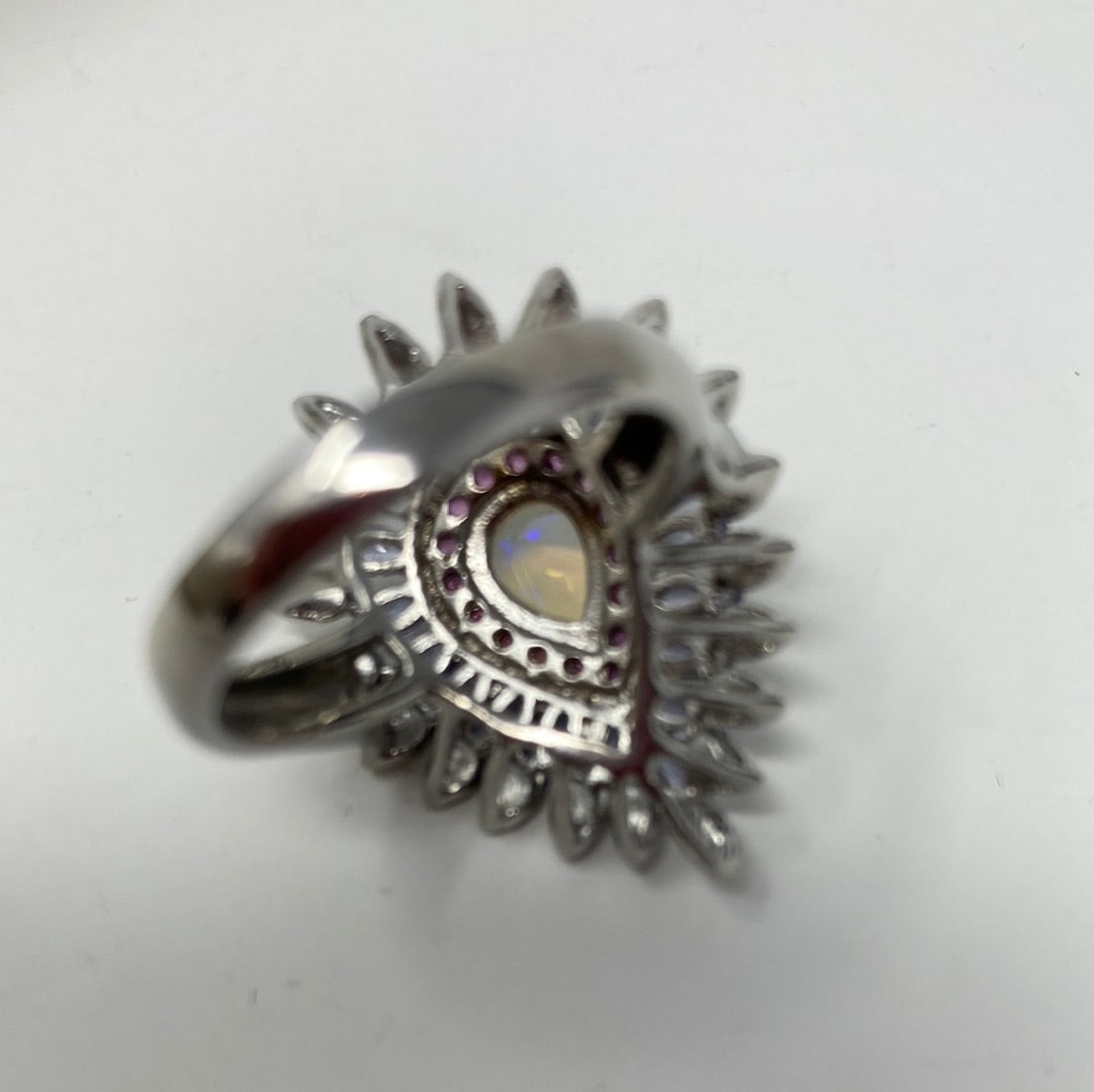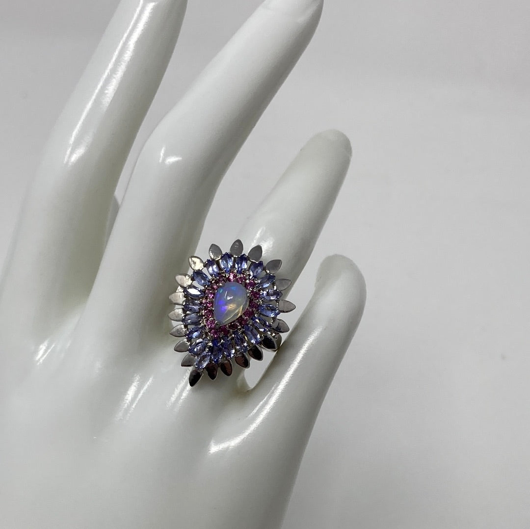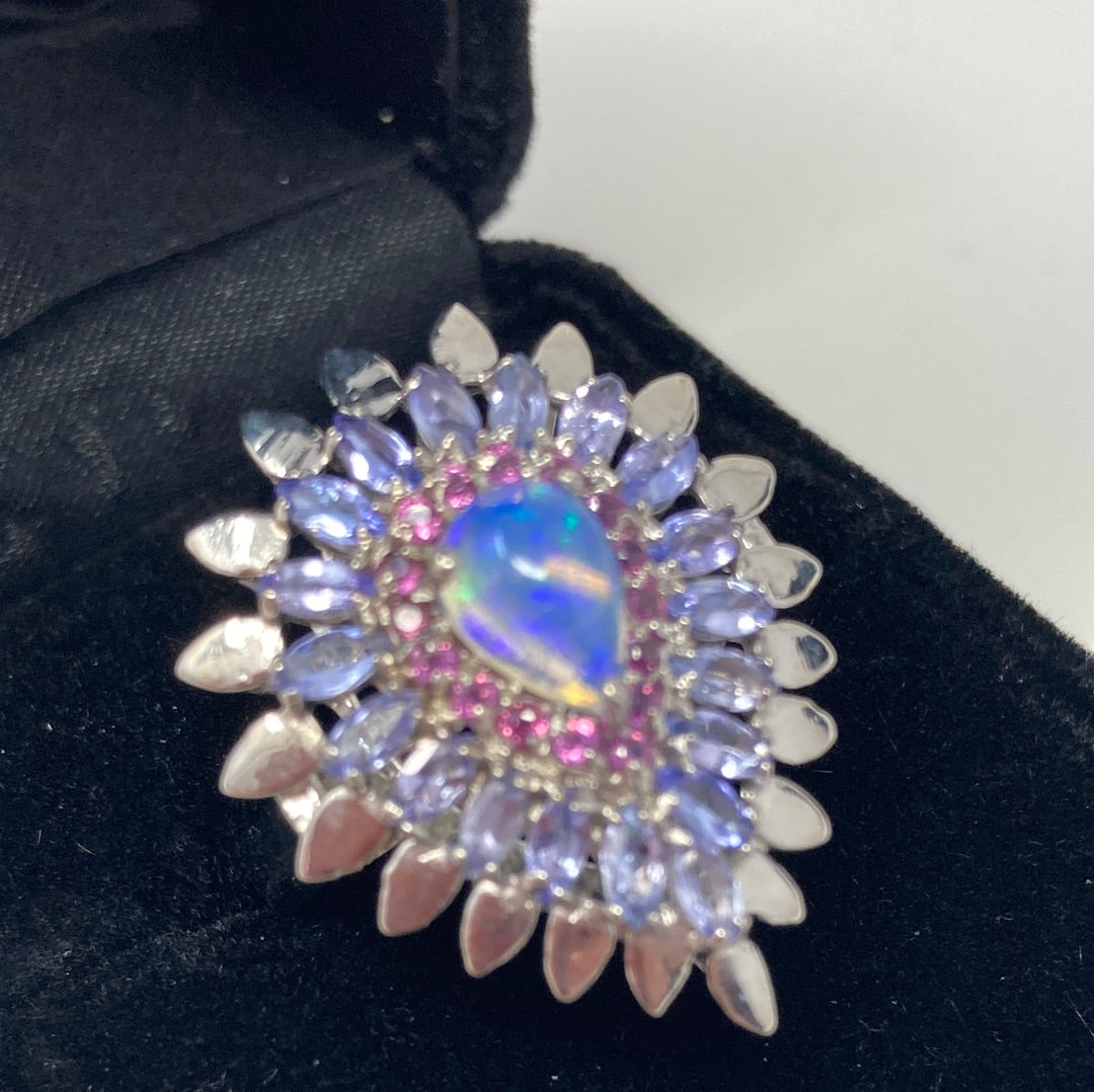 An exquisite, fiery Genuine Opal measuring 8mm by 6mm surrounded by rare Genuine Tanzanite and Rhodolite Garnets. A wonderful work of art to wear upon your hand. This is a custom made, one of a kind treasure to cherish now and for future generations to come. Investing in genuine gemstones is a lifetime of beauty and class. Set in .925 Sterling silver in a custom made, one of a kind setting. Size 7, Β Resize at your jeweler or use a ring guard Β Β