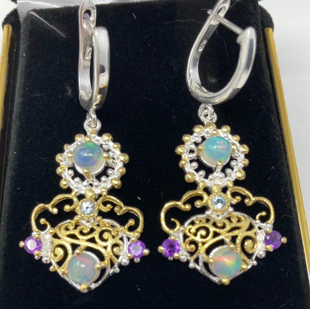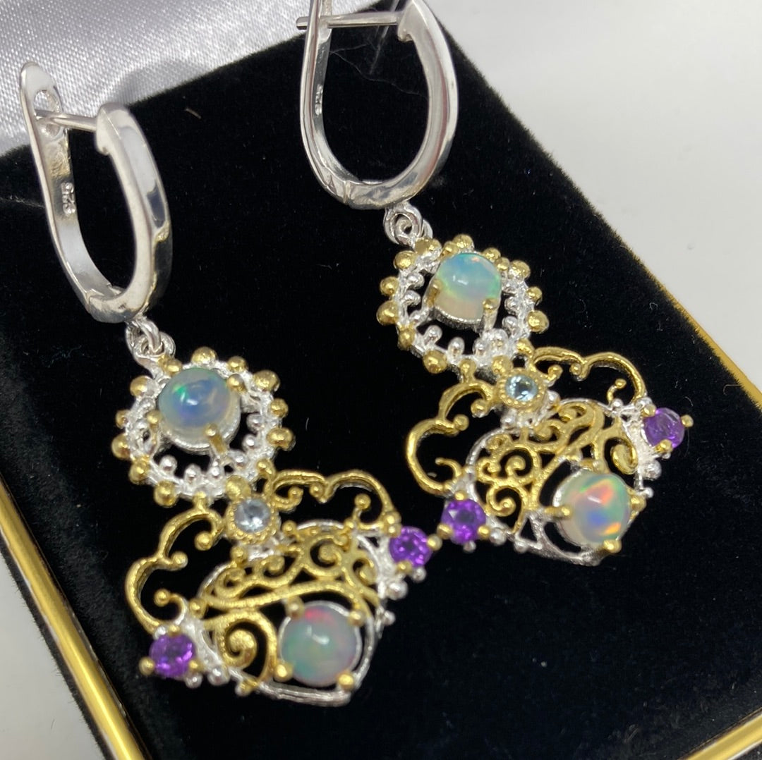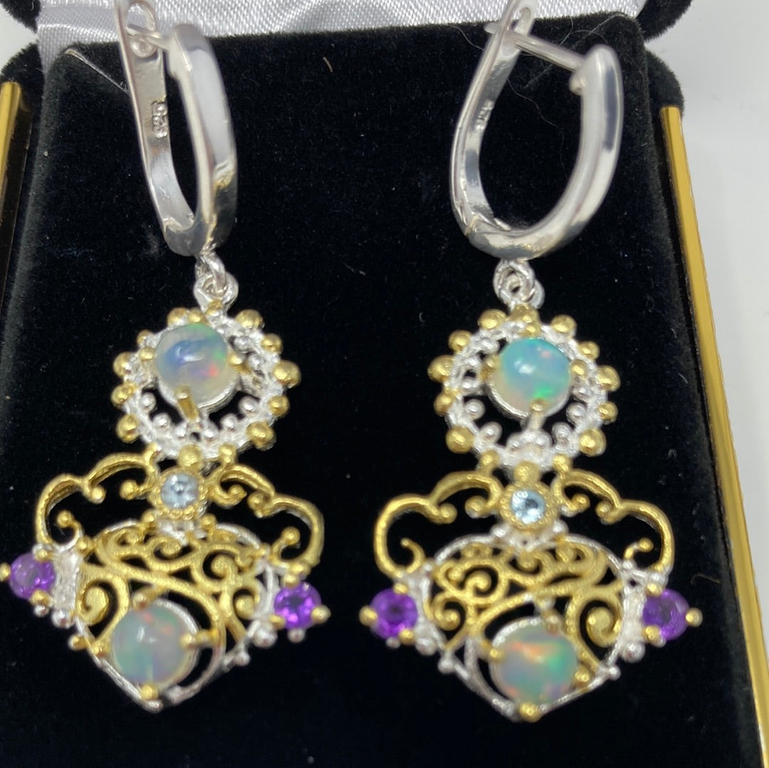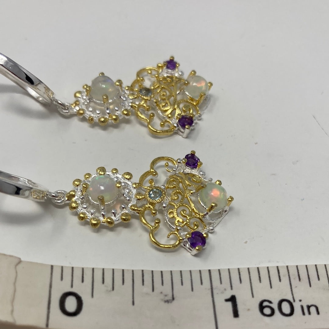 Exquisite Genuine Fiery Opal Dangles that frame your face with light and luminescence. These earrings will be treasured for years to come. Notice the genuine Fiery Opals accented with rich purple genuine Amethysts. Set in .925 sterling silver an embellished filigree with a white and yellow gold overlay. Custom made, one of a kind, approximately 1”long.