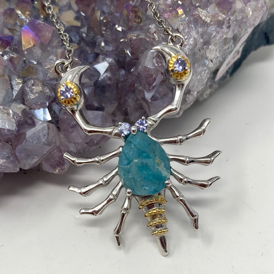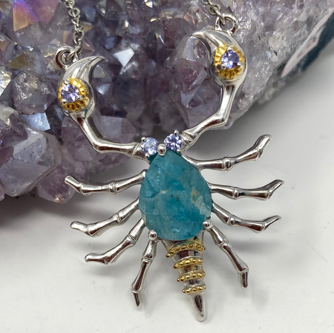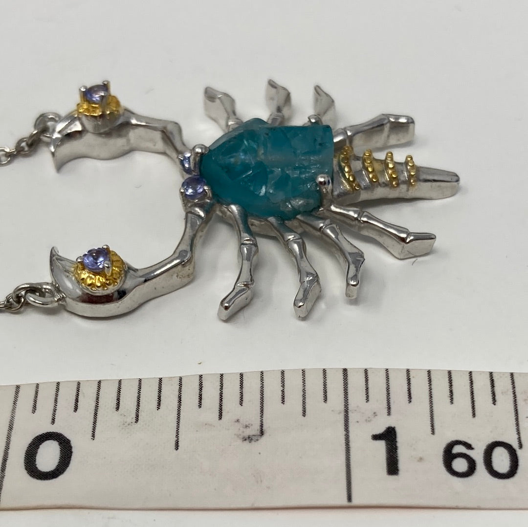 Exquisitely detailed special Scorpion pendant accented with tiny Tanzanite. This is intricately crafted in .925 sterling silver accented with yellow gold. This is a nice specimen of natural fluorite in its raw, uncut, unpolished state. A work of art to wear. Approximately 1 1/2” long pendant on 18” chain