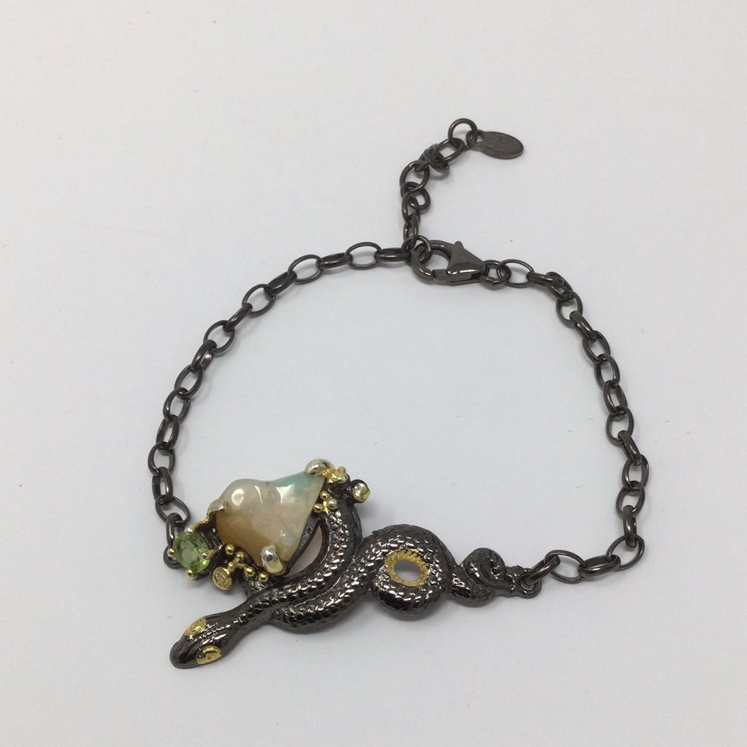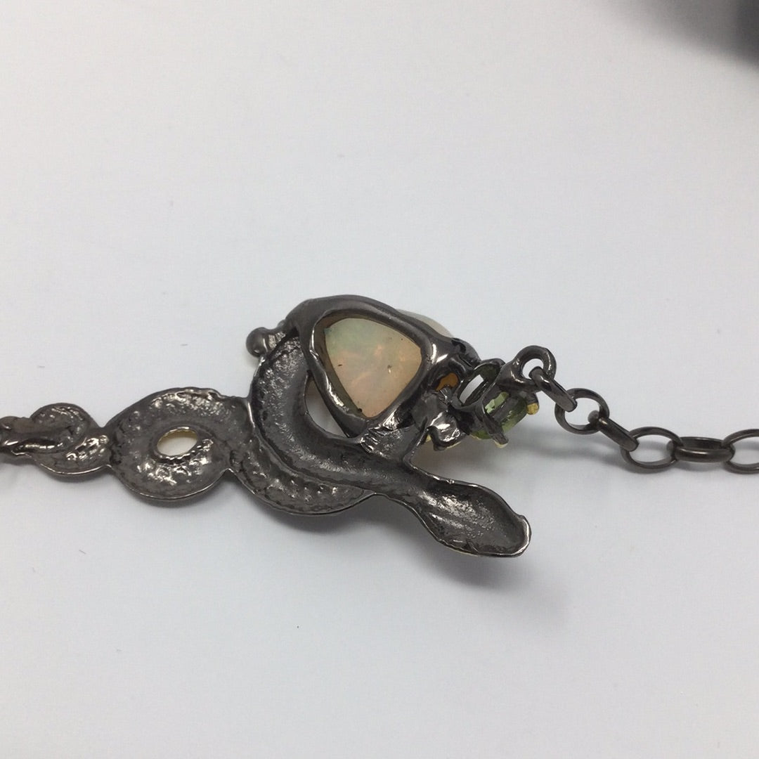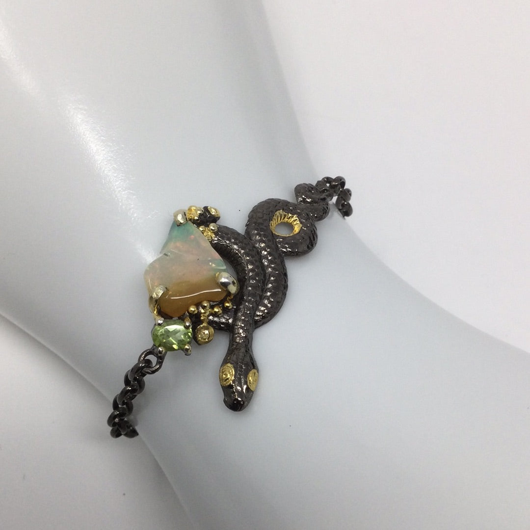 This is a hand crafted , one if a kind, unusual snake bracelets consisted with a genuine, natural free form Opal with a genuine Peridot. It one you’ll want to wear as an artistic statement, Notice the surrealistic glow of this magnificent Opal set in .925 sterling silver with a rhodium overlay for durability and beauty. Also check out the fine details incorporated in this design. 7” long and adjusts to fit.