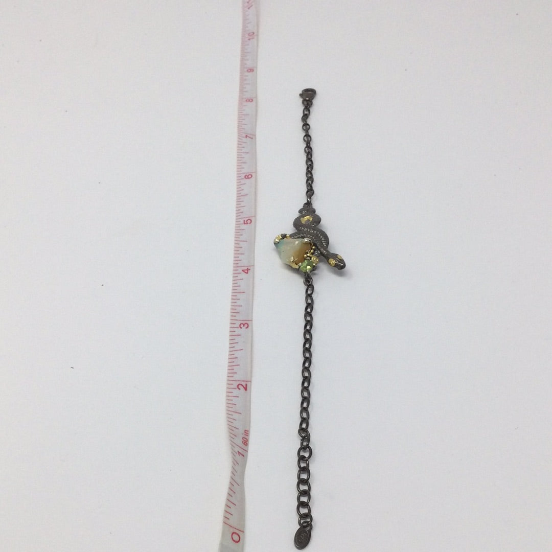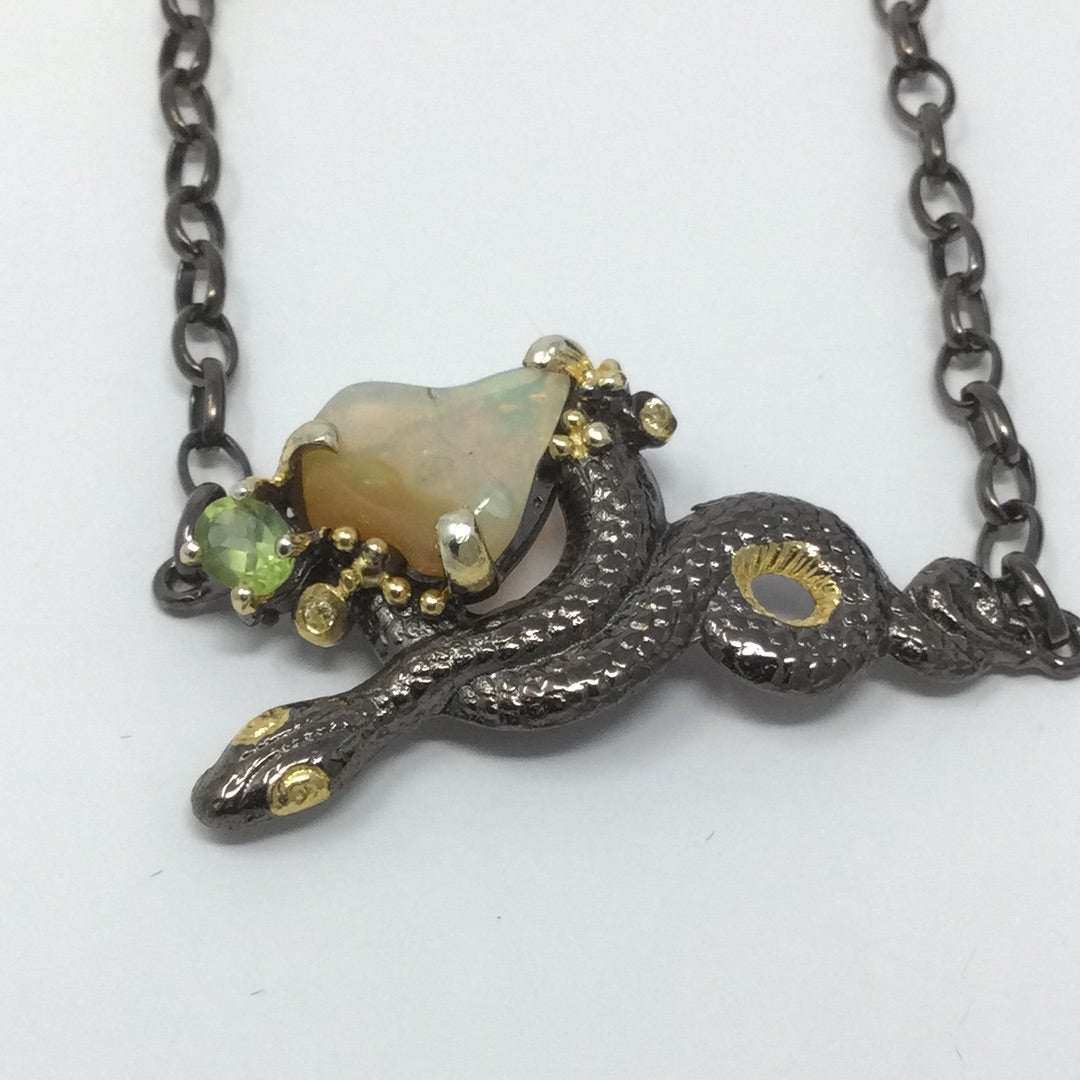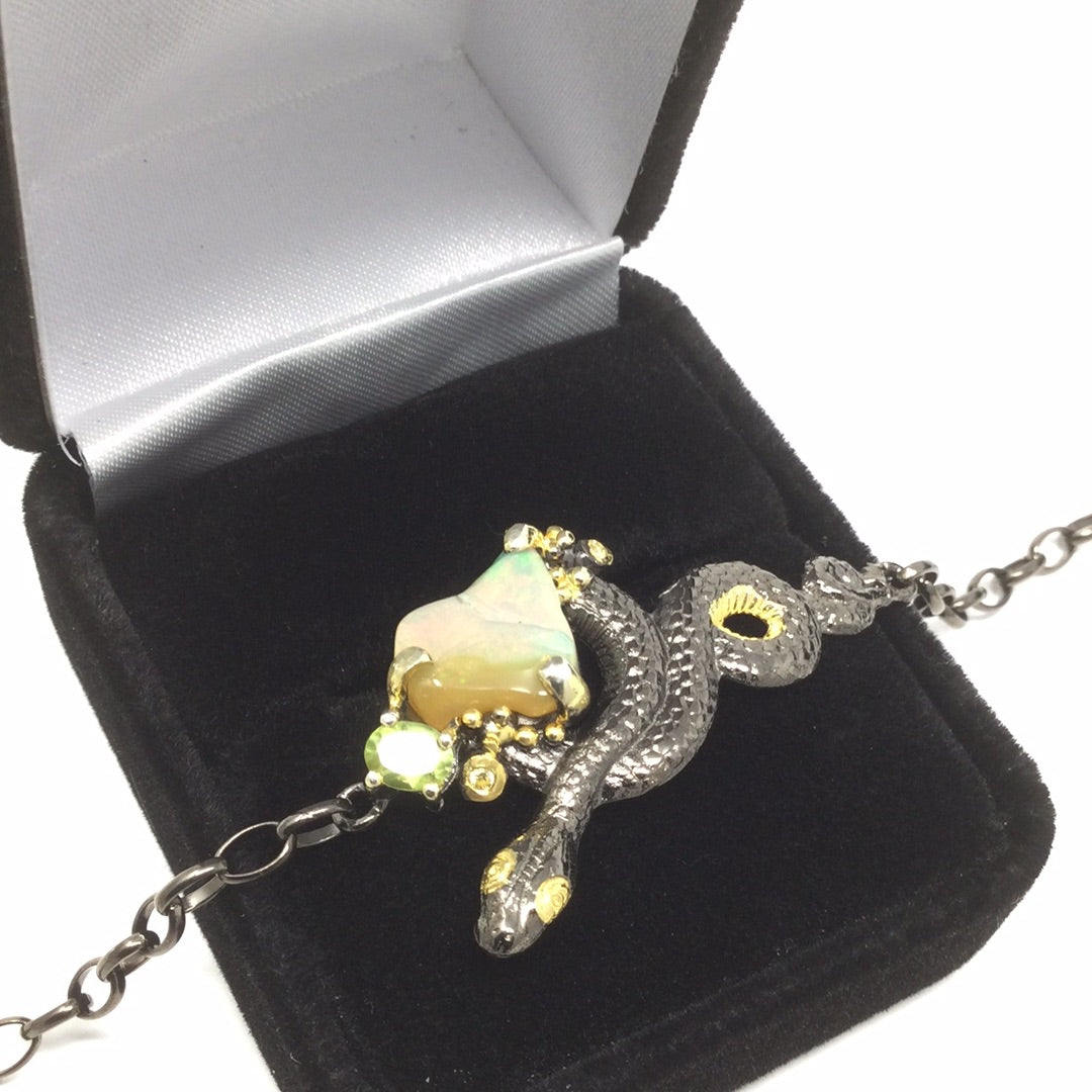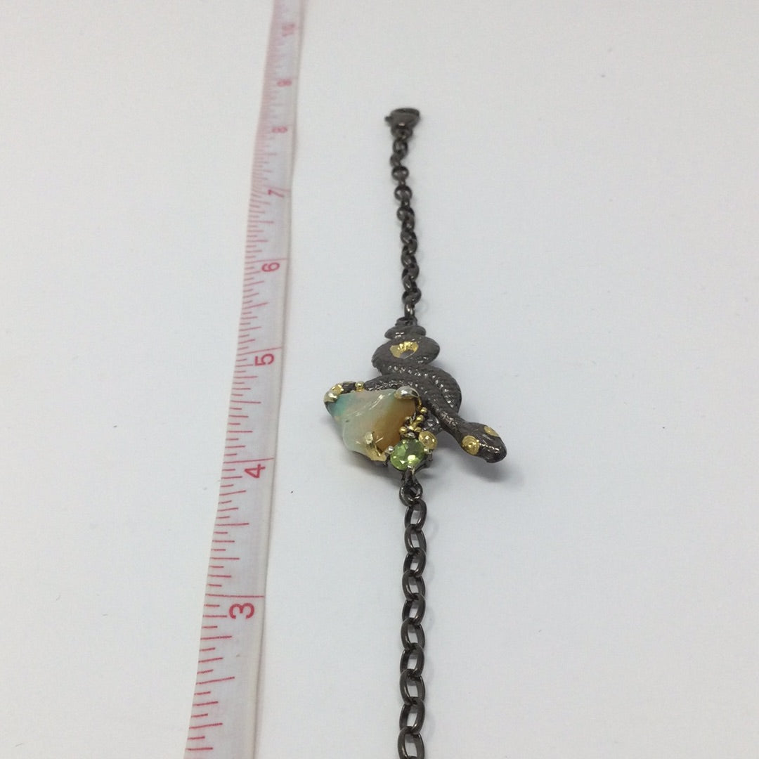 This is a hand crafted , one if a kind, unusual snake bracelets consisted with a genuine, natural free form Opal with a genuine Peridot. It one you’ll want to wear as an artistic statement, Notice the surrealistic glow of this magnificent Opal set in .925 sterling silver with a rhodium overlay for durability and beauty. Also check out the fine details incorporated in this design. 7” long and adjusts to fit.