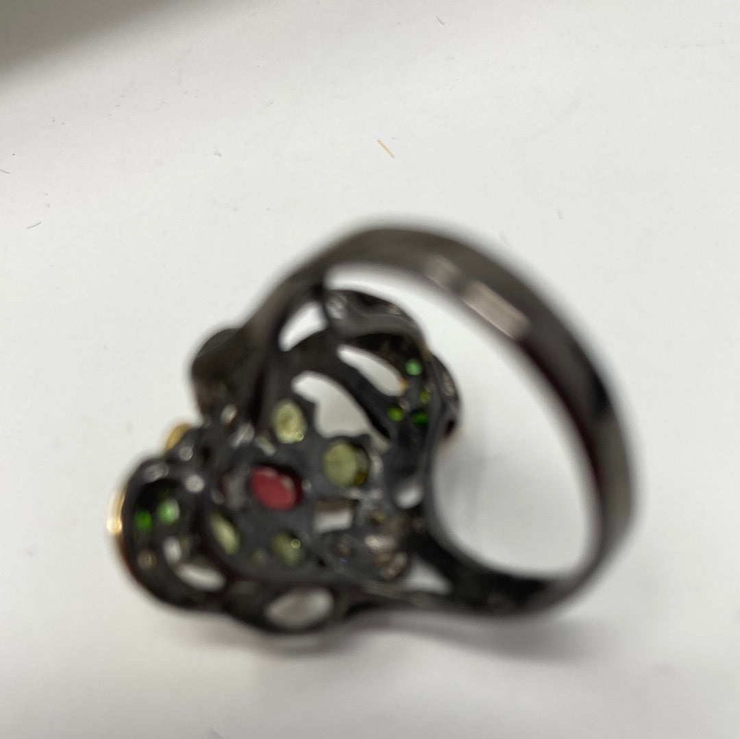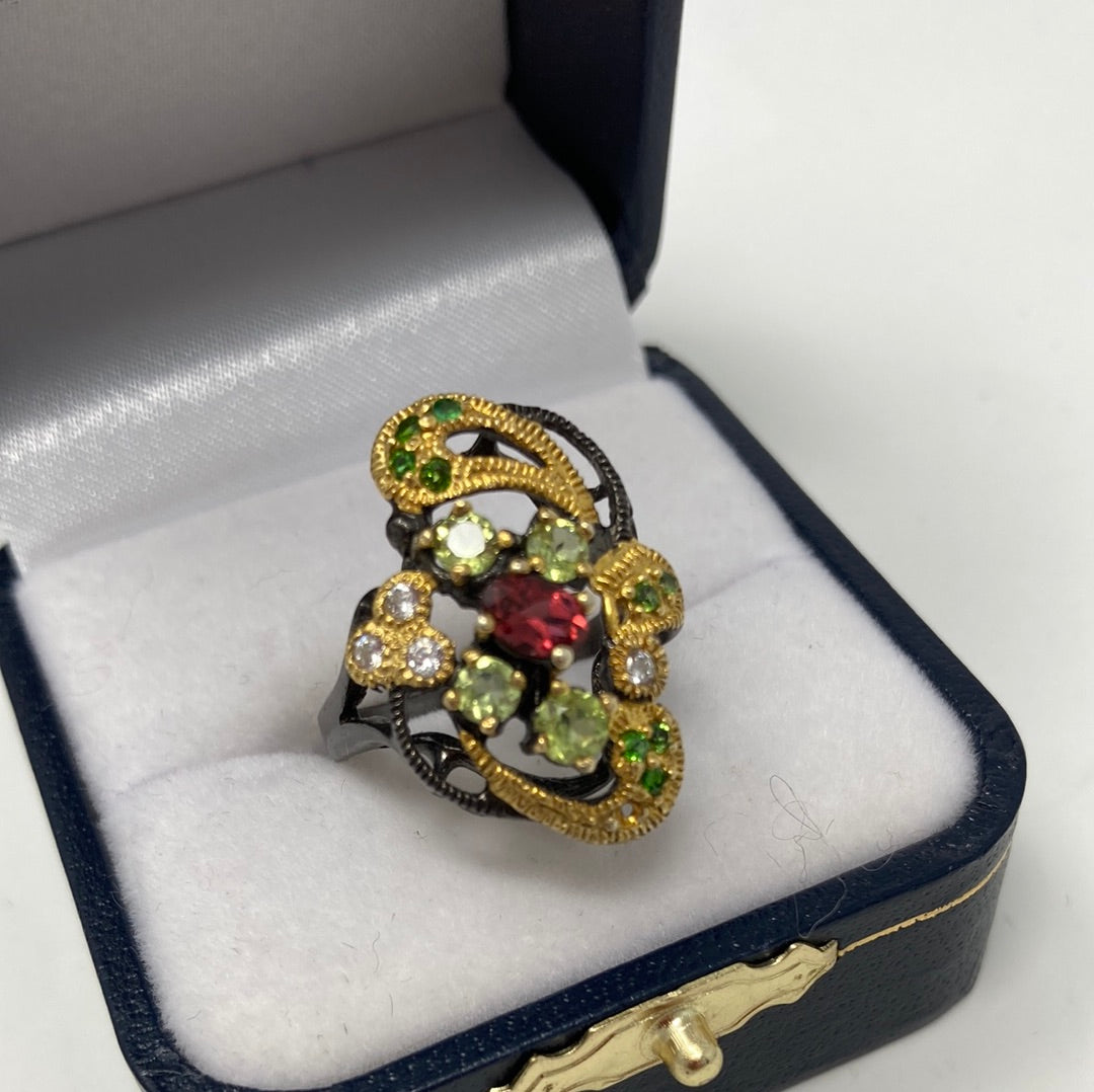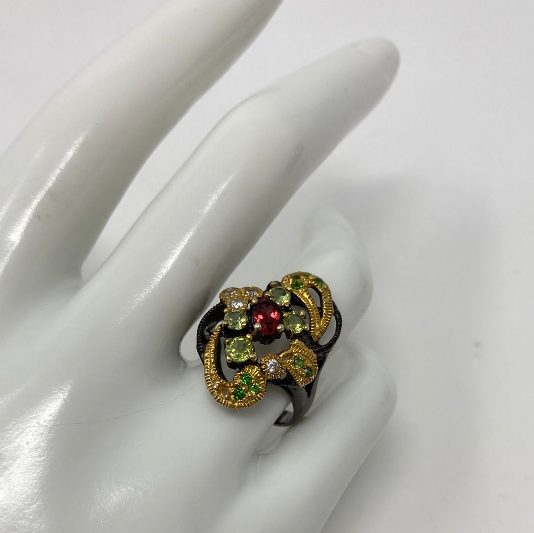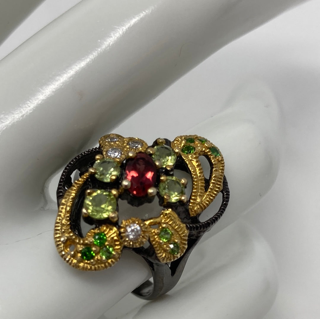 A exceptional, one of a kind, custom made ring featuring a genuine Garnet with Peridots in this unusual artistic setting. It is crafted in all .925 sterling silver with a unique Rhodium overlay, embellished with yellow gold. The important fact you should realize it that my curated collection is not mass produced jewelry. I lean toward buying the best you can afford in an artistic forever piece. Future family heirlooms to be cherished for future generations. Size 7, Resize at your jeweler.