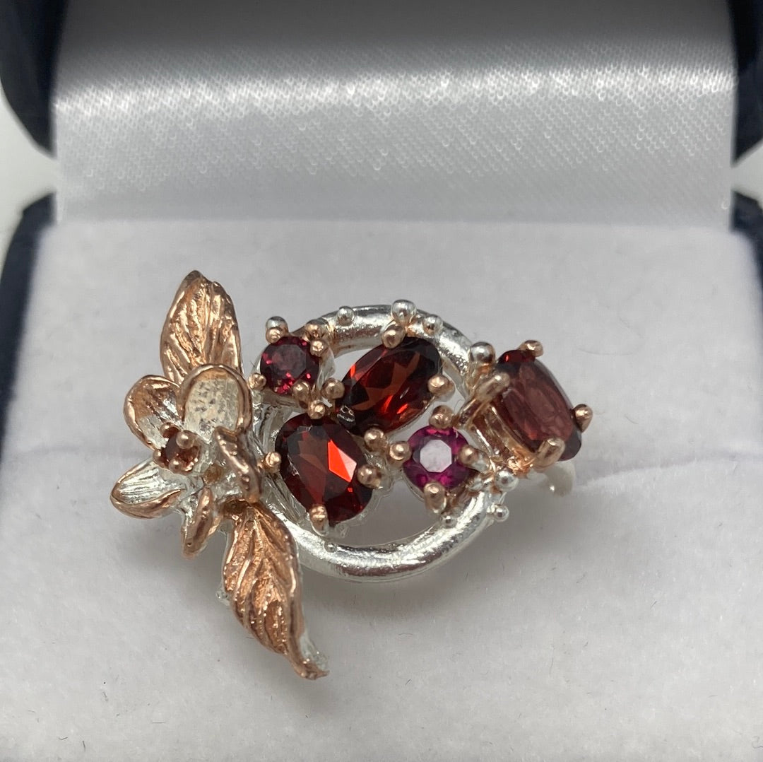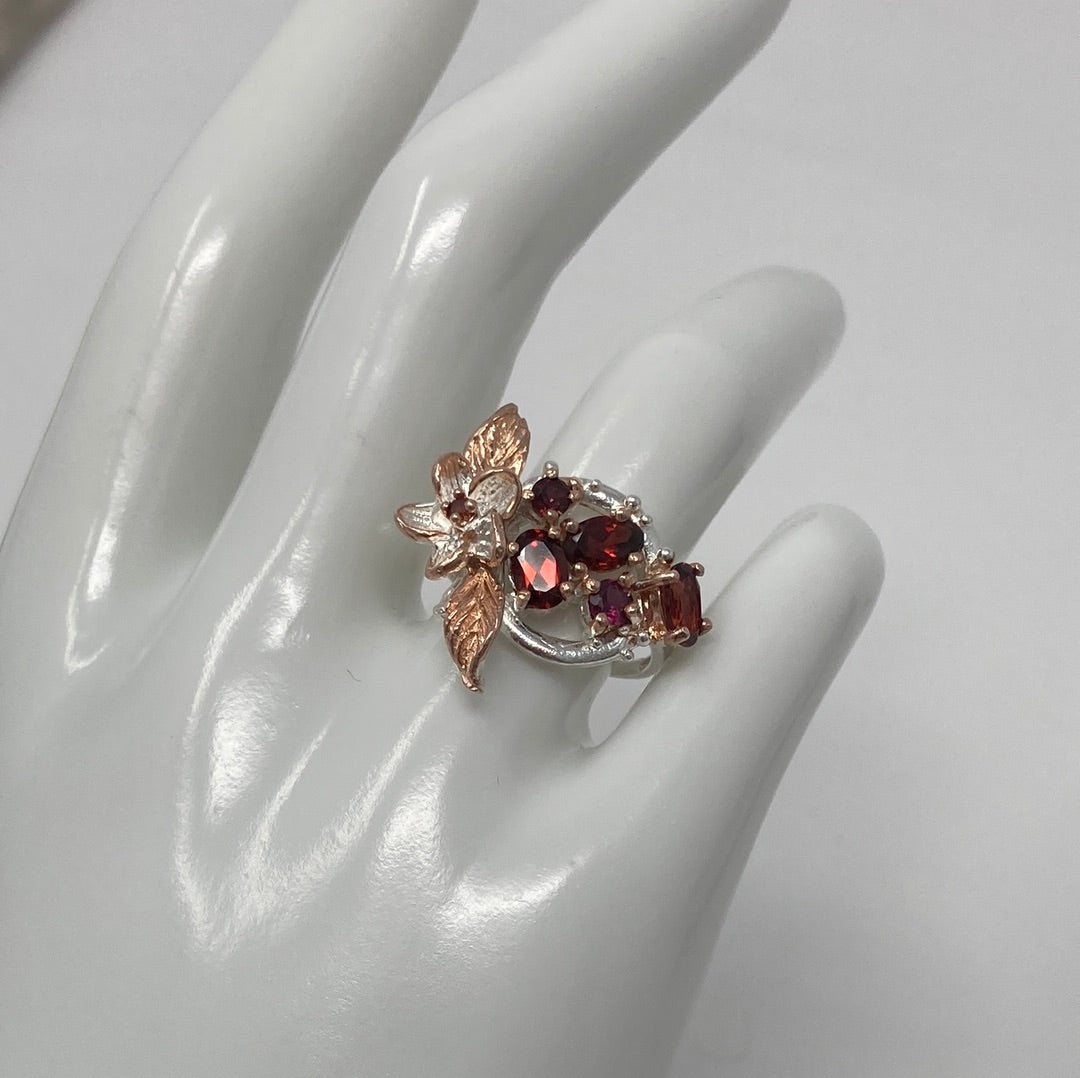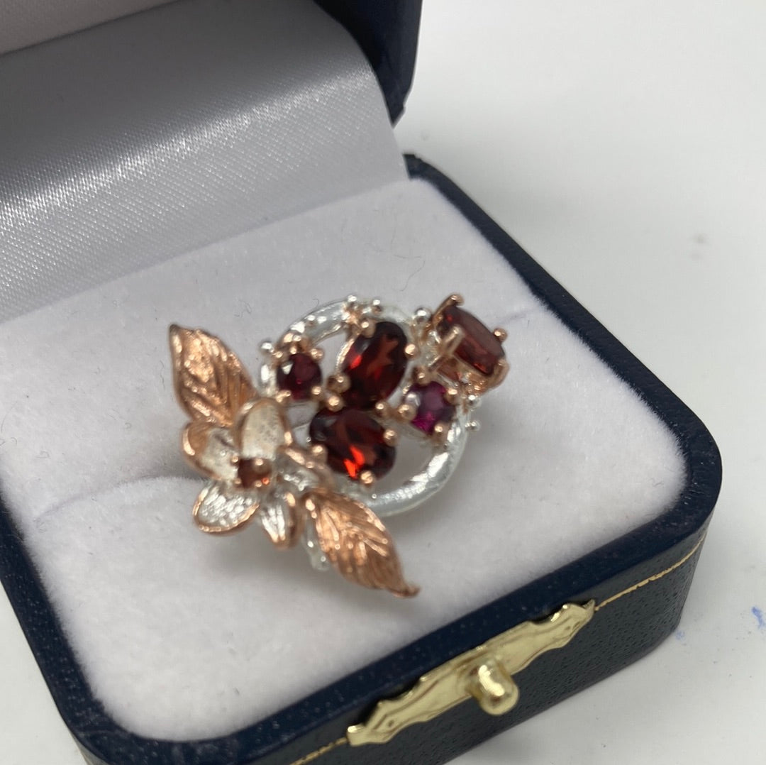 Exquisite, genuine 6mm by 4mm Garnets, super high quality, notice the rich color. The setting is a work of art to embrace these special gemstones, set in .925 with a Rose Gold overlay. Just a sigh of beauty that reminds us of the beauty in nature. This is a custom made ring, not mass produced. Size 7, Resize at your jeweler or use a ring guard.