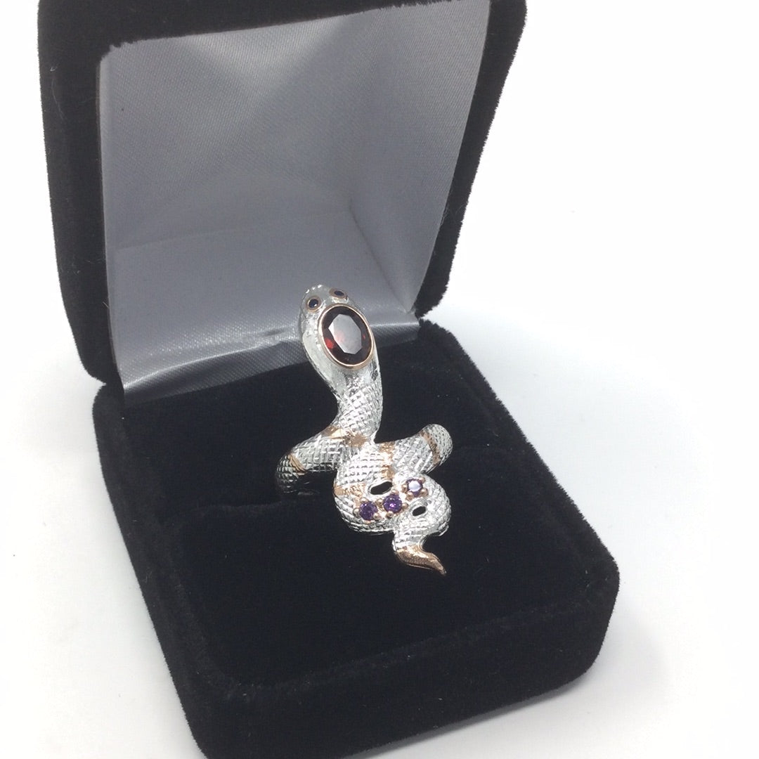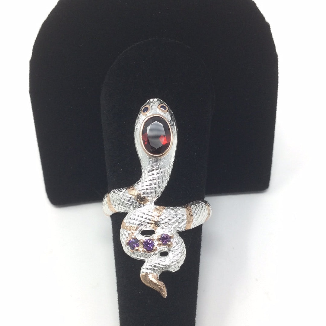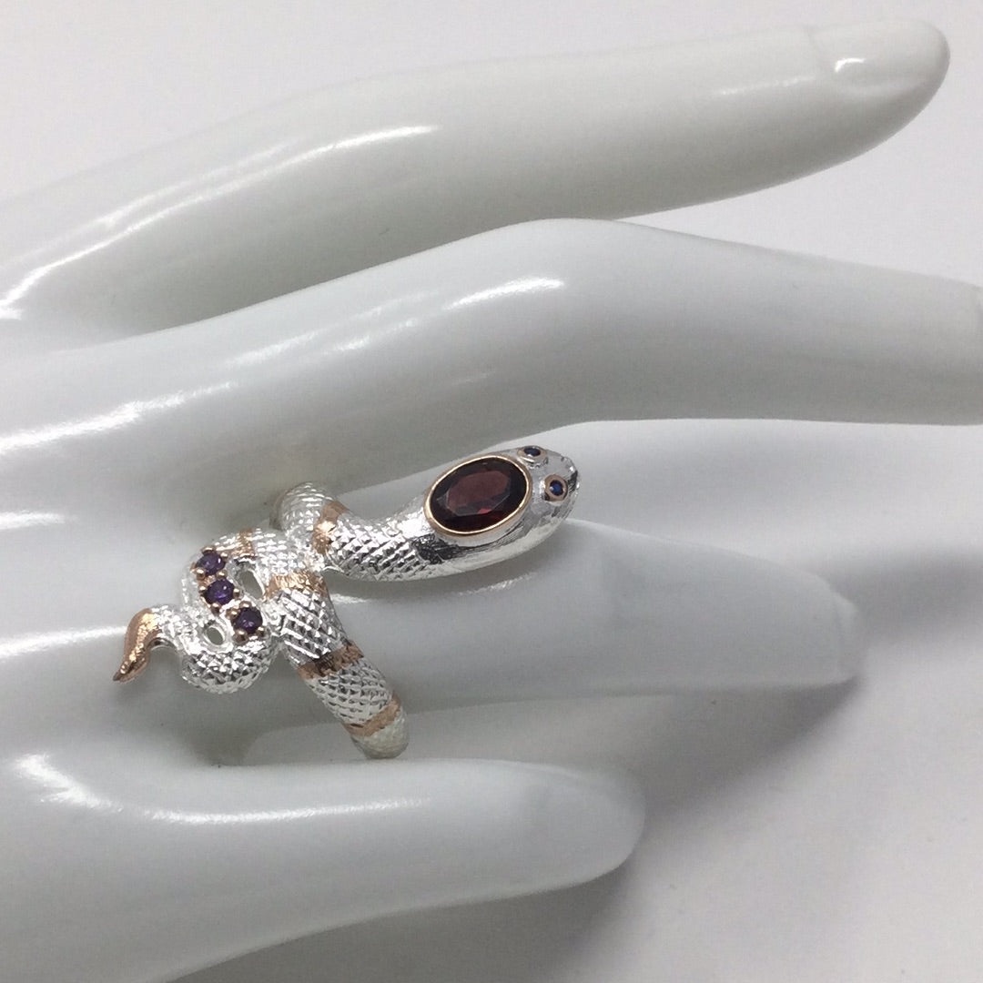 A special thrill, a artistic reptile to call your own and name home too, possibly Jake the Snake. All intricately crafted in ..925 sterling silver with a 14K white gold overlay with accents of Rose Gold. All genuine, Mozambique Garnet measures 7mm by 5mm, accented with genuine Amethysts too. This is a custom creation inset with genuine gemstones. You’ll have lots of fun playing with your favorite viper. Size 8, Resize at your jeweler.