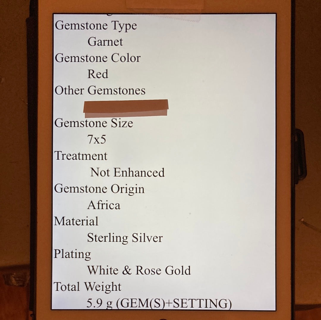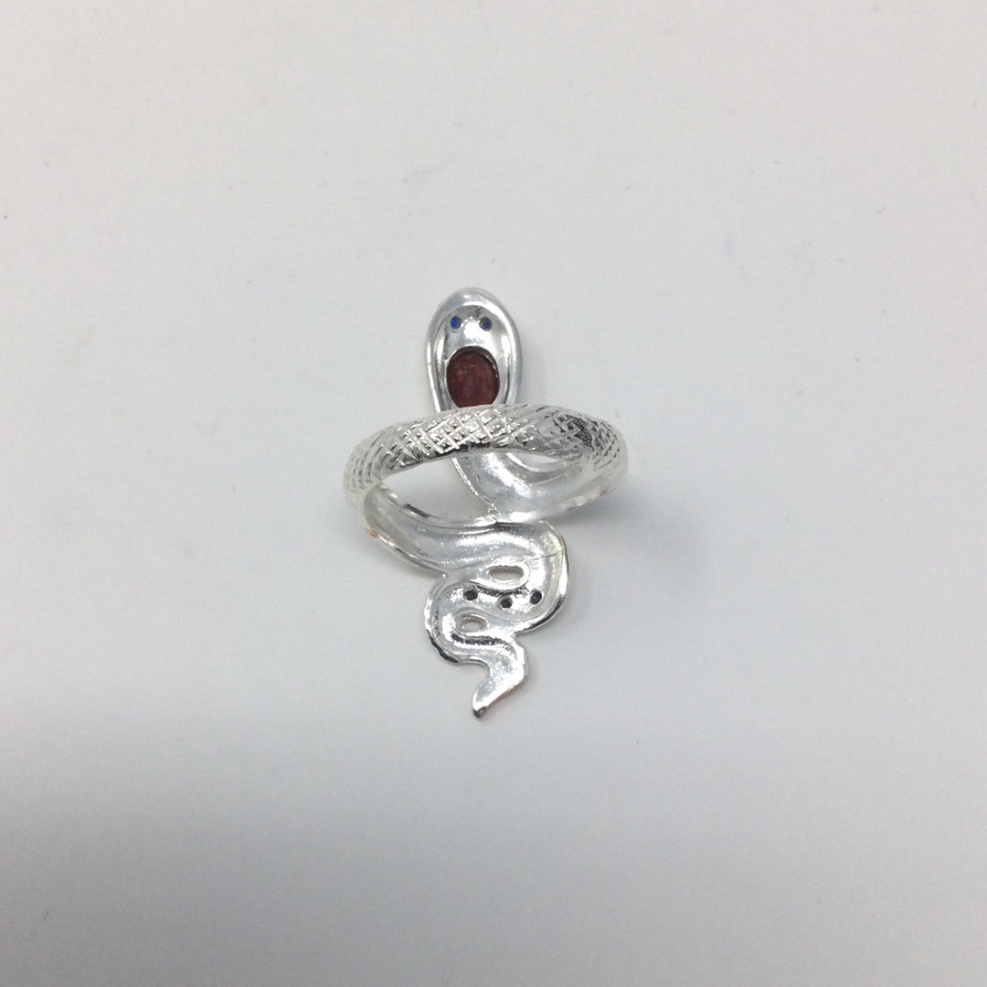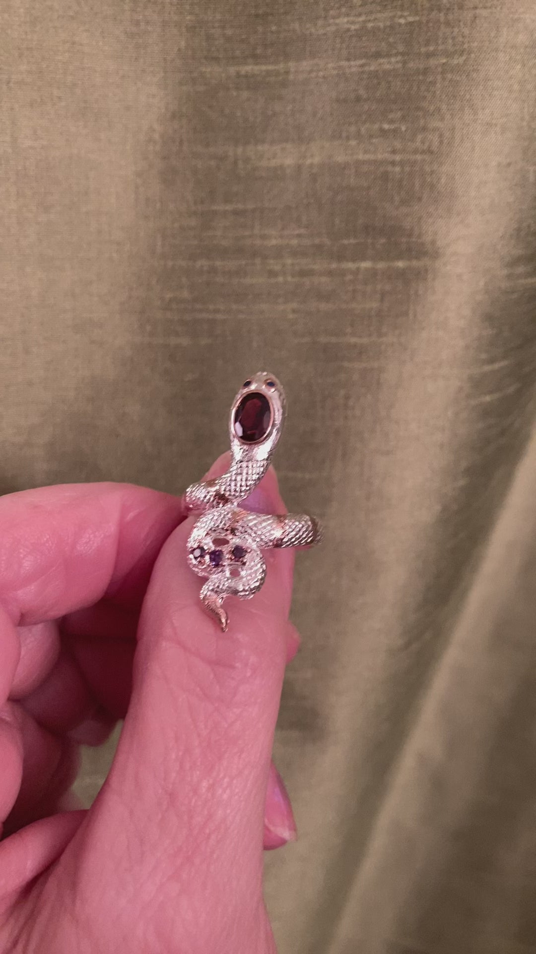 A special thrill, a artistic reptile to call your own and name home too, possibly Jake the Snake. All intricately crafted in ..925 sterling silver with a 14K white gold overlay with accents of Rose Gold. All genuine, Mozambique Garnet measures 7mm by 5mm, accented with genuine Amethysts too. This is a custom creation inset with genuine gemstones. You’ll have lots of fun playing with your favorite viper. Size 8, Resize at your jeweler.