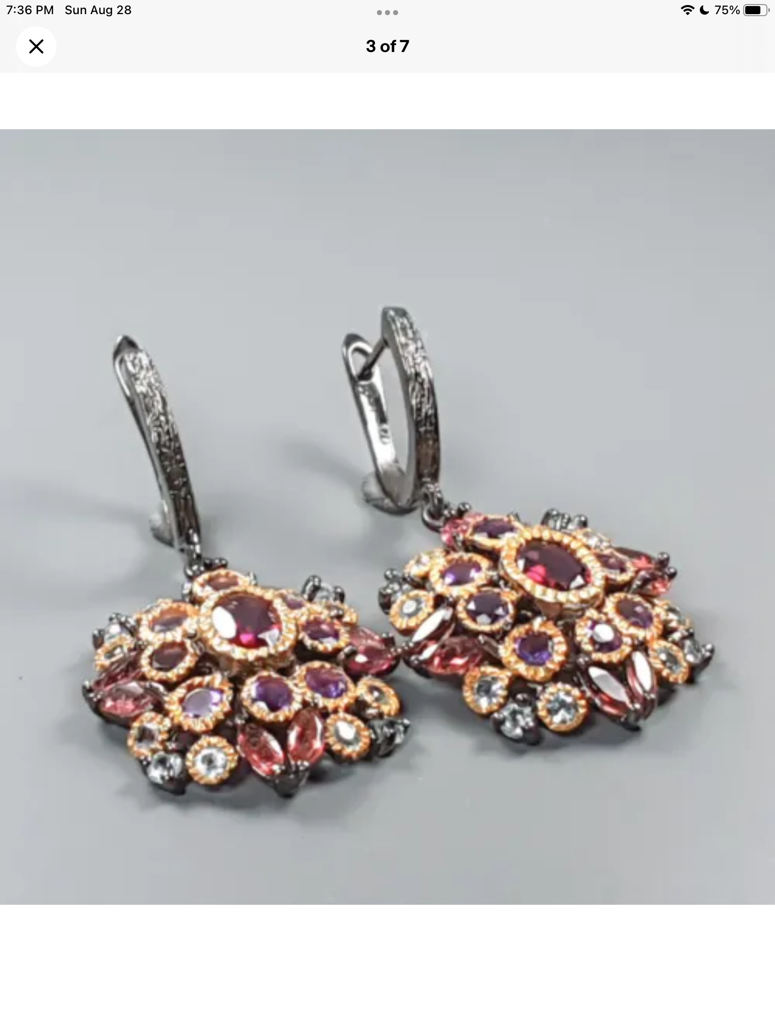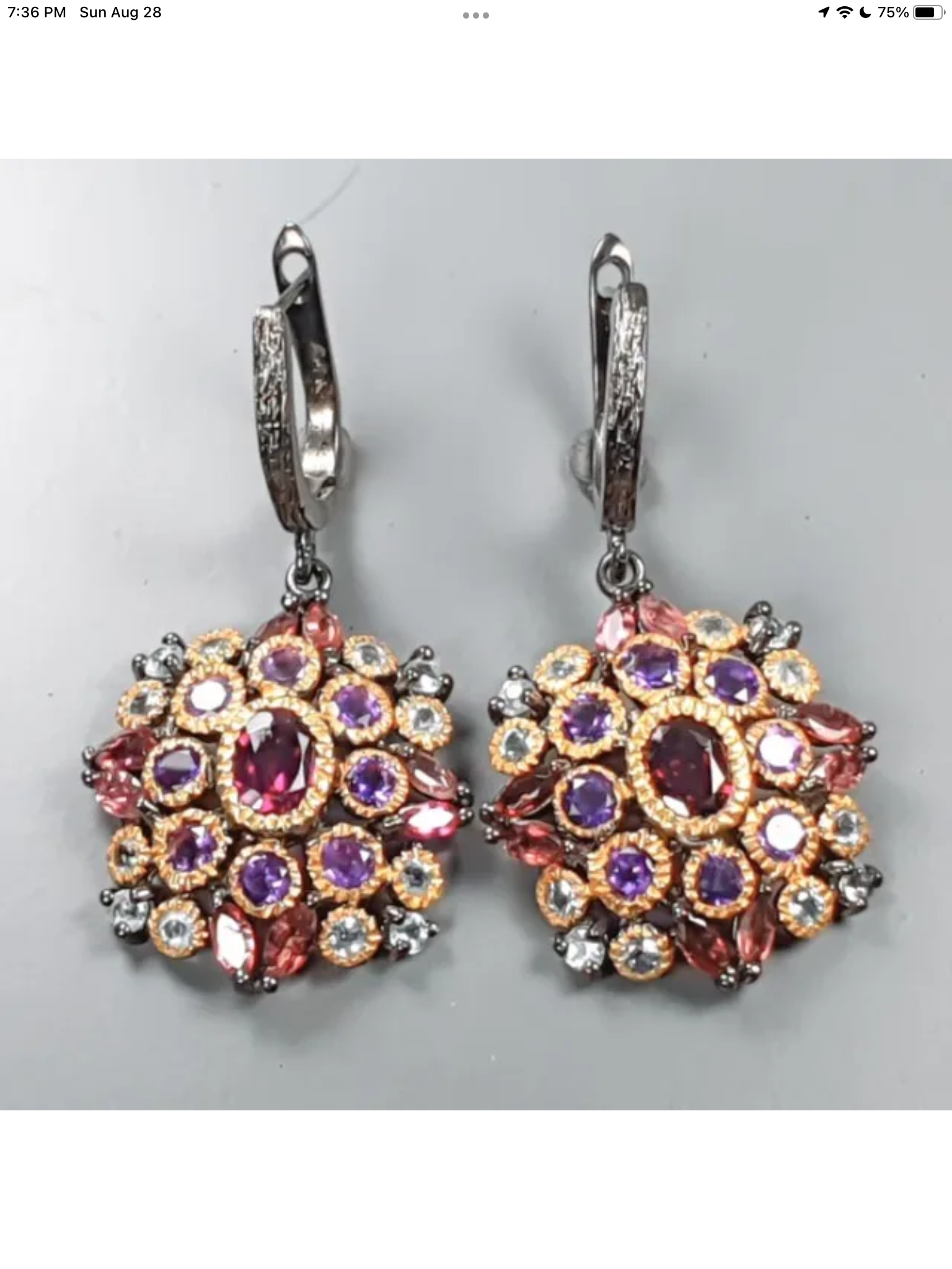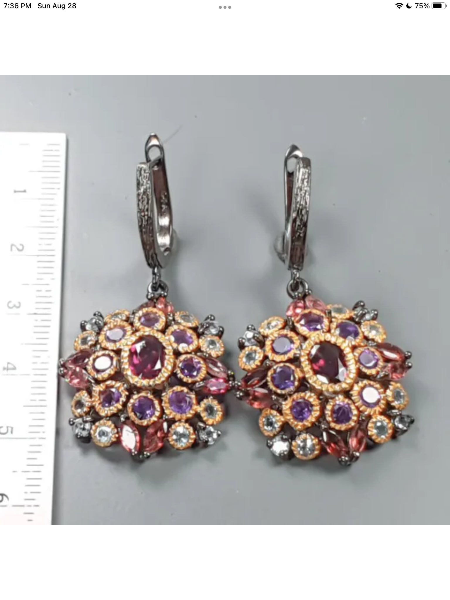 Stunning earrings featuring genuine Rhodolite Garnets, encrusted with Amethysts and sprinkled with Blue Topaz. A gorgeous hi end look, a treasure trove of genuine gemstones, a investment for several lifetimes to come. A luxurious way to frame your face in luminescent jewels. Bejeweled stars, like you. Set in .925 with a Rhodium overlay accented with 14 K yellow gold.