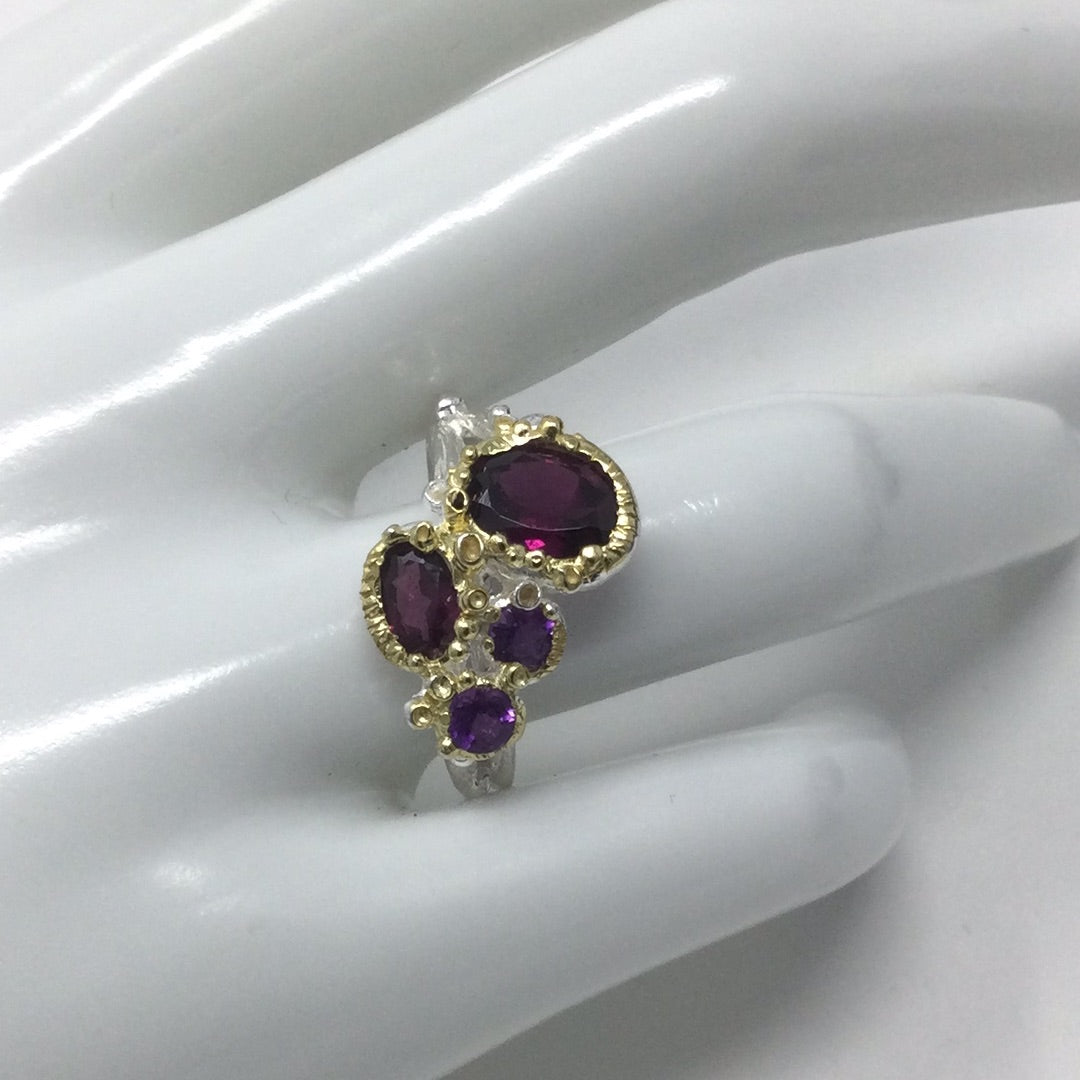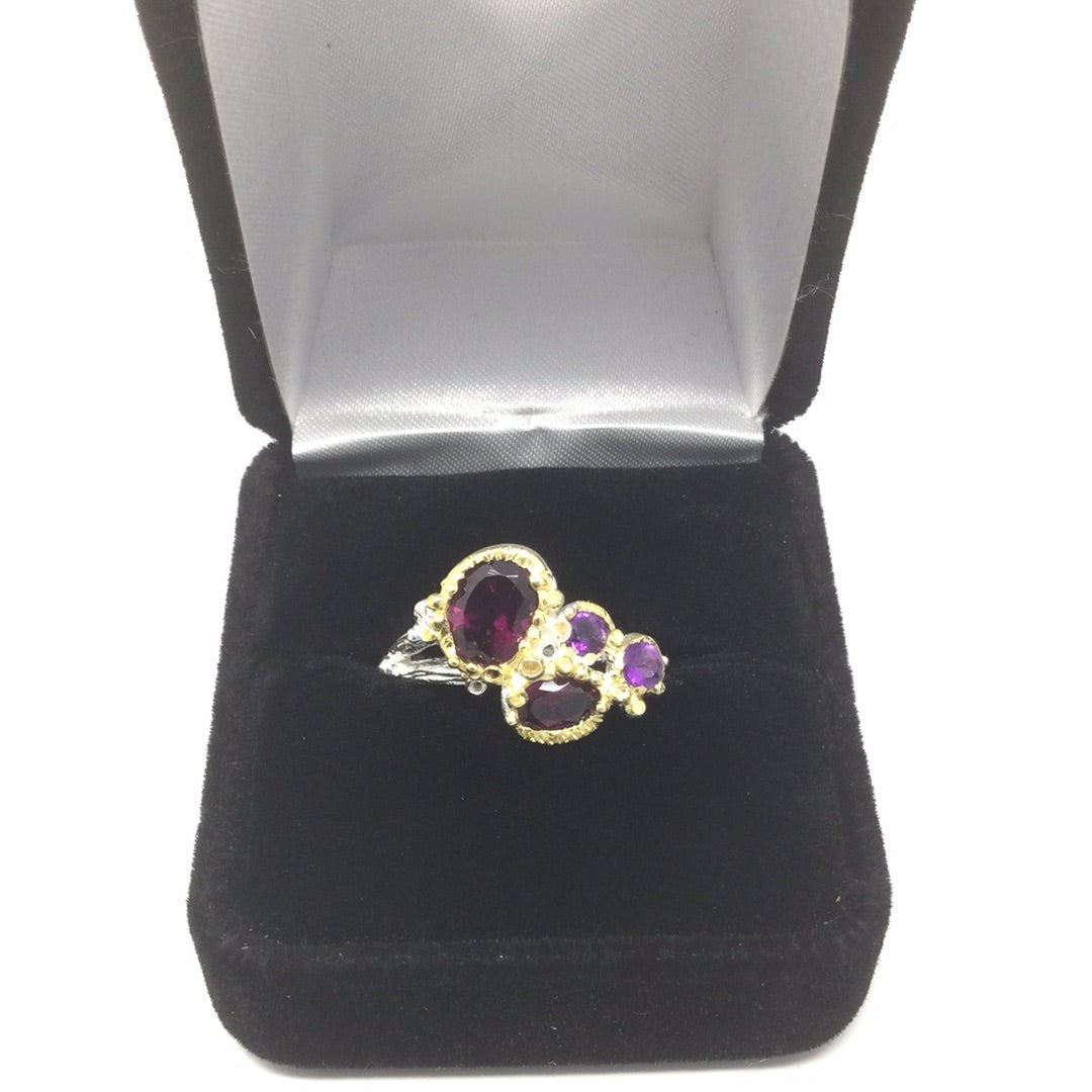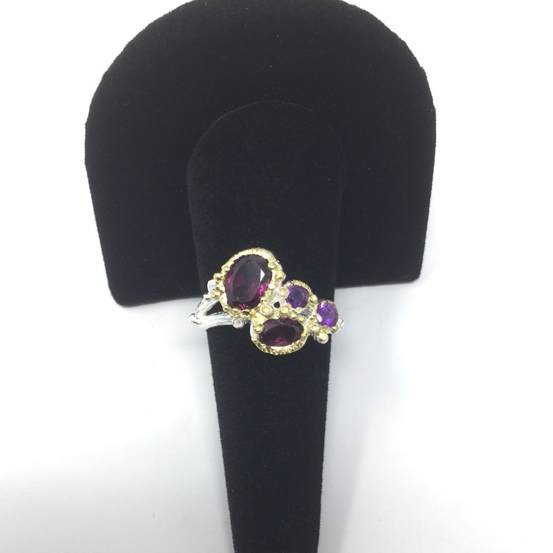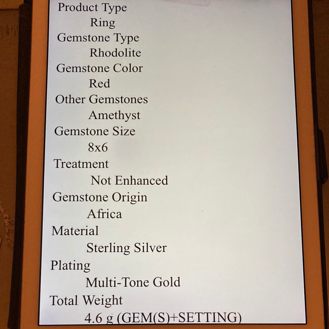 This is a sweet, edgy artistic ring with a contemporary flair. Featuring genuine Rhodolite Garnets accented with Brazilian Amethyst. Set in .925 sterling silver and notice the attention to details, overlaid in 14K white gold with gems encircled in yellow gold. A beautiful contrast in gemstones and metals. Size 8, Resize at your jeweler or use ring guard.