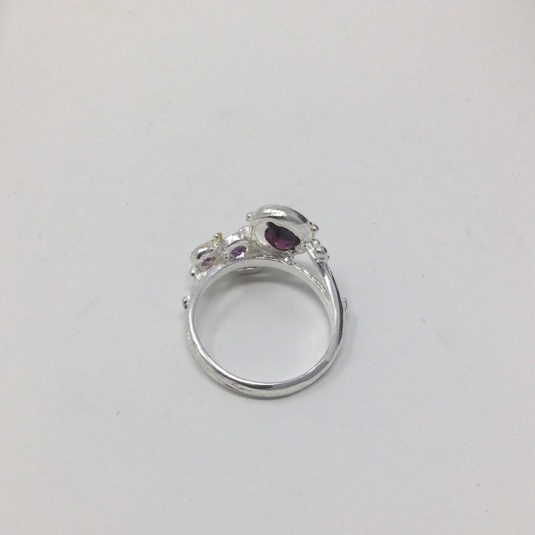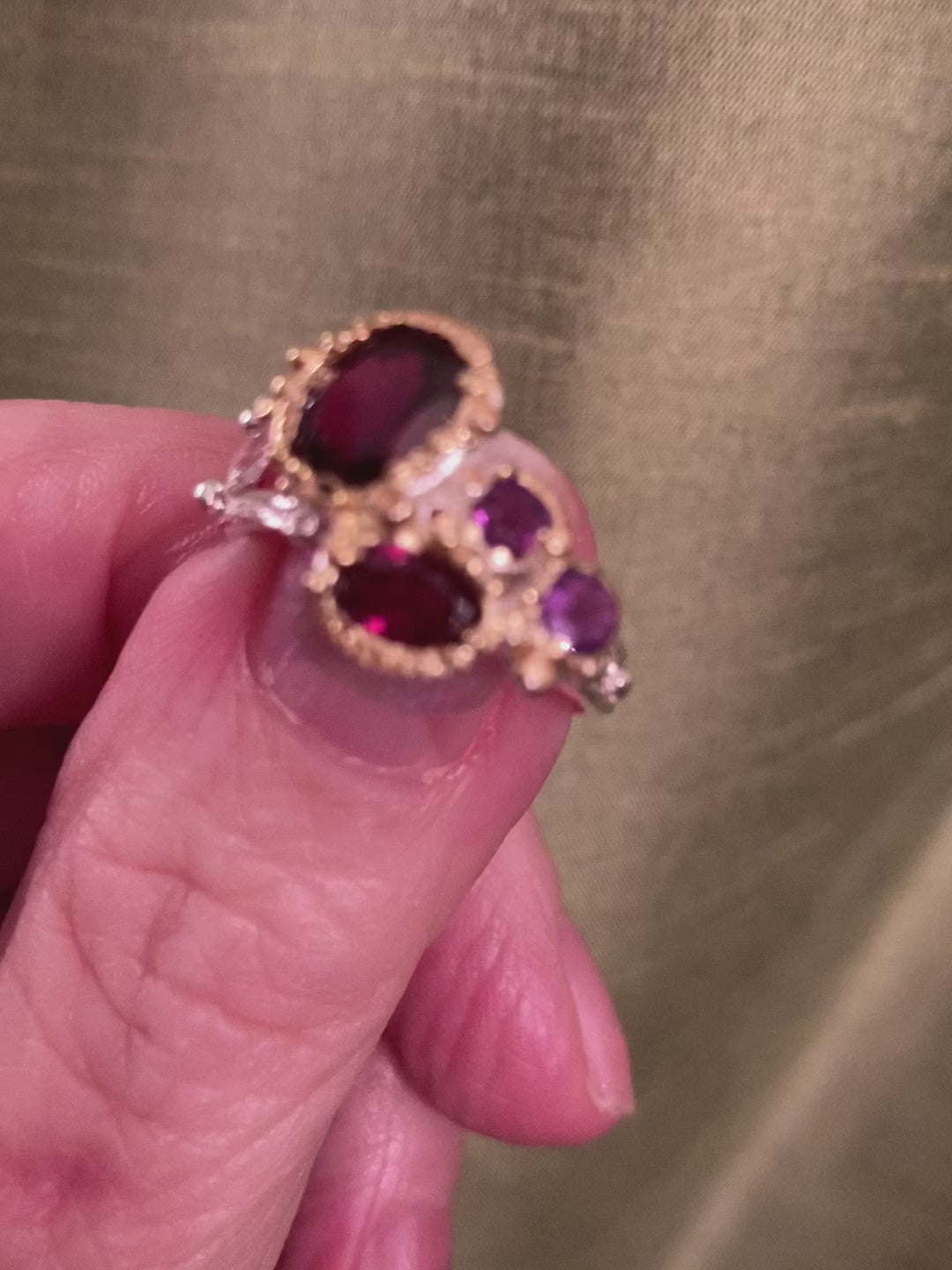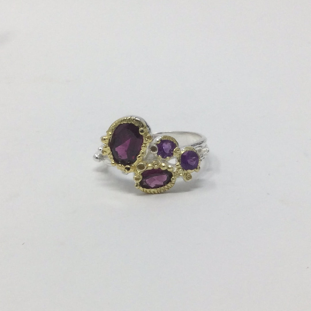 This is a sweet, edgy artistic ring with a contemporary flair. Featuring genuine Rhodolite Garnets accented with Brazilian Amethyst. Set in .925 sterling silver and notice the attention to details, overlaid in 14K white gold with gems encircled in yellow gold. A beautiful contrast in gemstones and metals. Size 8, Resize at your jeweler or use ring guard.