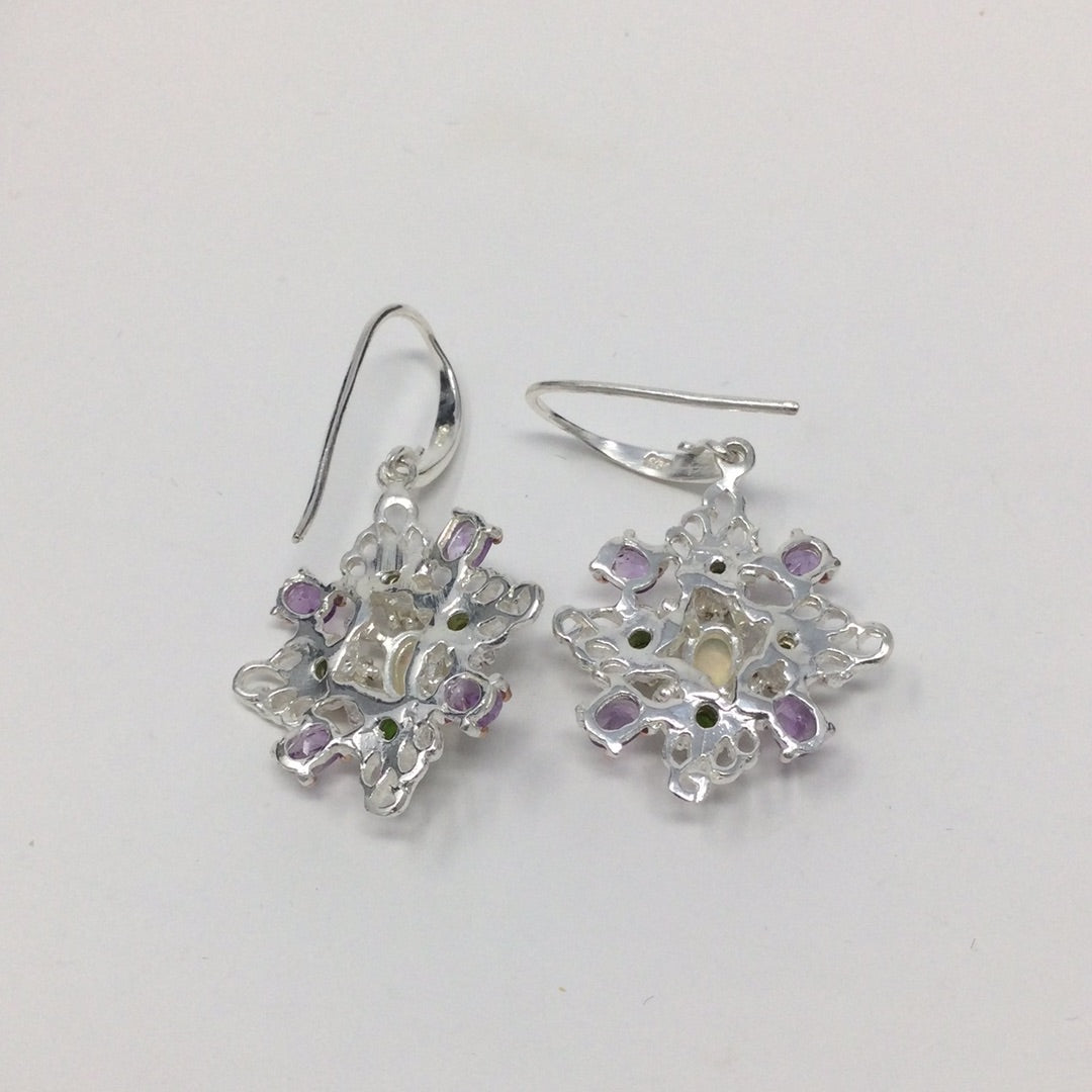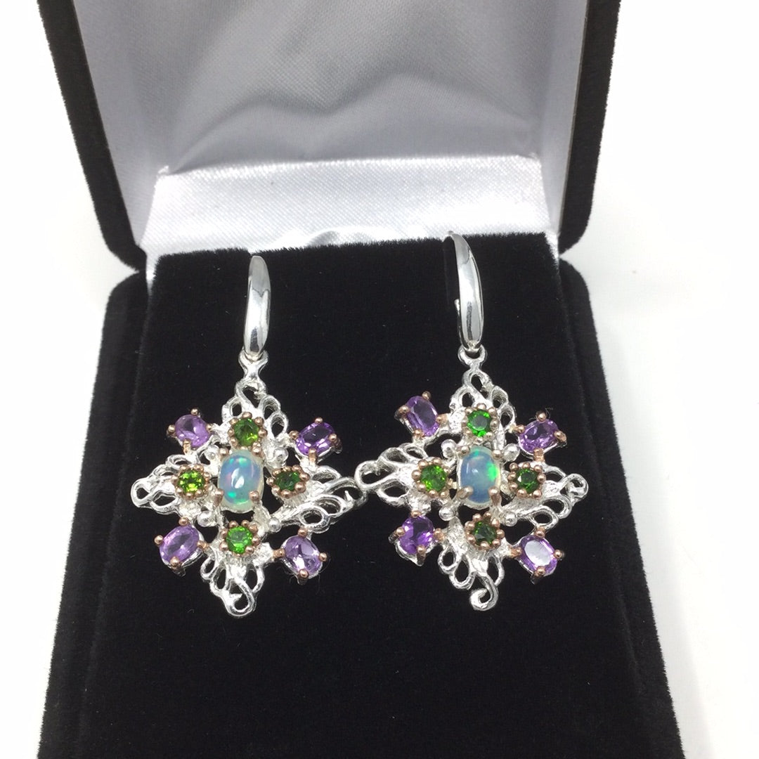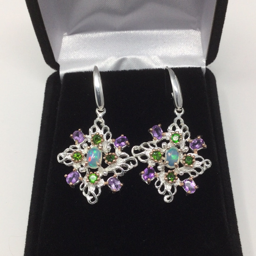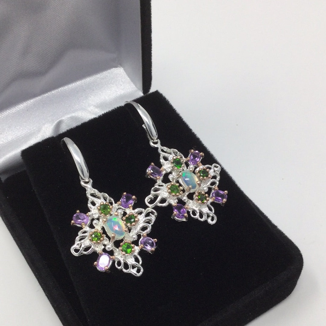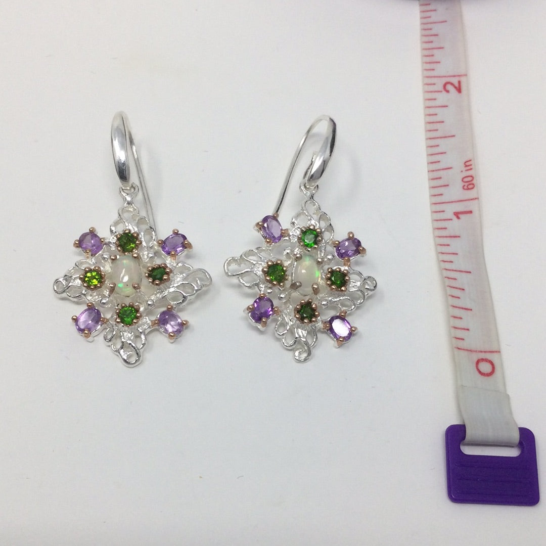 Delightful in this artistic array of genuine gemstones featuring, Genuine Russian Chrome Diopside, Amethysts & Opal. A exciting way to frame your face in these jewel encrusted earring, your face will light with luminescence and your eyes will dazzle. Set in .925 sterling silver, approximately 1” Long.
