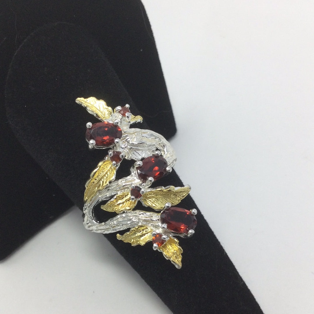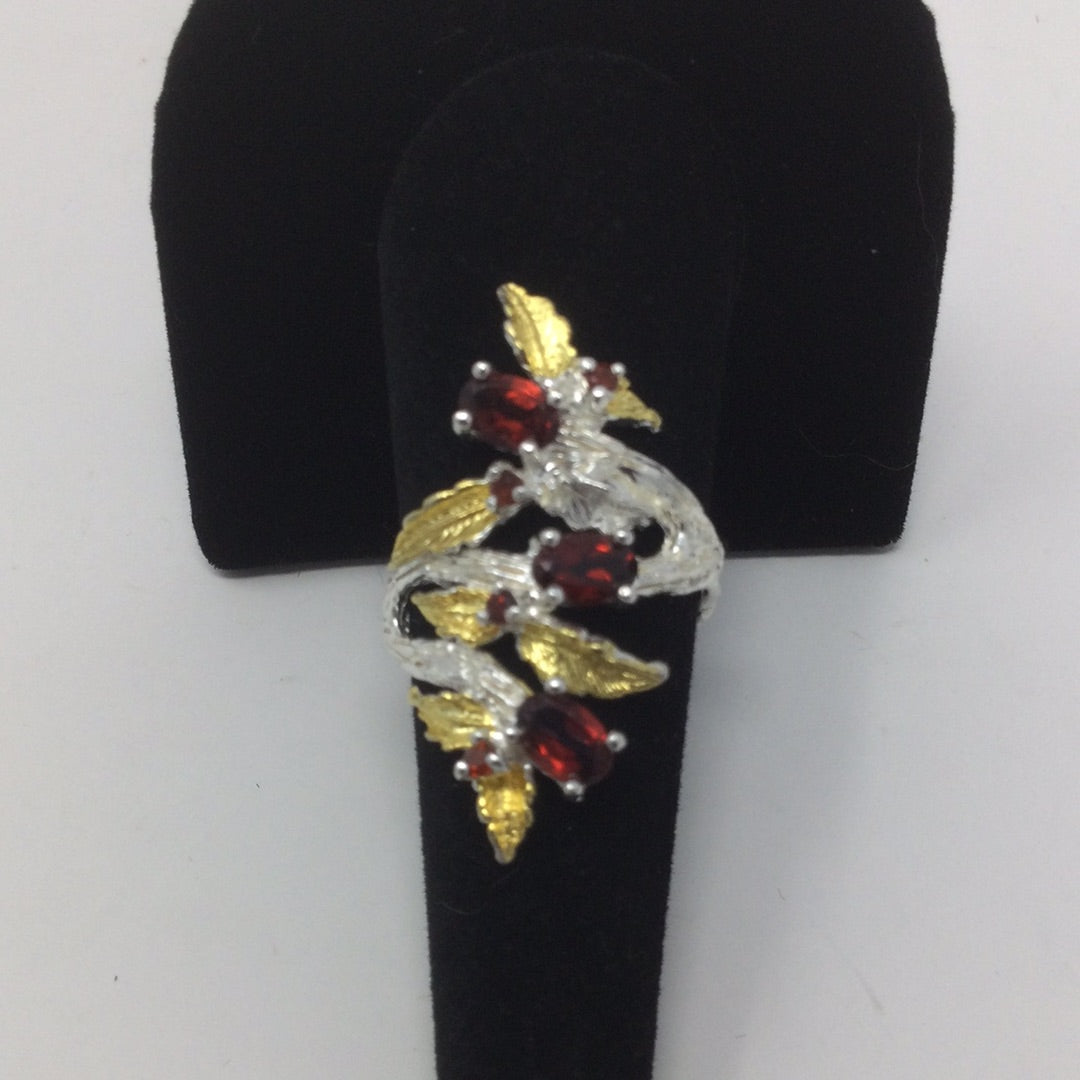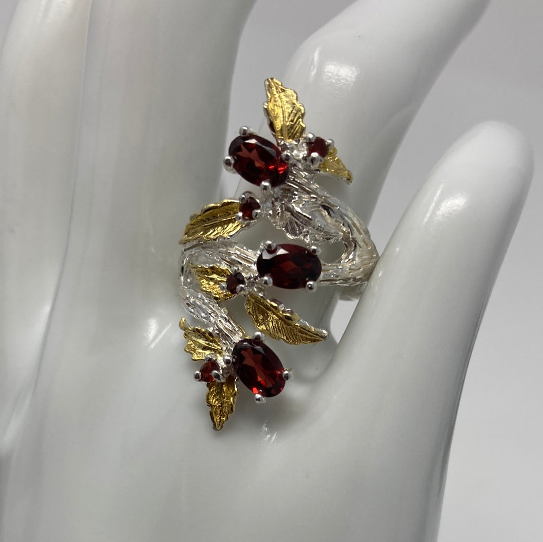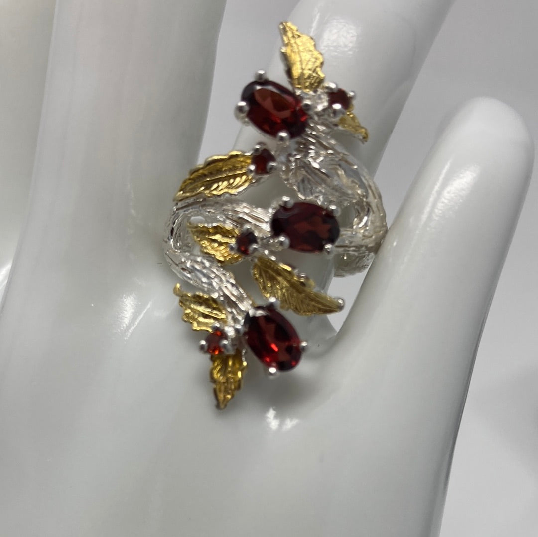 Rich deep red genuine Garnets, 6mm by 4mm in a graceful intricate, artistic setting. The ring seems tho climb up your finger, set in .925 sterling silver with a 14K white and yellow gold overlay. This is a custom made, one of a kind that sets you far apart from mass produced jewelry store inventories. Size 7 1/4, Resize at your jeweler or use a ring guard.