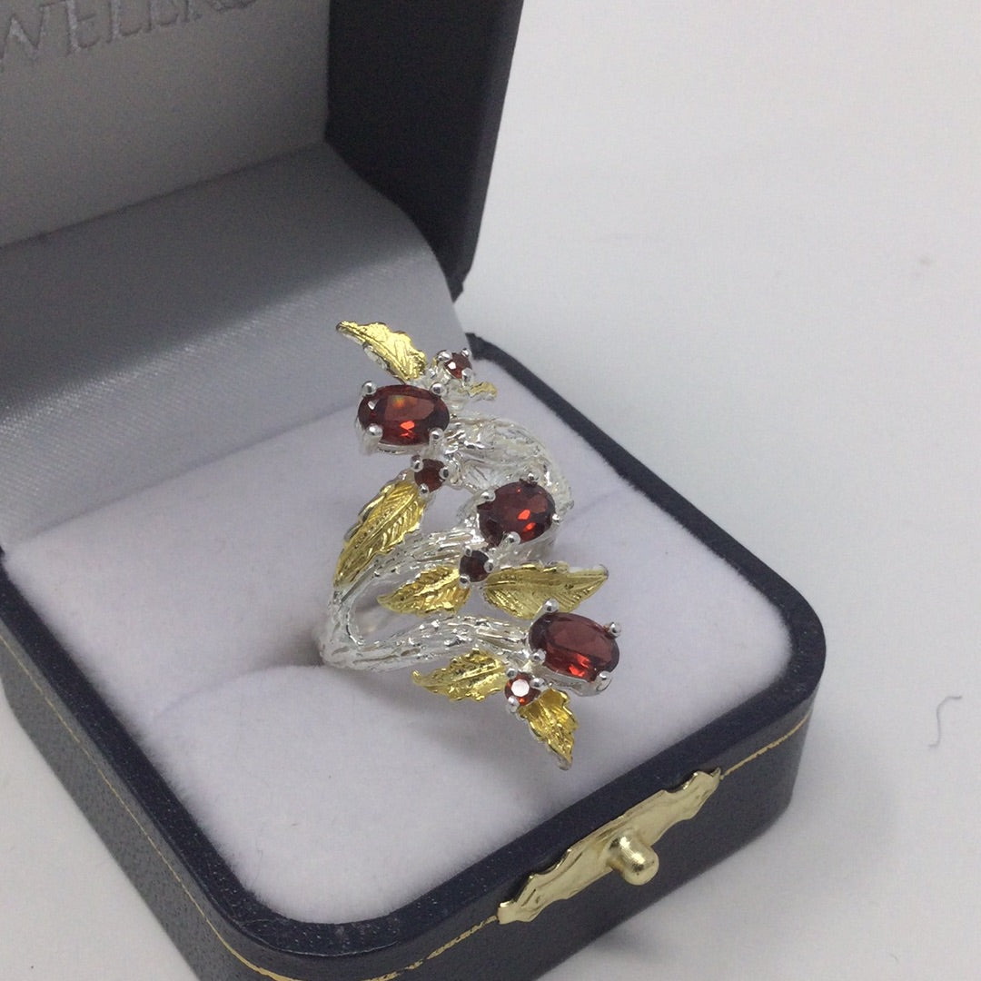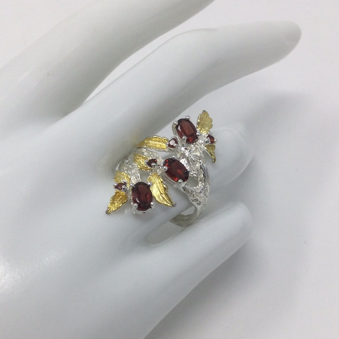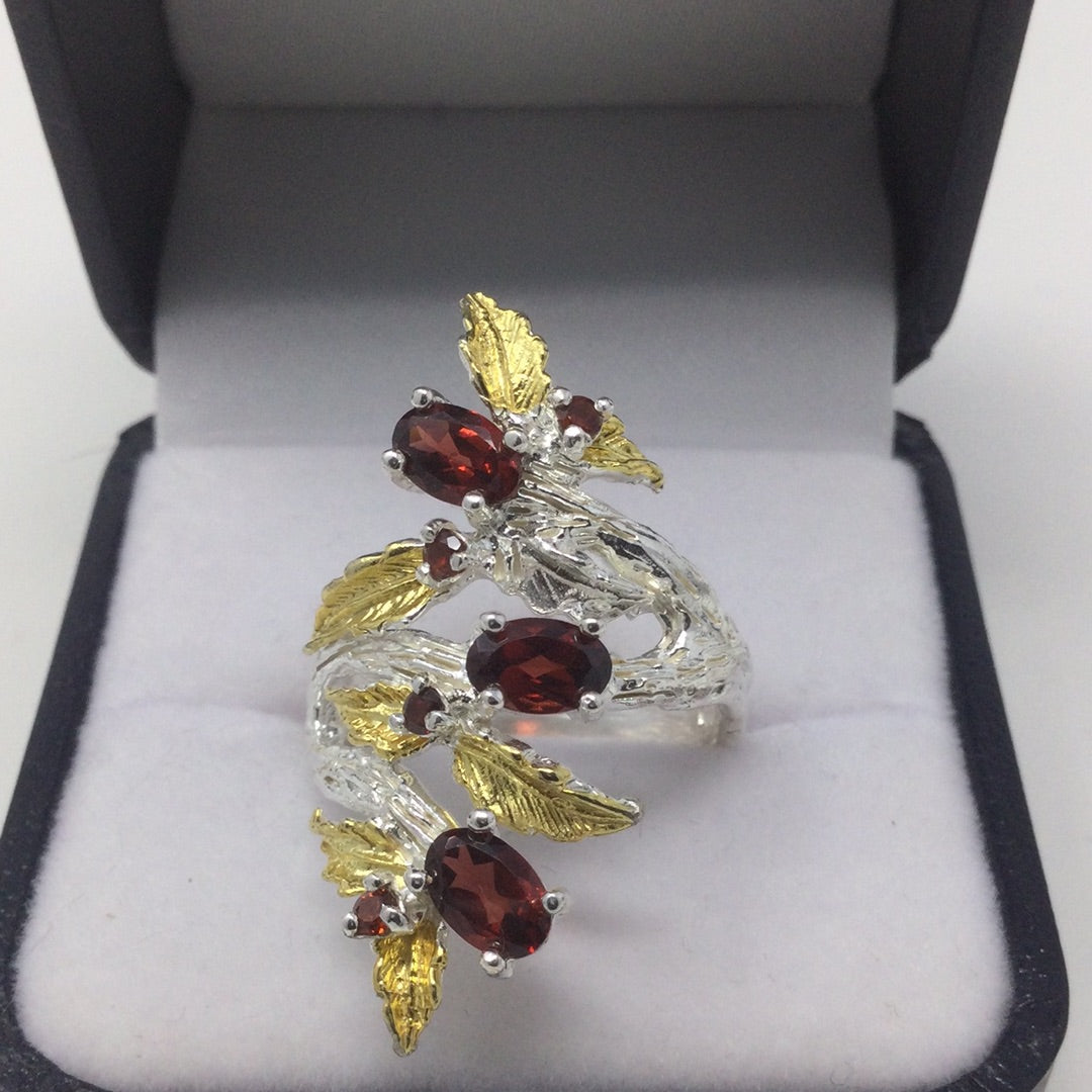 Rich deep red genuine Garnets, 6mm by 4mm in a graceful intricate, artistic setting. The ring seems tho climb up your finger, set in .925 sterling silver with a 14K white and yellow gold overlay. This is a custom made, one of a kind that sets you far apart from mass produced jewelry store inventories. Size 7 1/4, Resize at your jeweler or use a ring guard.