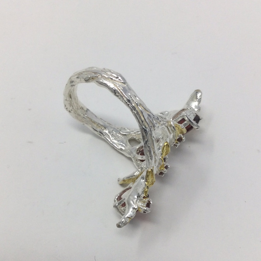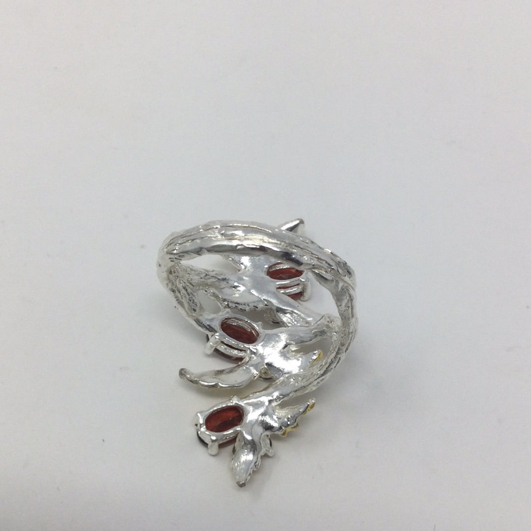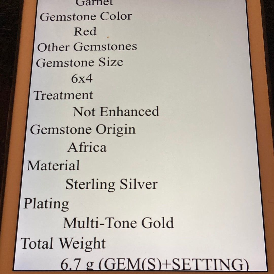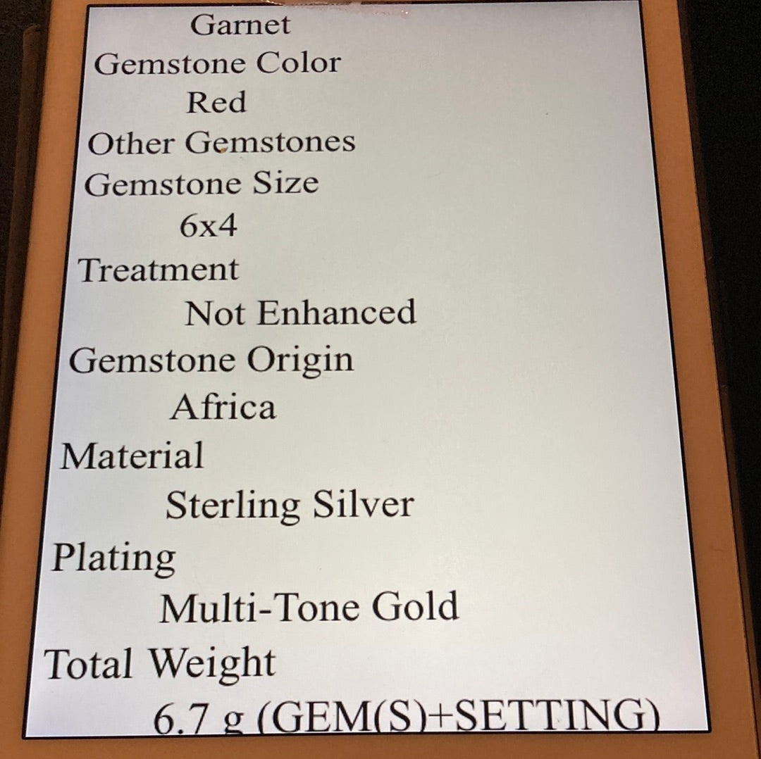 Rich deep red genuine Garnets, 6mm by 4mm in a graceful intricate, artistic setting. The ring seems tho climb up your finger, set in .925 sterling silver with a 14K white and yellow gold overlay. This is a custom made, one of a kind that sets you far apart from mass produced jewelry store inventories. Size 7 1/4, Resize at your jeweler or use a ring guard.