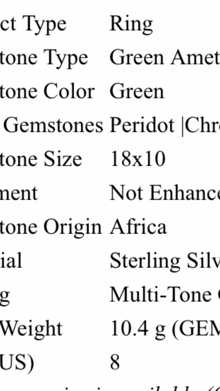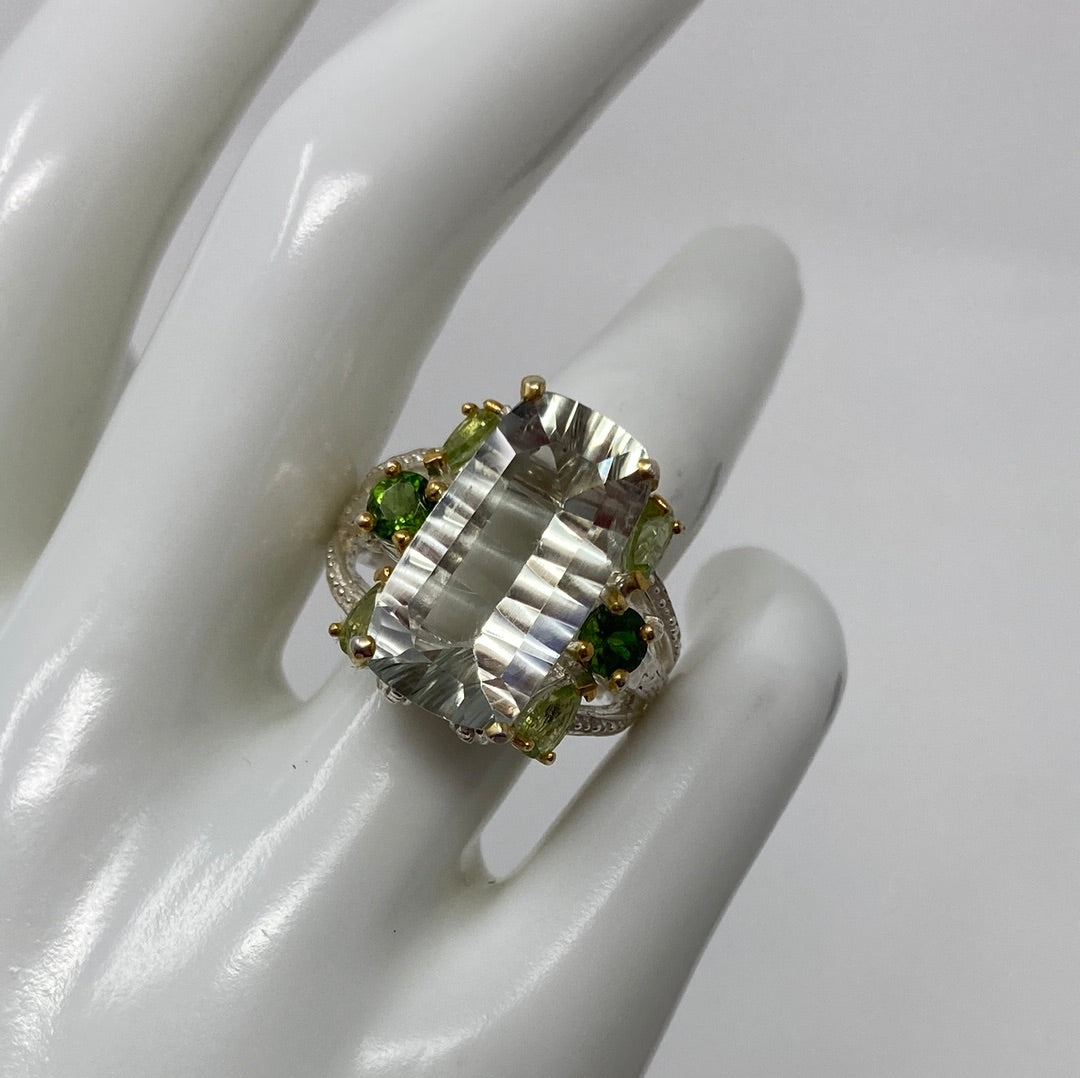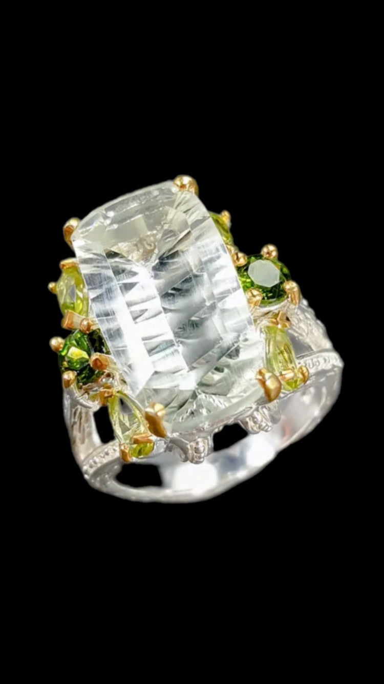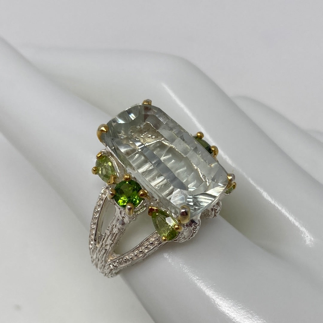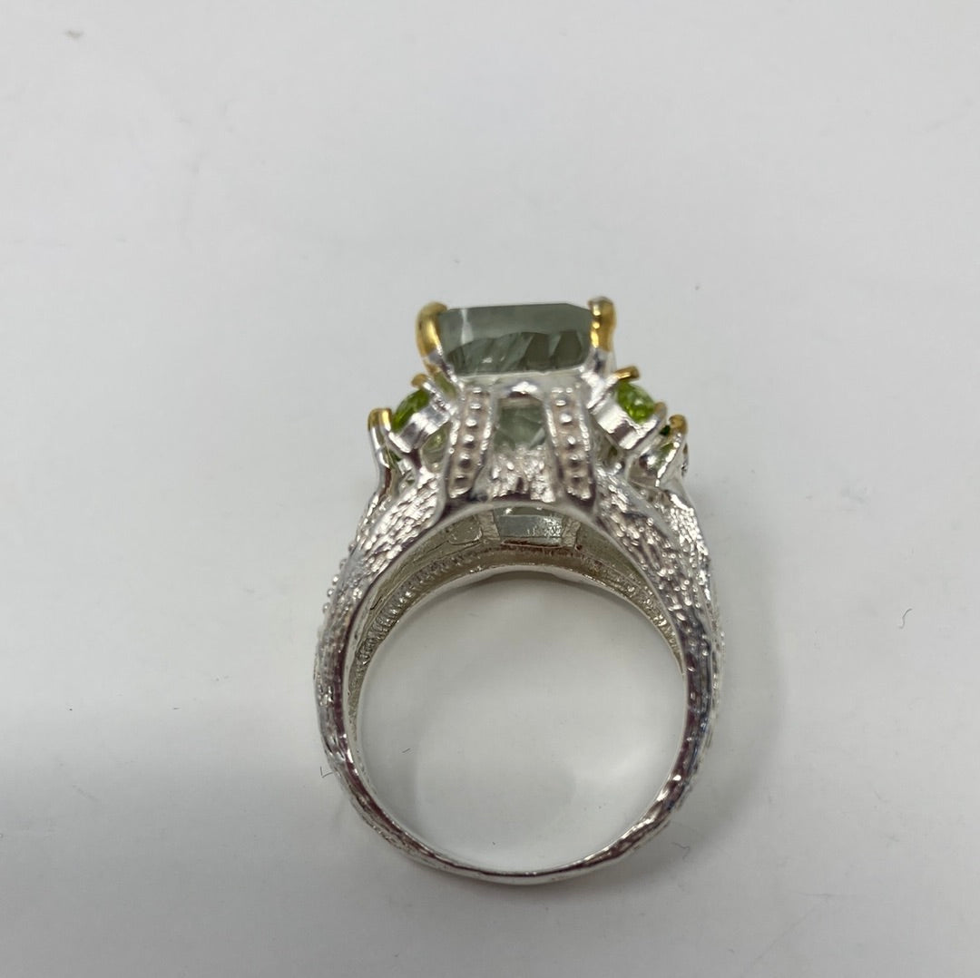 This unusual work of art features an 18mm by 10mm lovely Genuine Green Amethyst in that beautiful concave faceted cut that appears to be infinity, accented with Peridot & Russian Chrome Diopside. This is a custom made, one of a kind from artisans that do not mass produce their rings. Gemstones are hand selected for their unique designs. I select the best for all of us to enjoy. Set in .925 Sterling Silver Size 8, Resize at your jeweler.