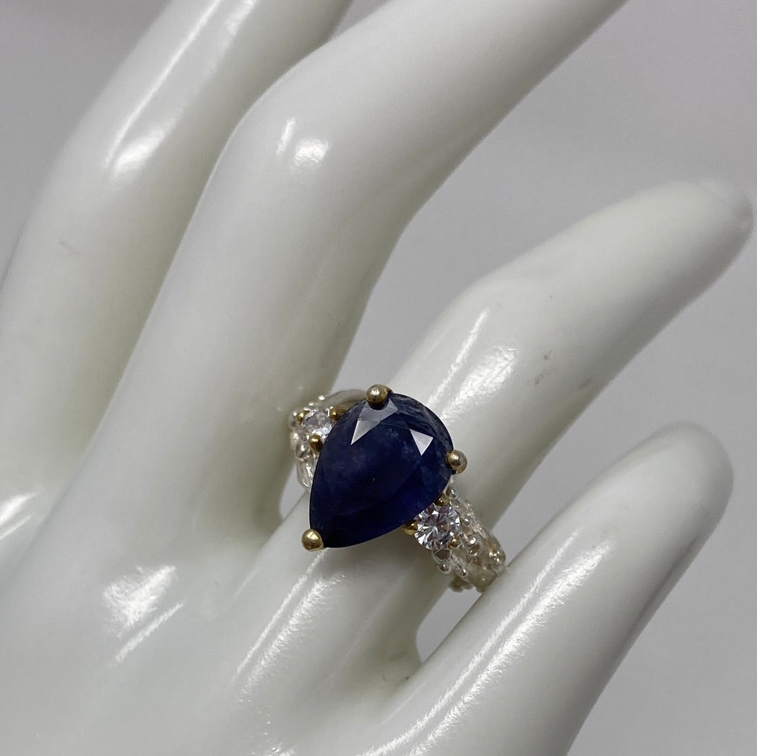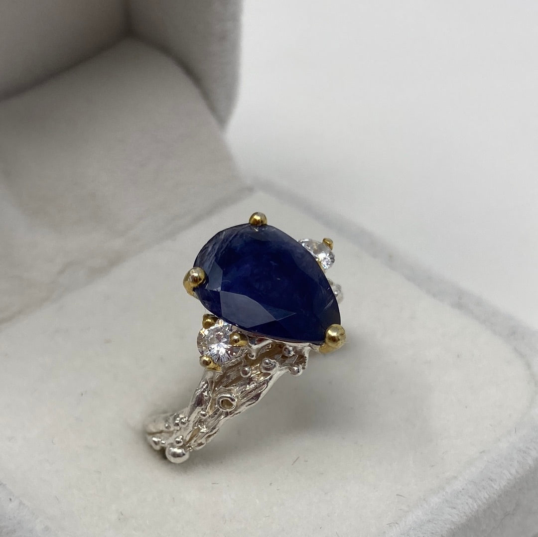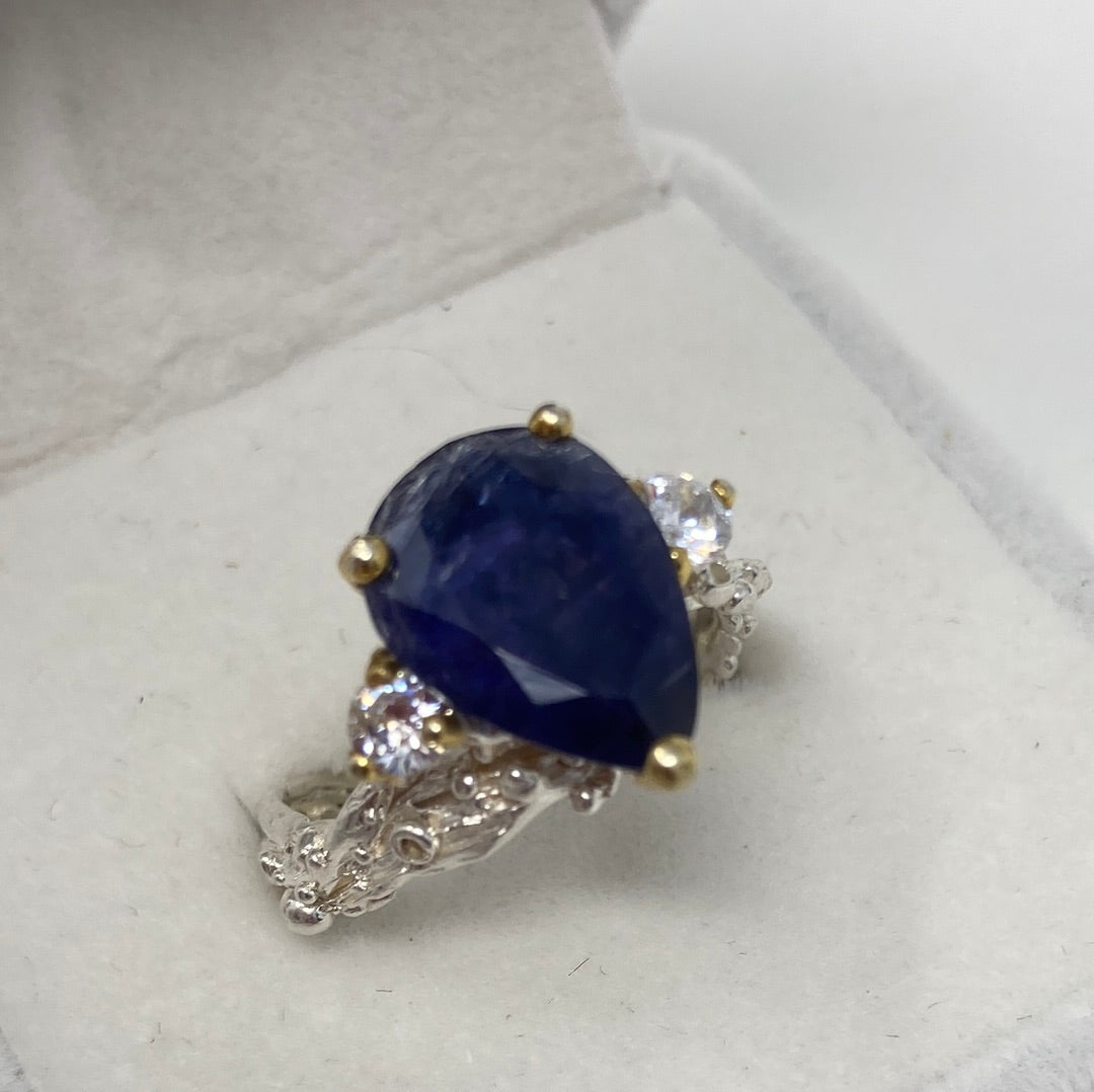 This exquisite genuine pear shaped Iolite is very special and unique. The gemstone measures 12mm by 9mm. It has an iridescent shimmer that is very enchanting. Pear shaped faceting and accented with genuine Blue Topaz, set in .925 Sterling Silver. A super elegant lux look, a one of a kind. Size 7, Resize at your jeweler.