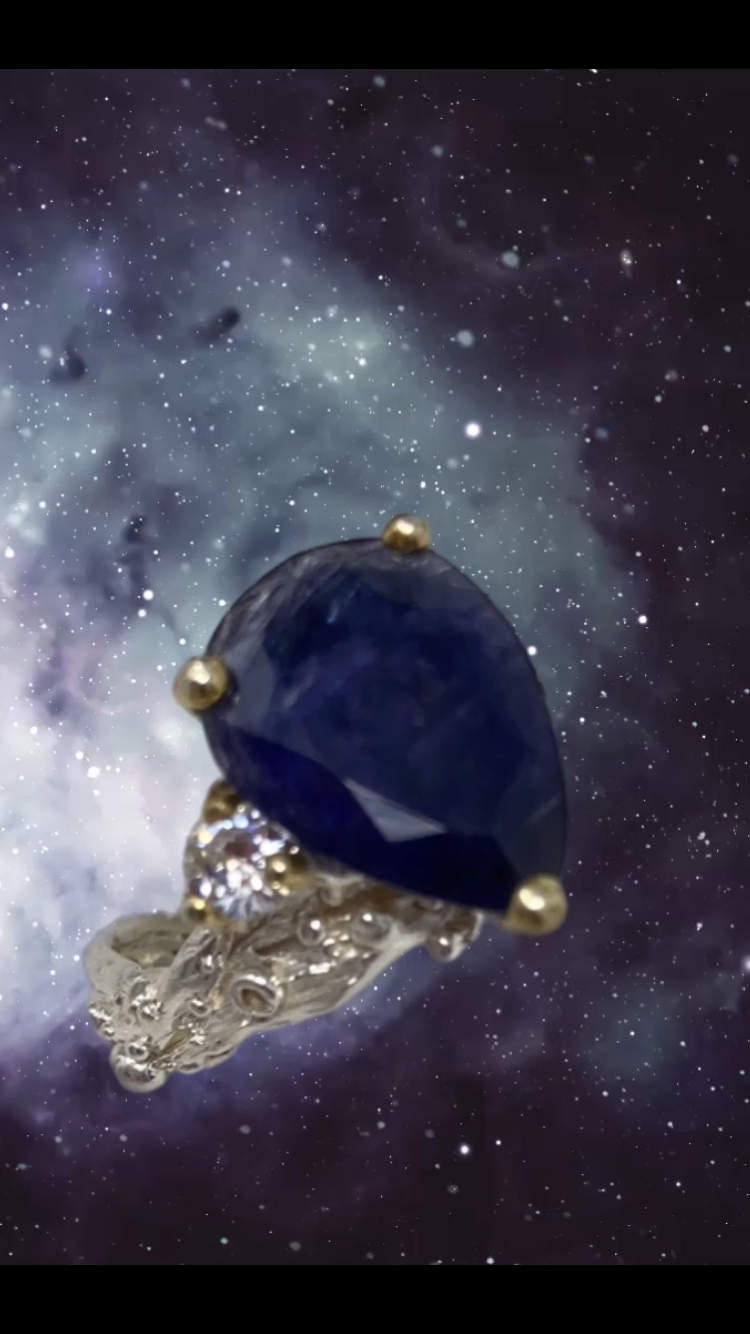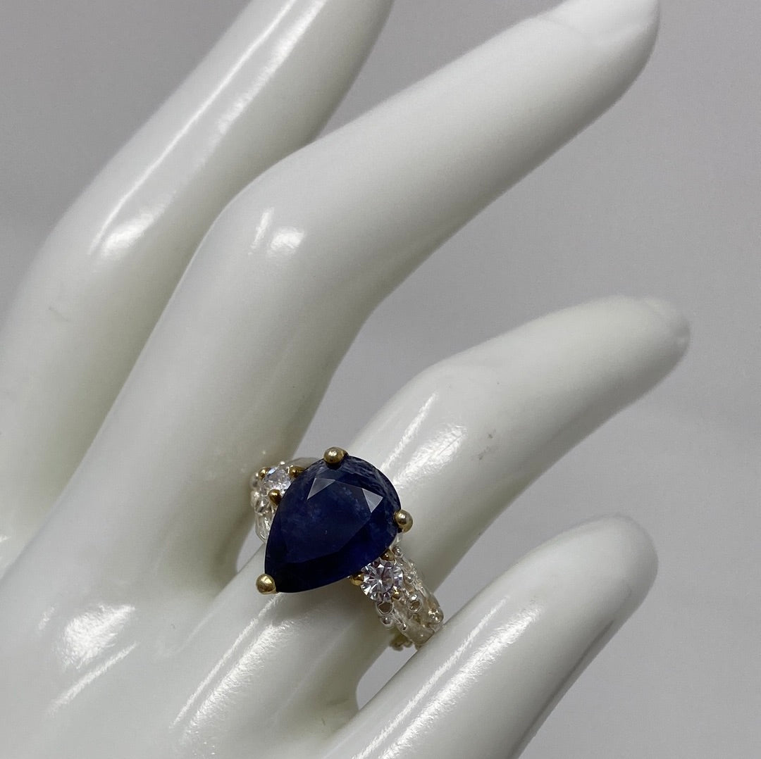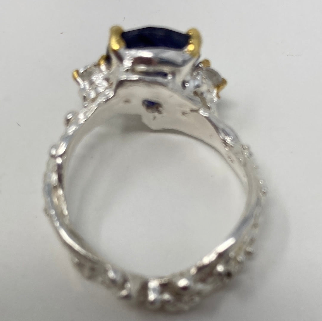 This exquisite genuine pear shaped Iolite is very special and unique. The gemstone measures 12mm by 9mm. It has an iridescent shimmer that is very enchanting. Pear shaped faceting and accented with genuine Blue Topaz, set in .925 Sterling Silver. A super elegant lux look, a one of a kind. Size 7, Resize at your jeweler.