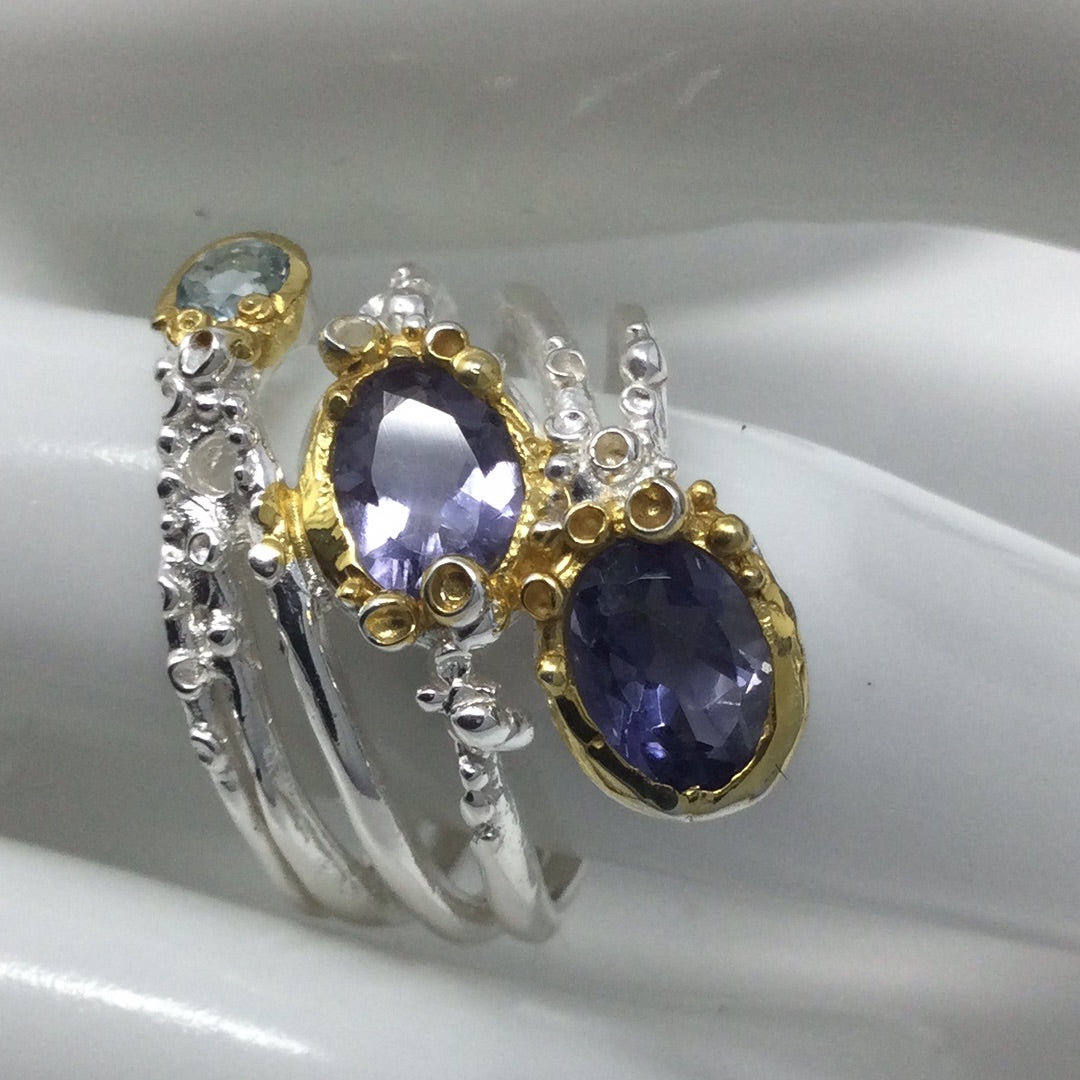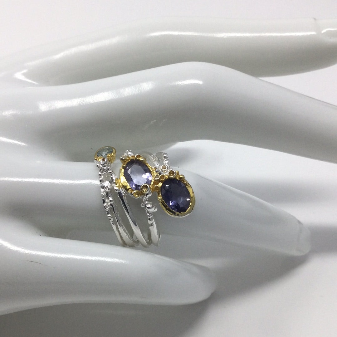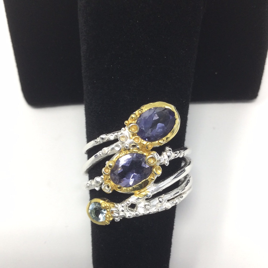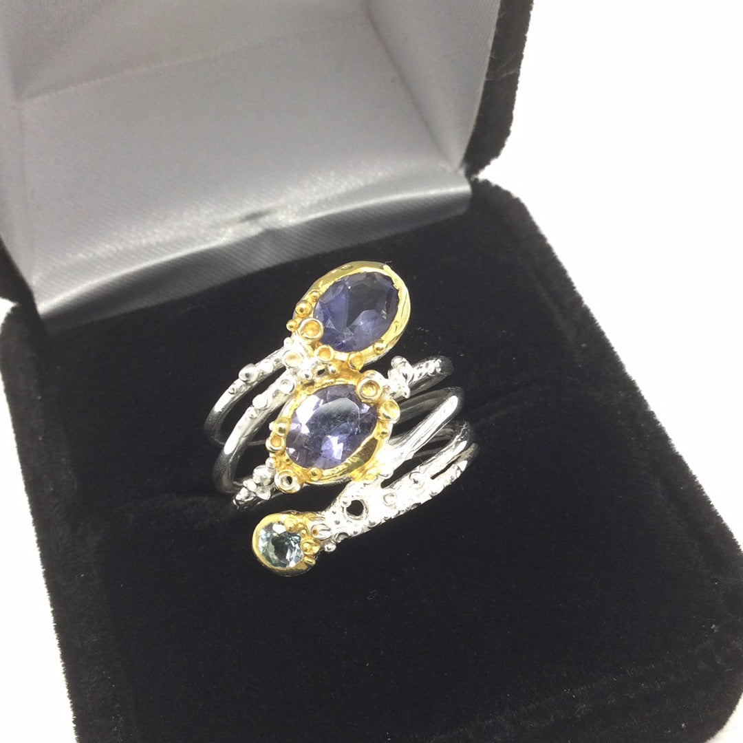 A distinctive modern take on a by pass ring. This custom made one of a kind features a duo of top quality Iolites accented with a precious Blue Topaz. All set in .925 sterling silver with a 14 K white gold overlay with accents on 14K yellow gold encircling and highlighting these special gemstones. A artsy elegant look that sets you apart from the crowd. Size 6 1/2 Resize at your jeweler