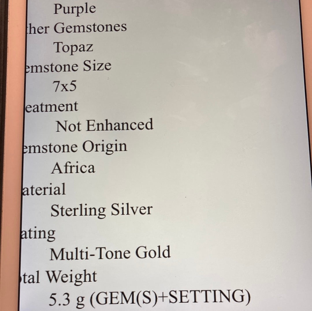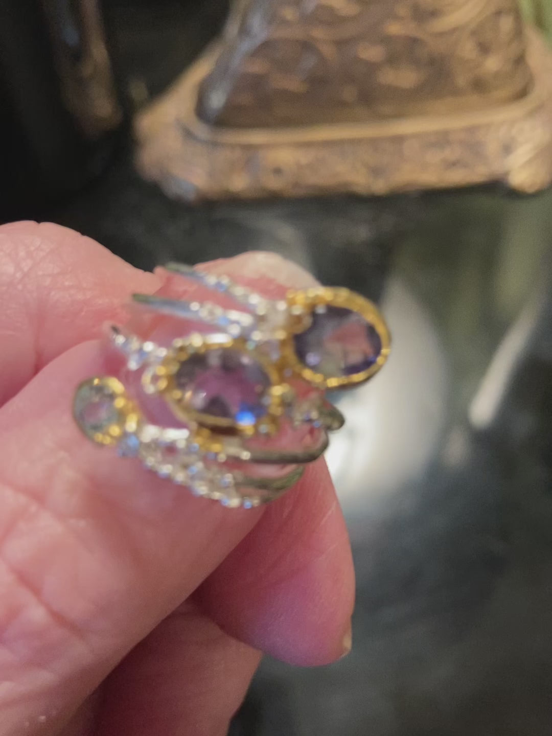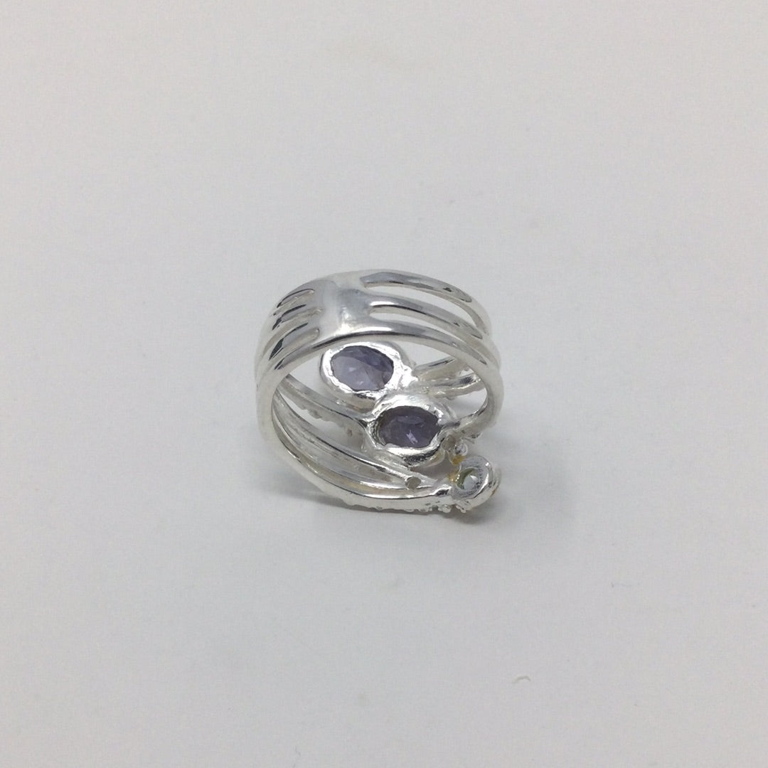 A distinctive modern take on a by pass ring. This custom made one of a kind features a duo of top quality Iolites accented with a precious Blue Topaz. All set in .925 sterling silver with a 14 K white gold overlay with accents on 14K yellow gold encircling and highlighting these special gemstones. A artsy elegant look that sets you apart from the crowd. Size 6 1/2 Resize at your jeweler