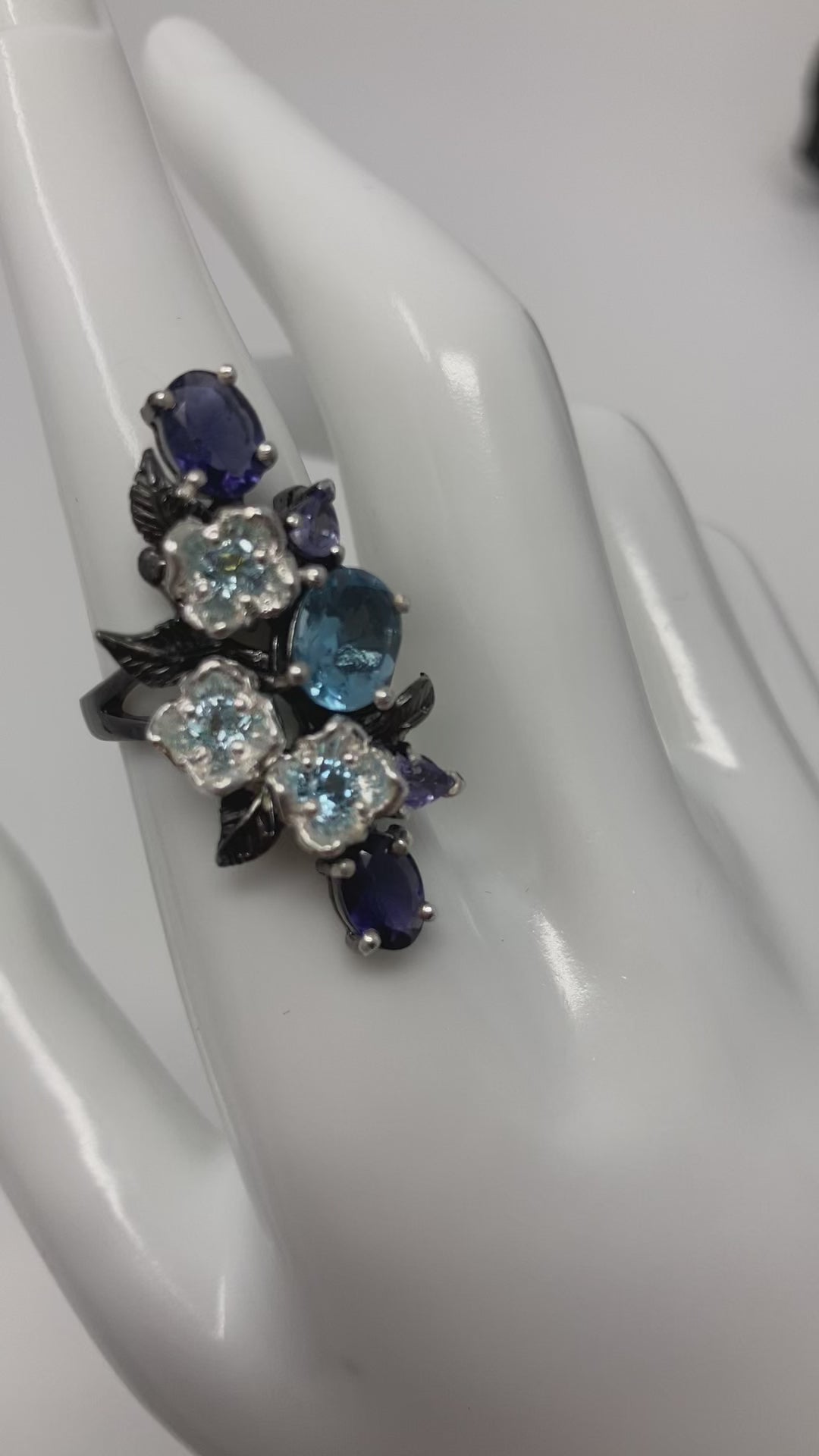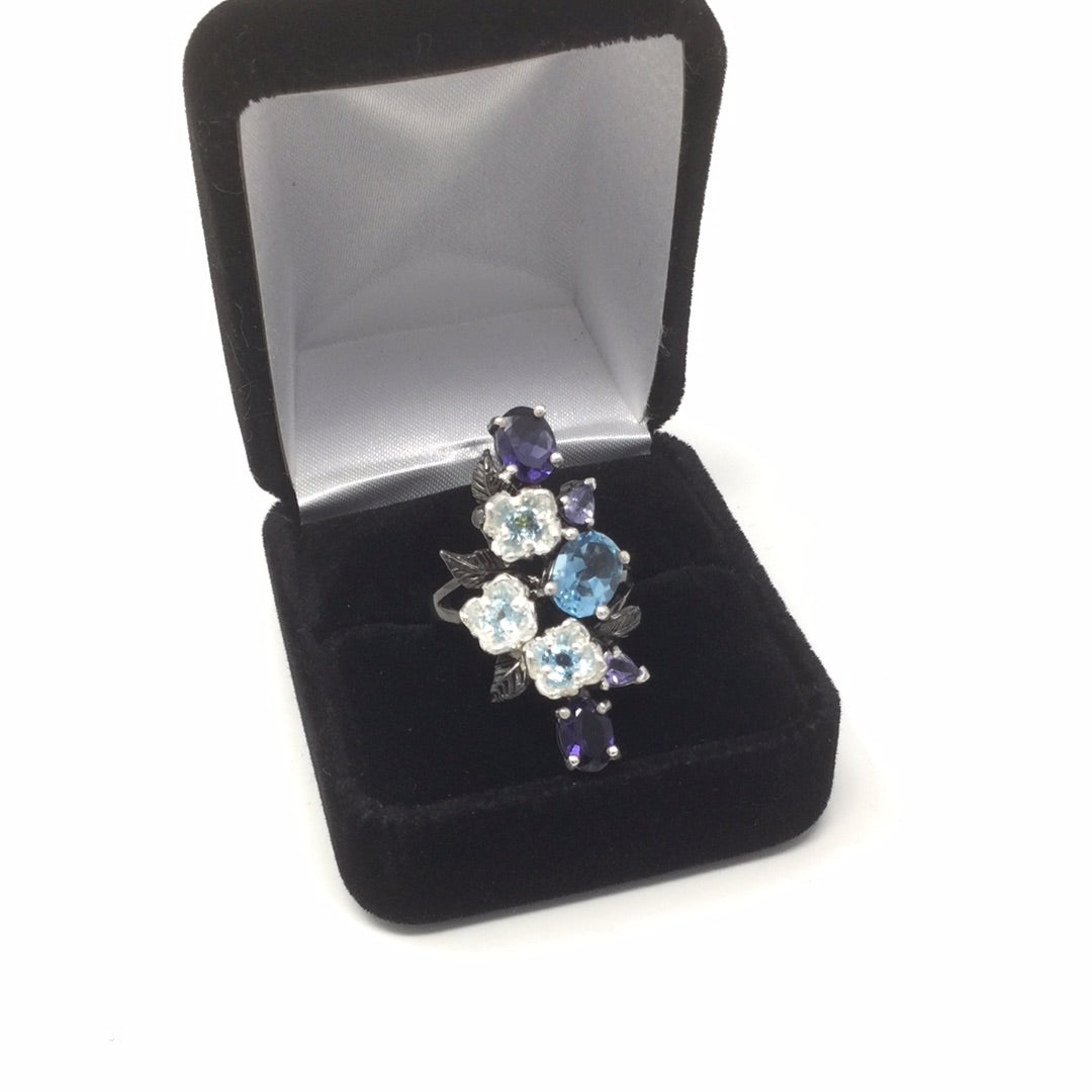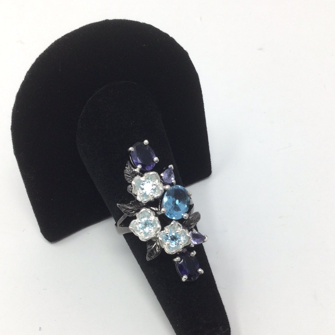 Bourgeois Blues in a symphony of genuine gemstones, features an 8mm by 6mm Blue Topaz with gorgeous natural Iolites all set in .925 sterling silver with a Rhodium finish with 14 K white gold finish. It’s a stunning combination in this custom made one of a kind ring. Exquisite intricate details in the craftsmanship, see the florets and accents with light Sky Blue Topaz also. It’s a graceful mounting that embraces your finger elegantly. Size 7, Resize at your jeweler or use a ring guard.
