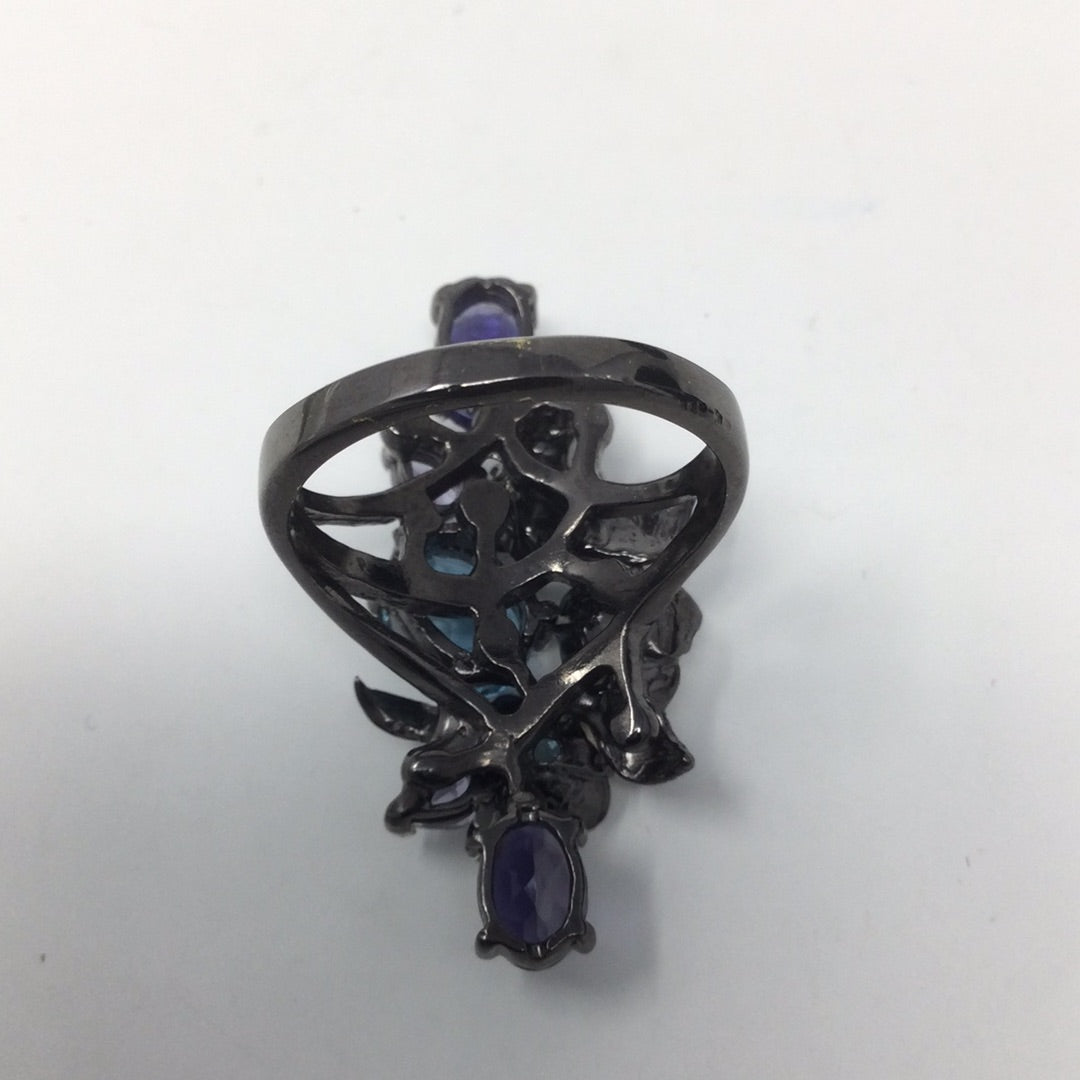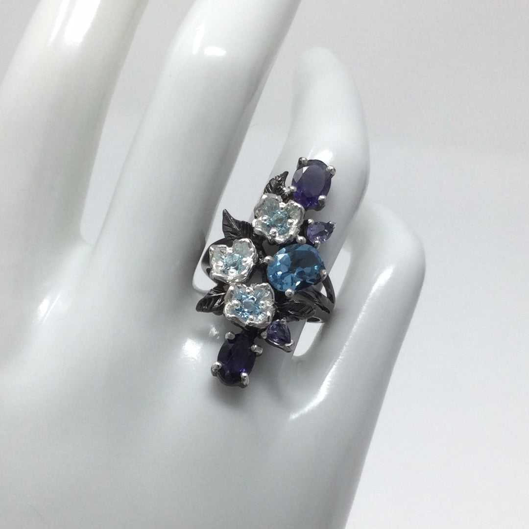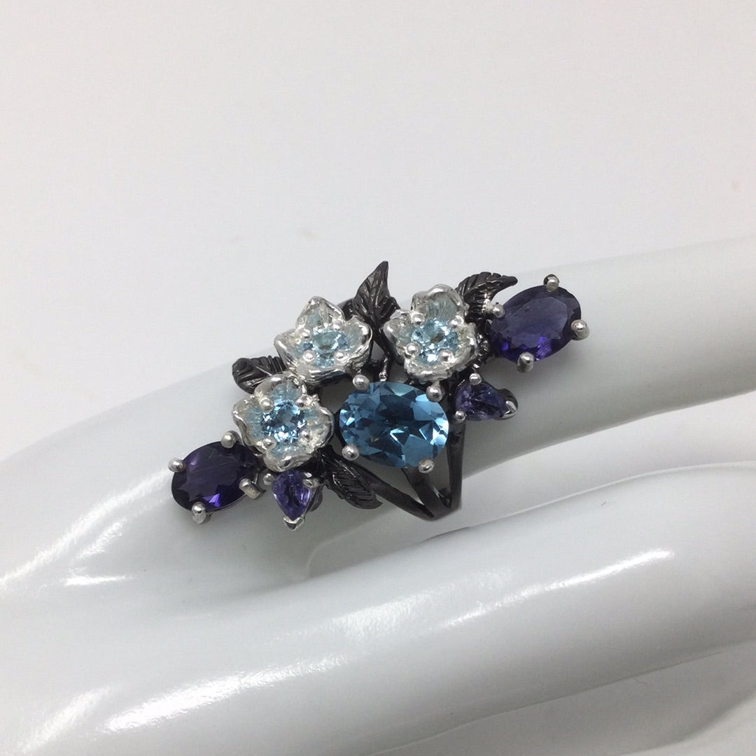 Bourgeois Blues in a symphony of genuine gemstones, features an 8mm by 6mm Blue Topaz with gorgeous natural Iolites all set in .925 sterling silver with a Rhodium finish with 14 K white gold finish. It’s a stunning combination in this custom made one of a kind ring. Exquisite intricate details in the craftsmanship, see the florets and accents with light Sky Blue Topaz also. It’s a graceful mounting that embraces your finger elegantly. Size 7, Resize at your jeweler or use a ring guard.
