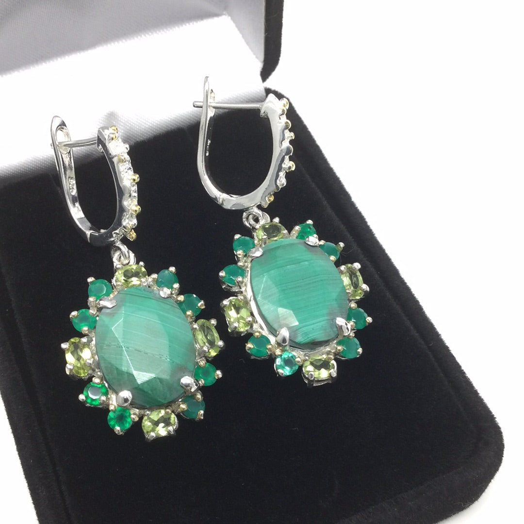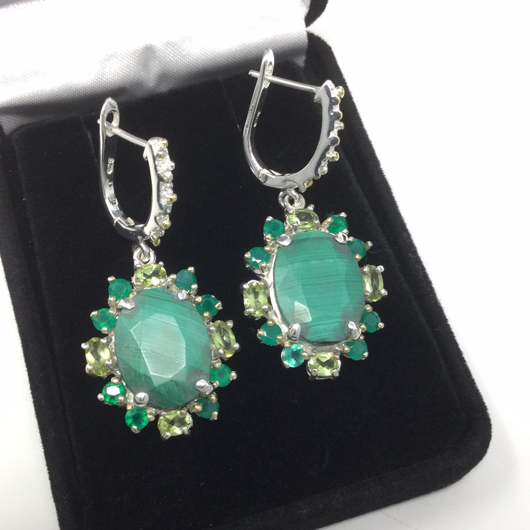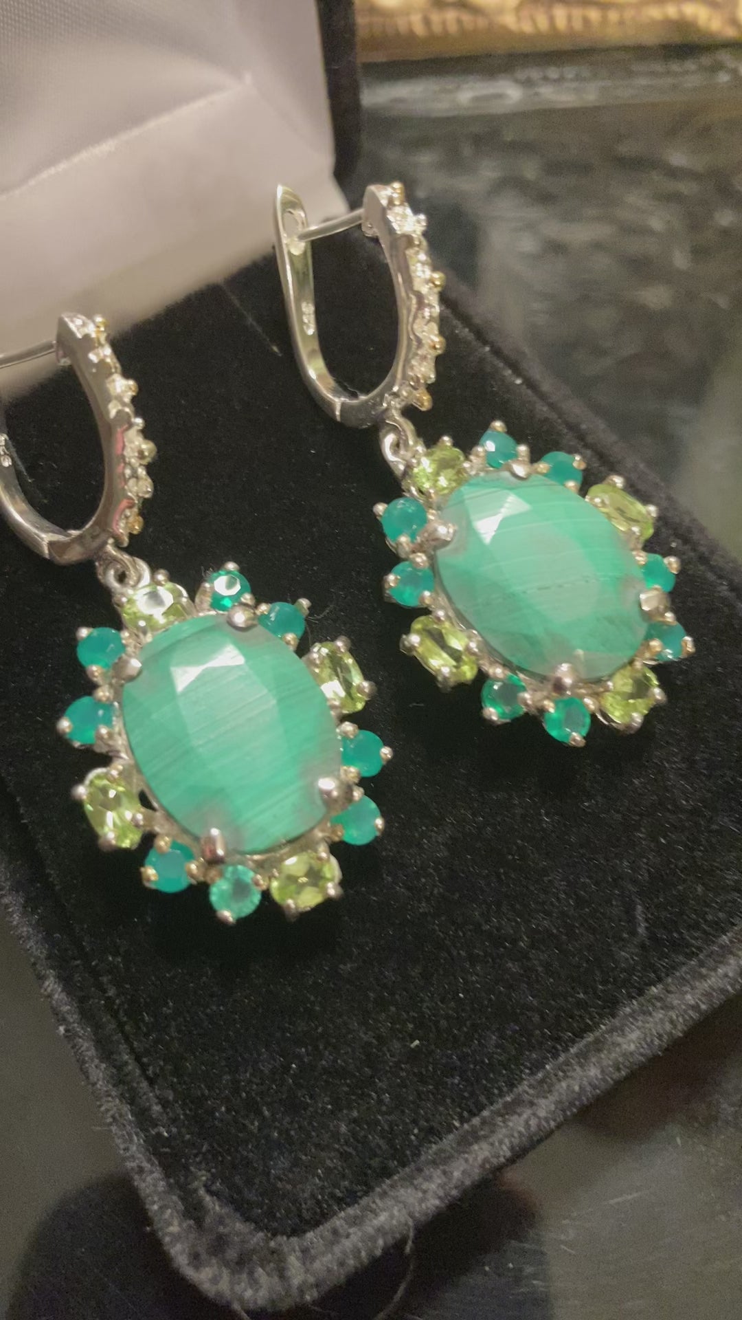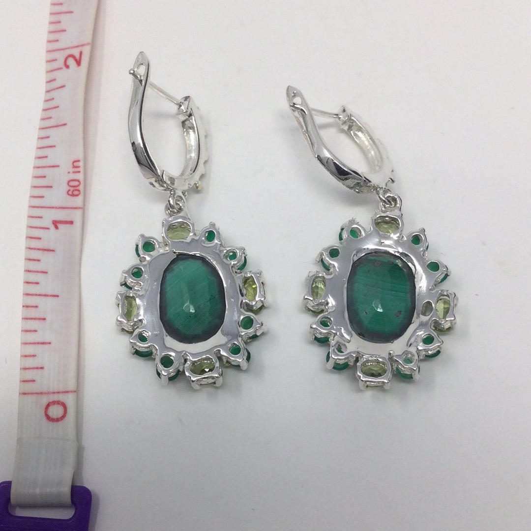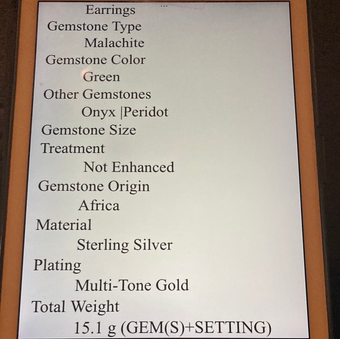 There’s something about the richness of genuine Malachite that gives its wearer and standout regal look. Genuine gemstones accent these beautiful, custom made, one of a kind earrings. Look in the mirror with rich emerald green framing your face, it’s elevated elegance in a classy way. You’ll be able to wear this earrings for day or evening. Crafted in .925 sterling silver with a 14K white gold overlay, accented also with genuine Onyx and Peridot. Invest in genuine gemstones. Approximately 1” Long.
