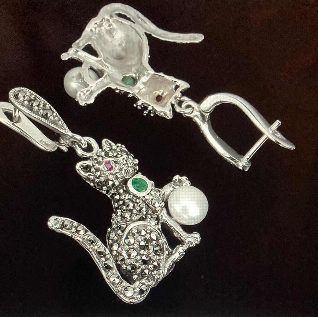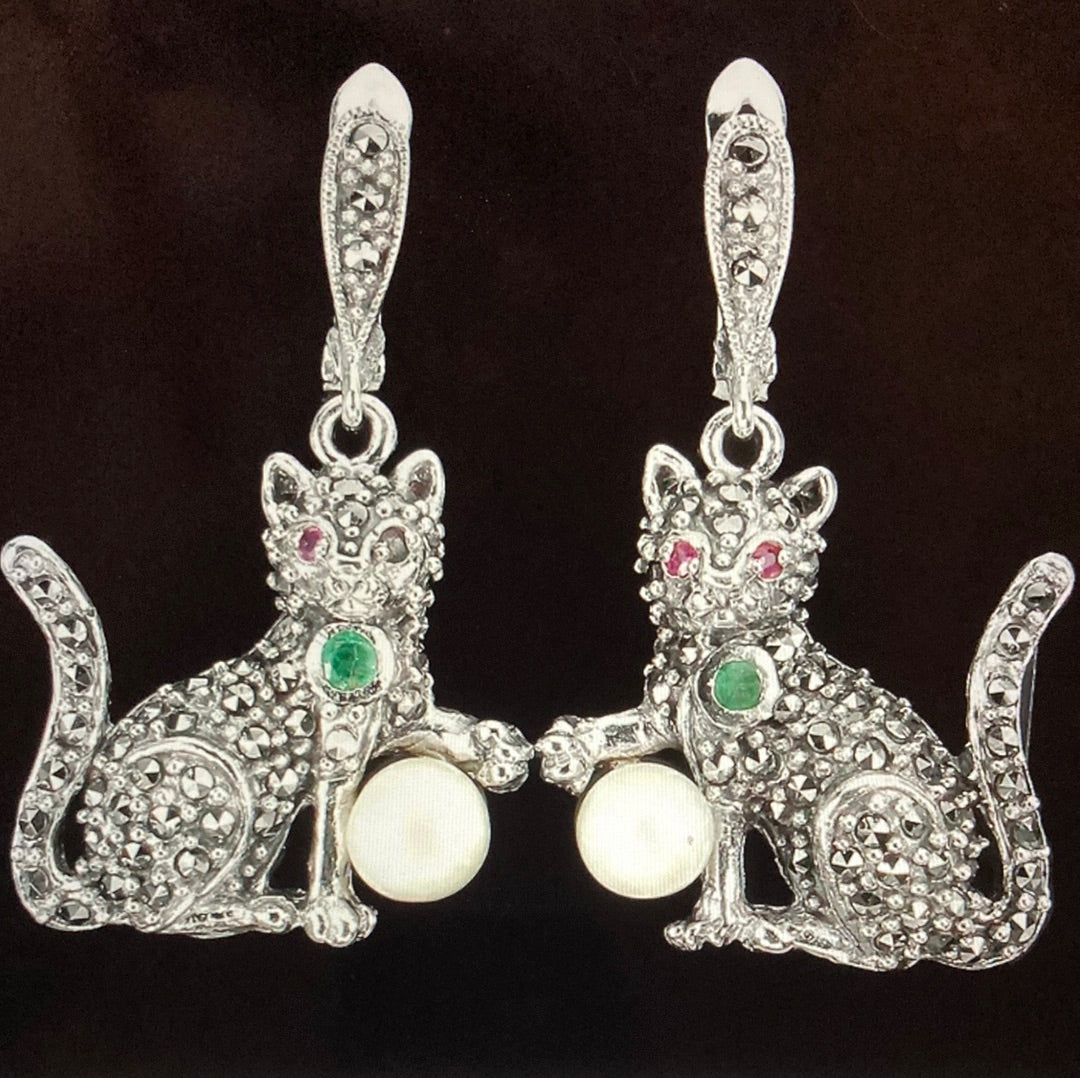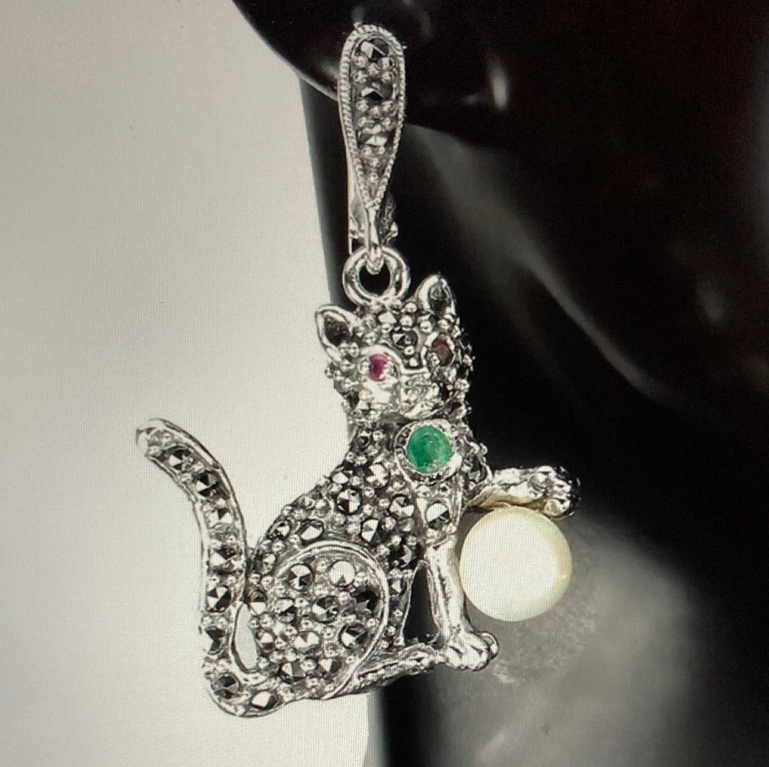 Artistic, unique cat earrings crafted in sterling silver accented with Marcasites, genuine Rubies Emeralds and cultured Pearls. These are intricately detailed that are easily to become family heirlooms or commemorate your furry feline friend. Invest in what you love and enchanted your spirit.