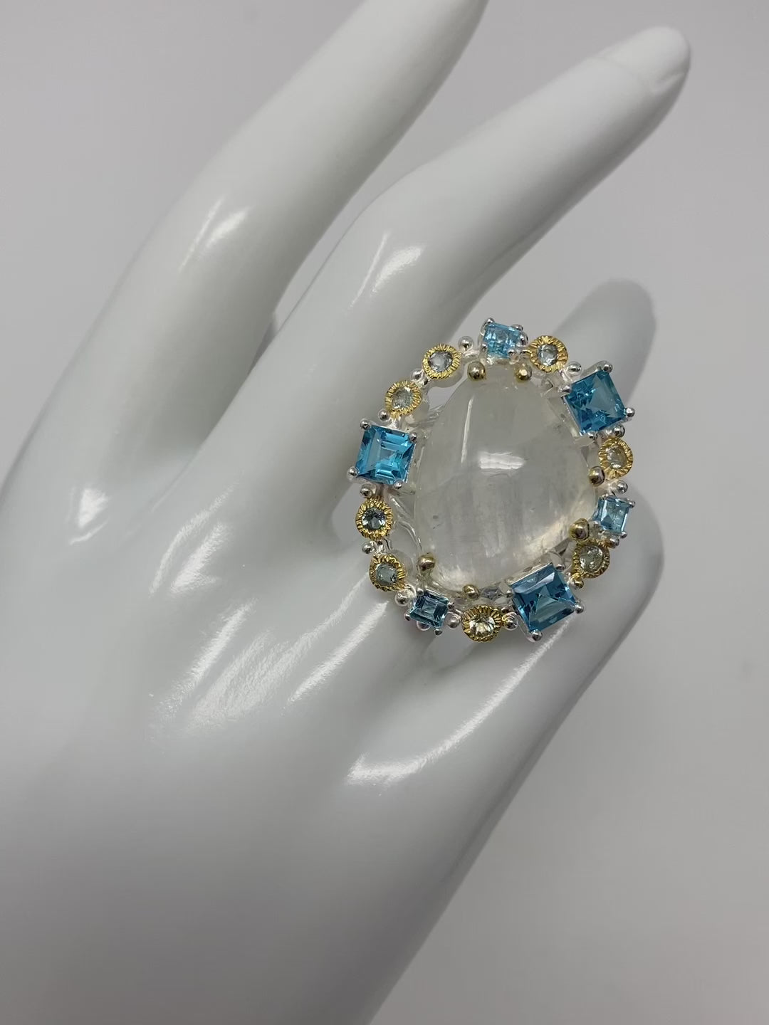 A billowy moonlight sheen known as adularesence, shimmering white to blue opalescent. Purification, inner strength and growth are some of the properties associated with this gemstone. This ring features a gorgeous freeform specimen surrounded by Blue Topaz baguettes, that is a fancy faceted cut on this custom made, one of a kind ring. These gemstones were hand selected then like a work of art arranged in portrait of jewels. Set in .925 sterling silver it’s a 14K white gold overlay.
