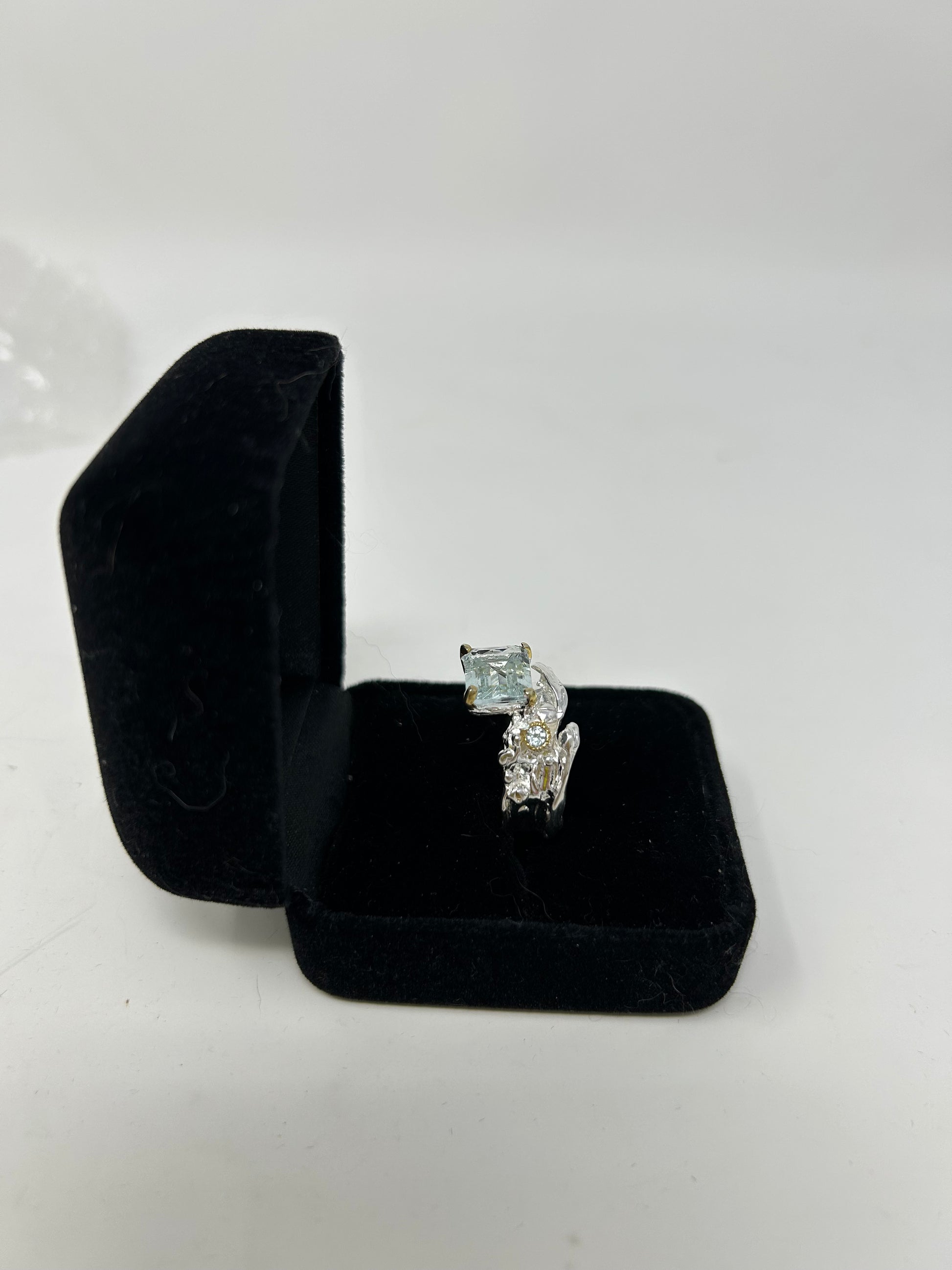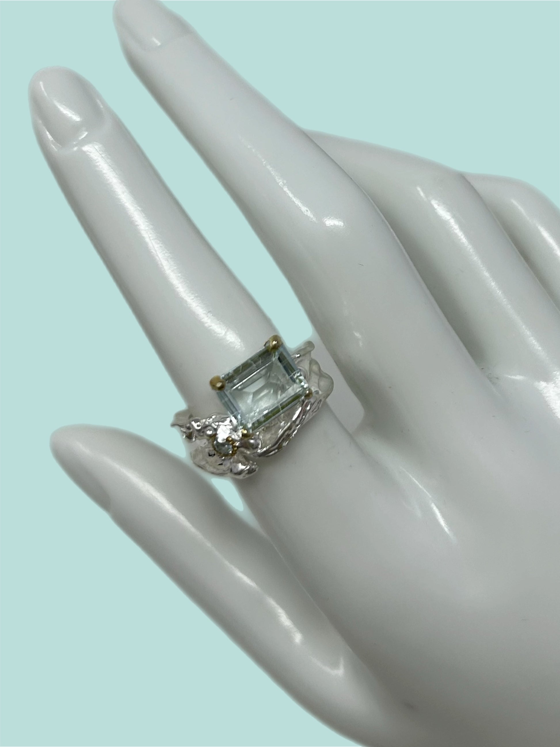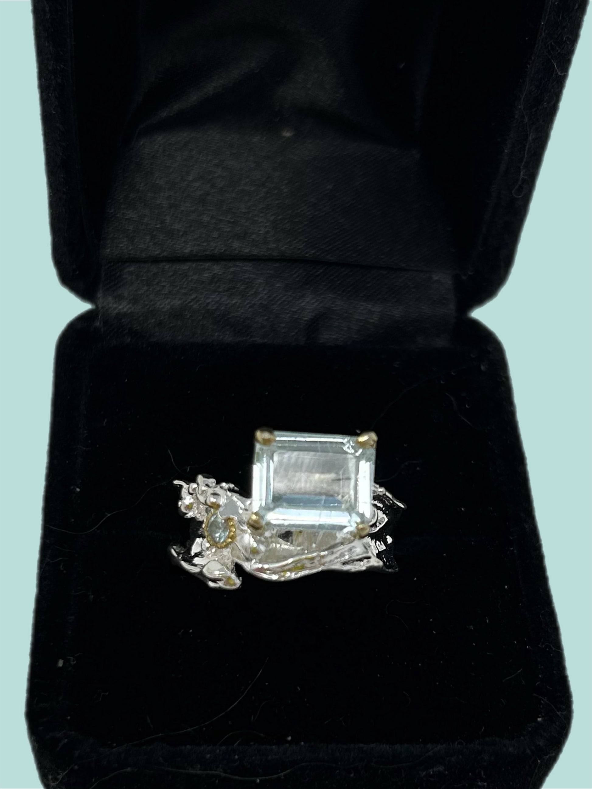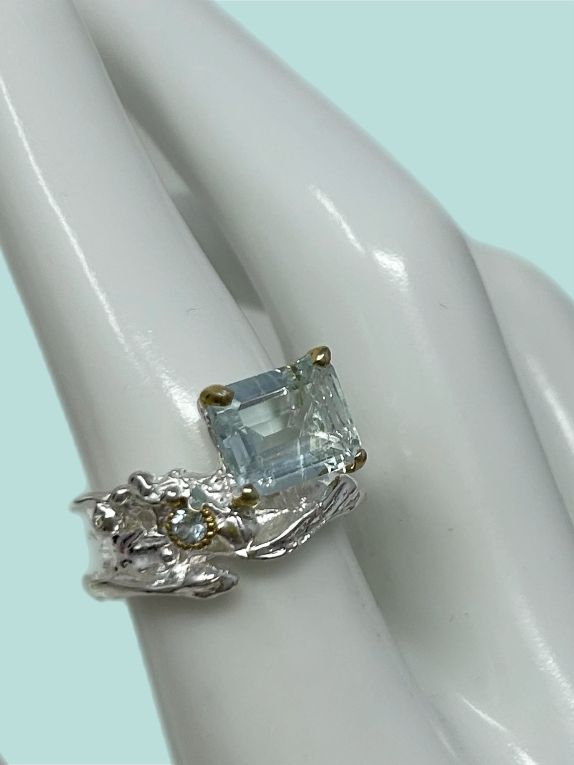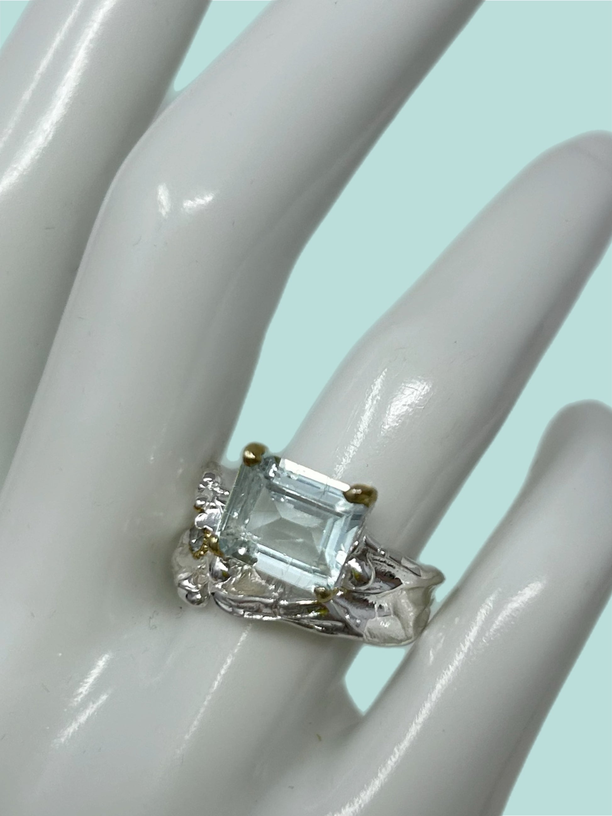 This fabulous, natural Aquamarine is highly sought after in today’s market. A very nice size in a couple temporary custom made, one of a kind setting. Set in .925 Sterling Silver with 14K yellow gold prongs this gemstone has the natural needle like inclusions found in genuine Aquamarine & genuine Emeralds. You’ll cherish this gemstone for years to come as a part of your heirloom gemstone collection. Aquamarine are extremely collectable. Size 6 1/2 can be resized at your jeweler.