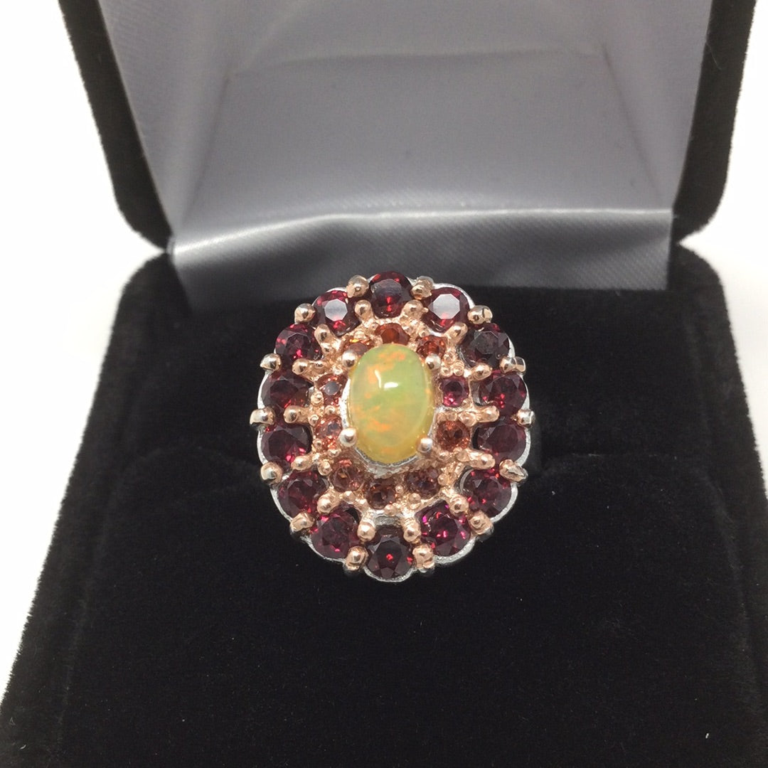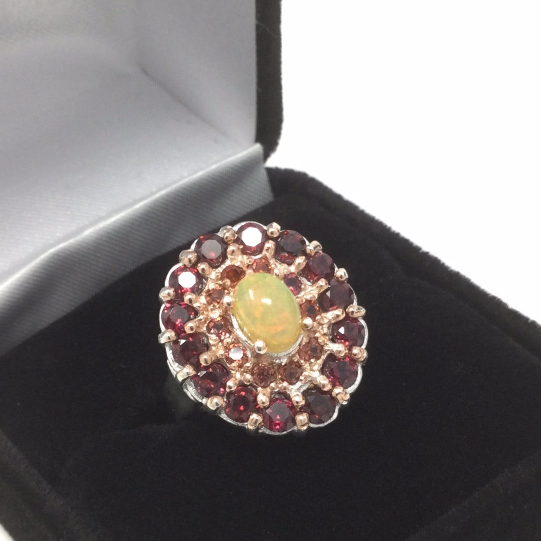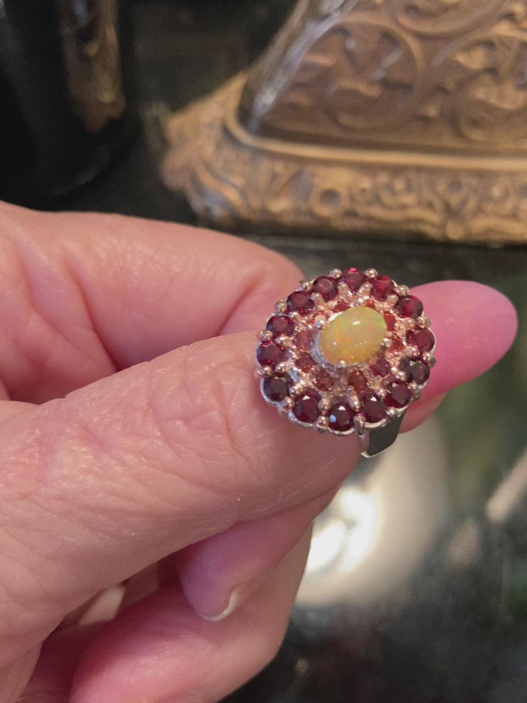 Genuine garnets form a ring of fire encircling this genuine fiery Opal. This is a one of a kind custom made creation, a marriage of gems that represent a heated union in a dance of fire. Commanding prescience of fire in genuine gemstones. Garnets and Opals a gorgeous pairing! The Opal measures 7mm by 5mm, set in .925 with a white god overlay for durability and beauty. Size 5 1/2, Resize at your jeweler