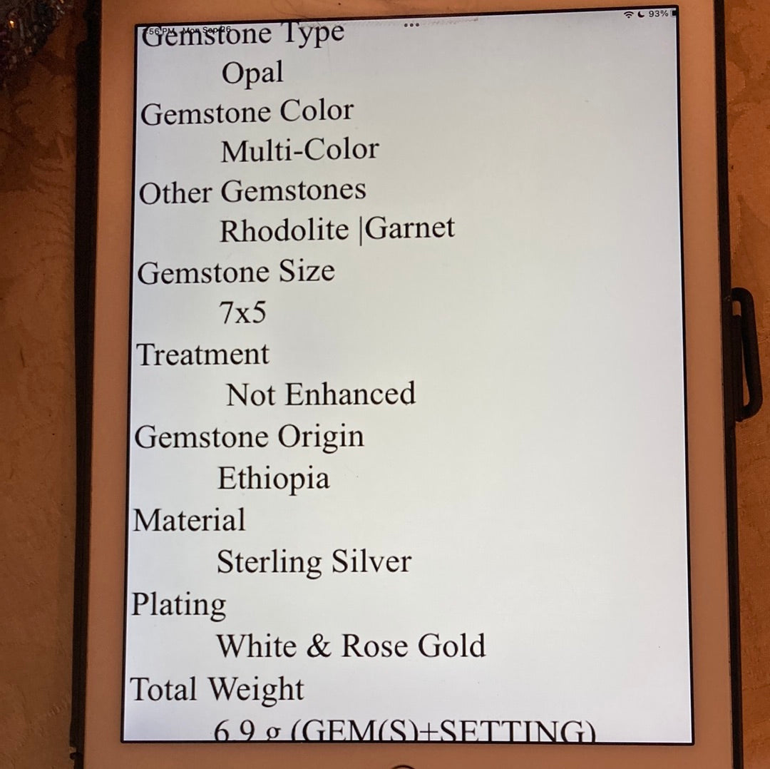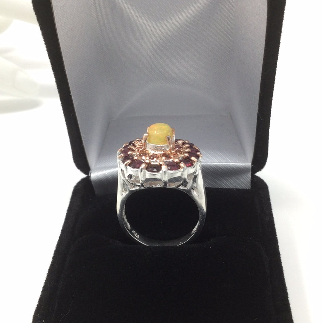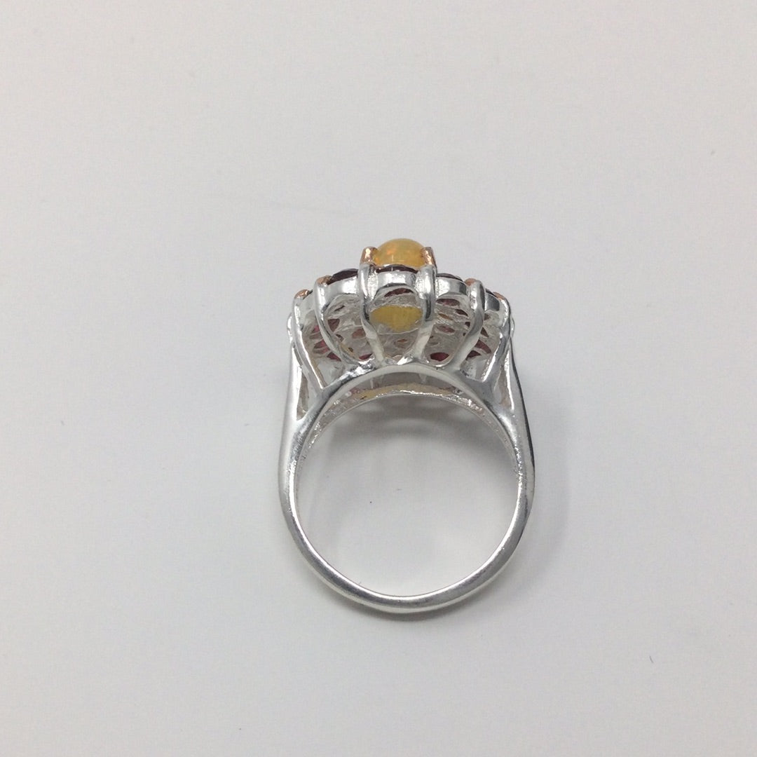 Genuine garnets form a ring of fire encircling this genuine fiery Opal. This is a one of a kind custom made creation, a marriage of gems that represent a heated union in a dance of fire. Commanding prescience of fire in genuine gemstones. Garnets and Opals a gorgeous pairing! The Opal measures 7mm by 5mm, set in .925 with a white god overlay for durability and beauty. Size 5 1/2, Resize at your jeweler