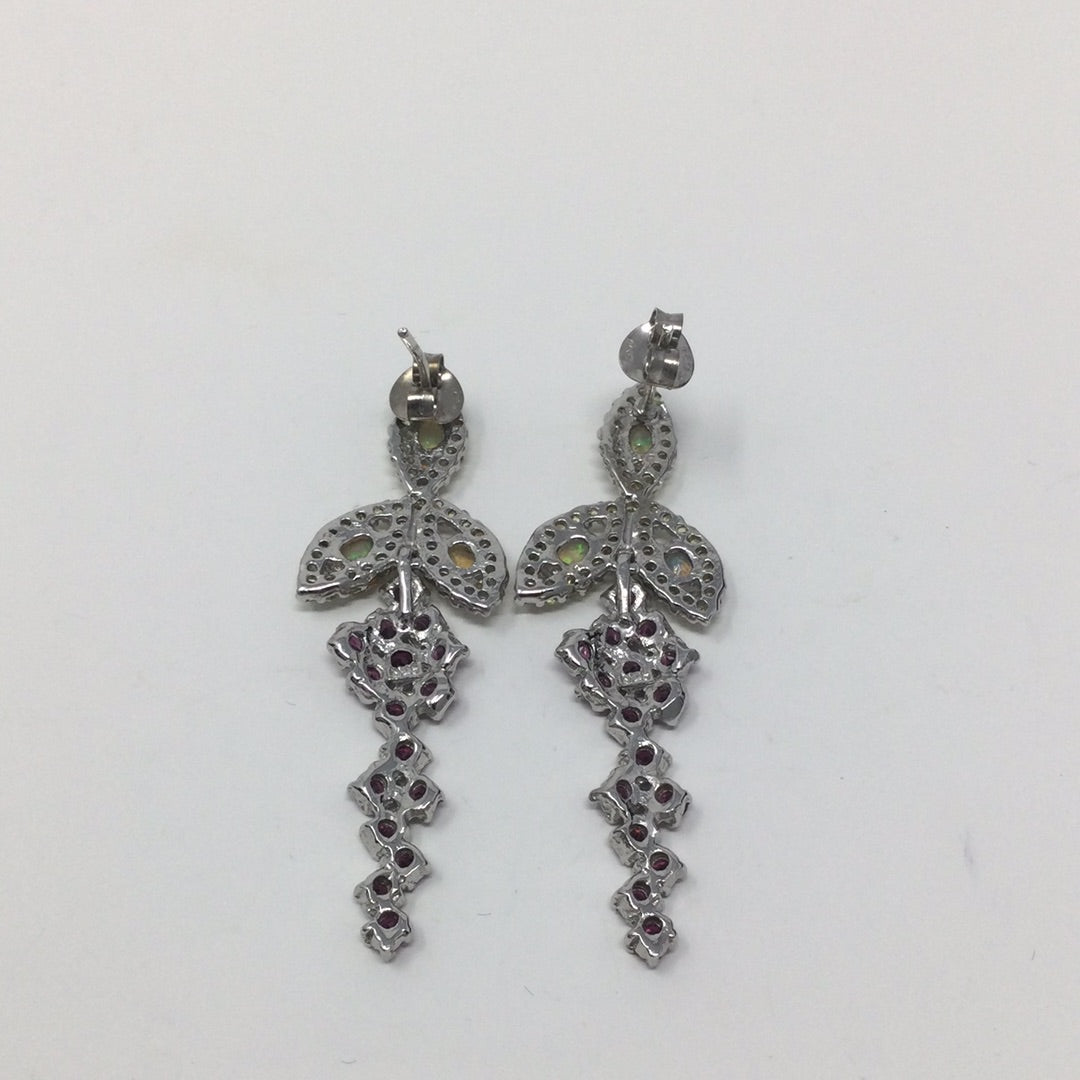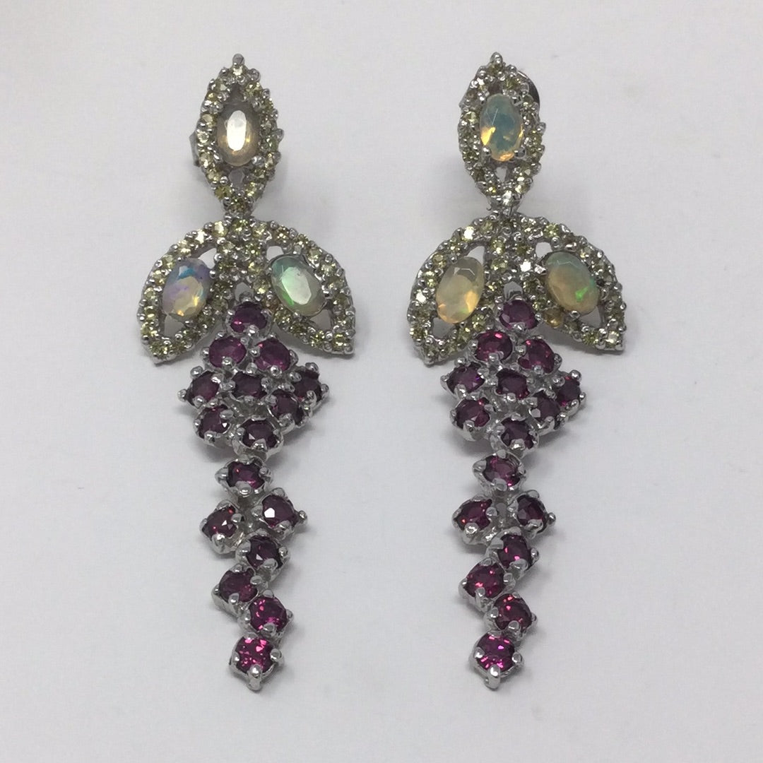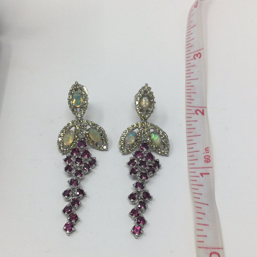 Exquisite top quality genuine gemstones crafted into these enchanting earrings. Frame your face in gemstones for luminescence, these feature, Fiery Opals, Garnets & Sapphires set in .925 sterling silver with a 14K white gold overlay. The graceful sweep of these earrings will define you in class, future heirlooms for your family. Notice the intricate workmanship in these one of a kind artistic earrings.