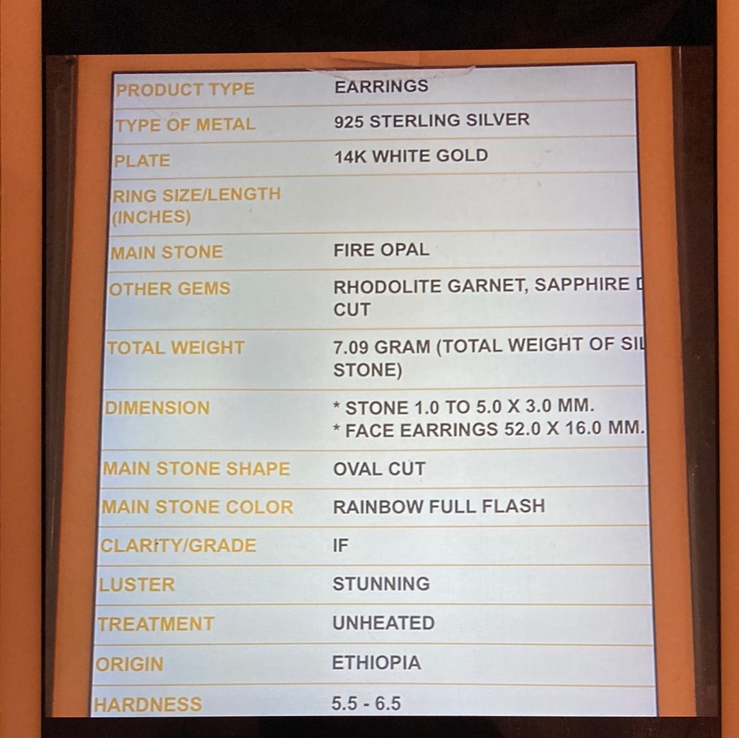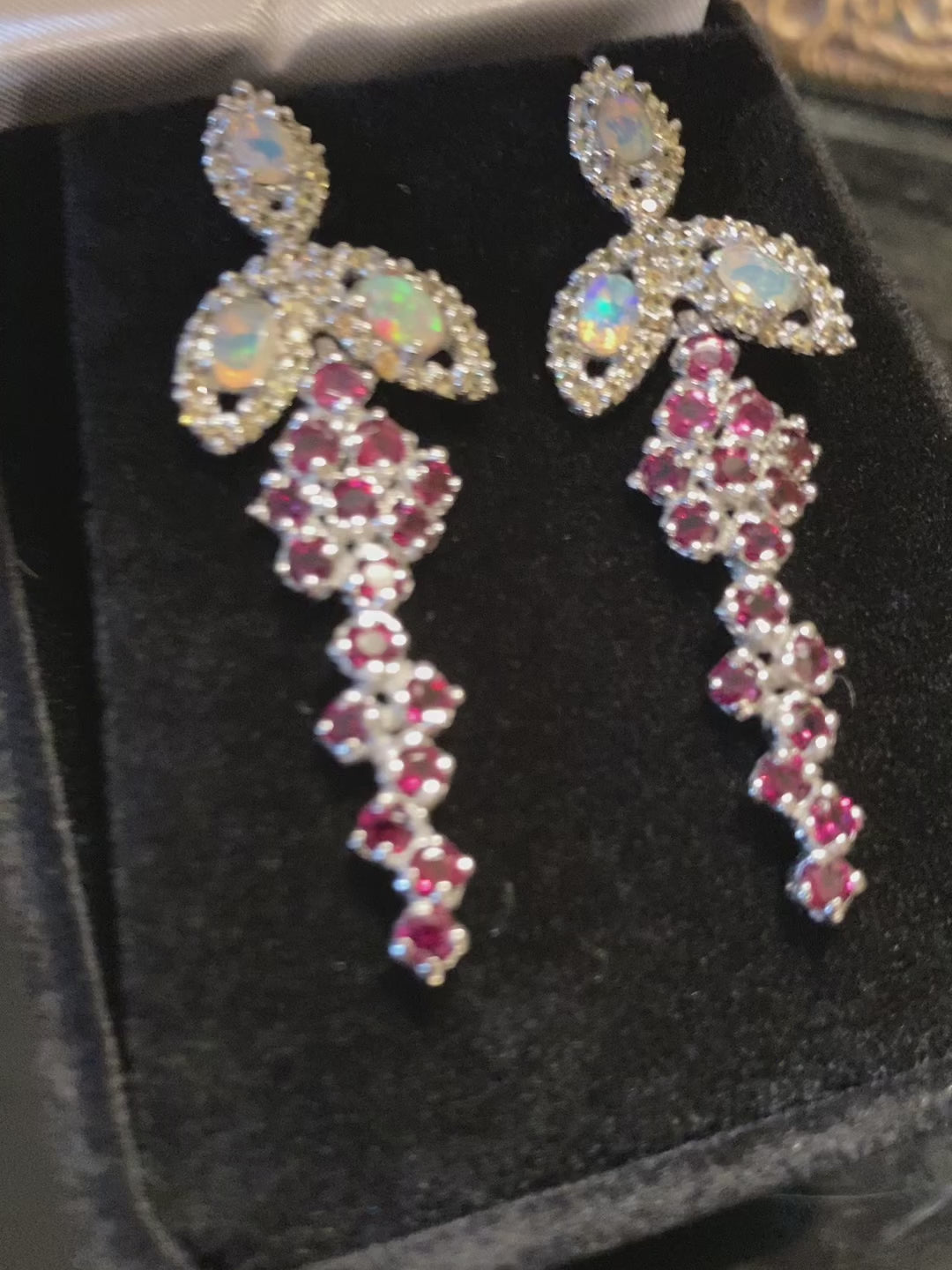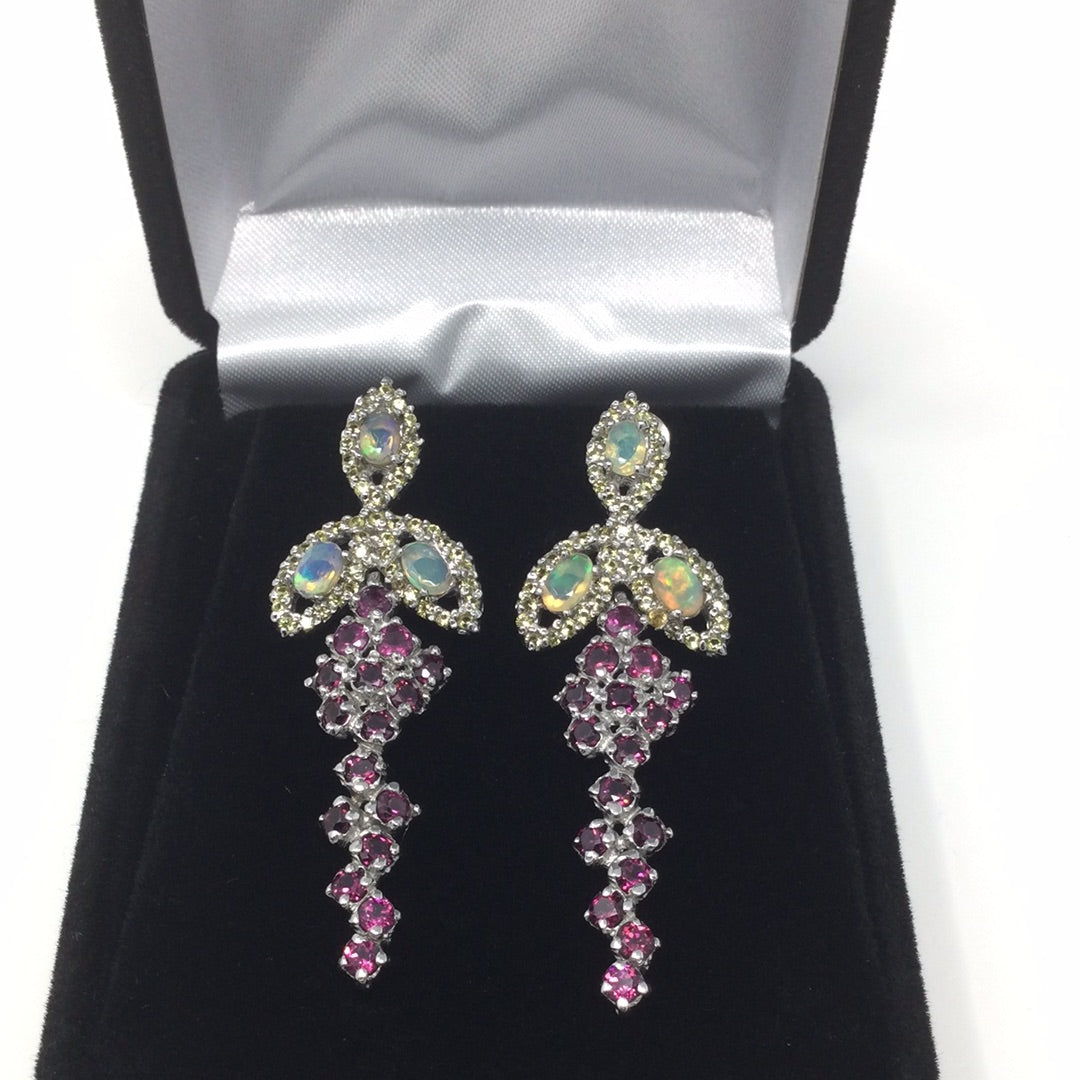 Exquisite top quality genuine gemstones crafted into these enchanting earrings. Frame your face in gemstones for luminescence, these feature, Fiery Opals, Garnets & Sapphires set in .925 sterling silver with a 14K white gold overlay. The graceful sweep of these earrings will define you in class, future heirlooms for your family. Notice the intricate workmanship in these one of a kind artistic earrings.