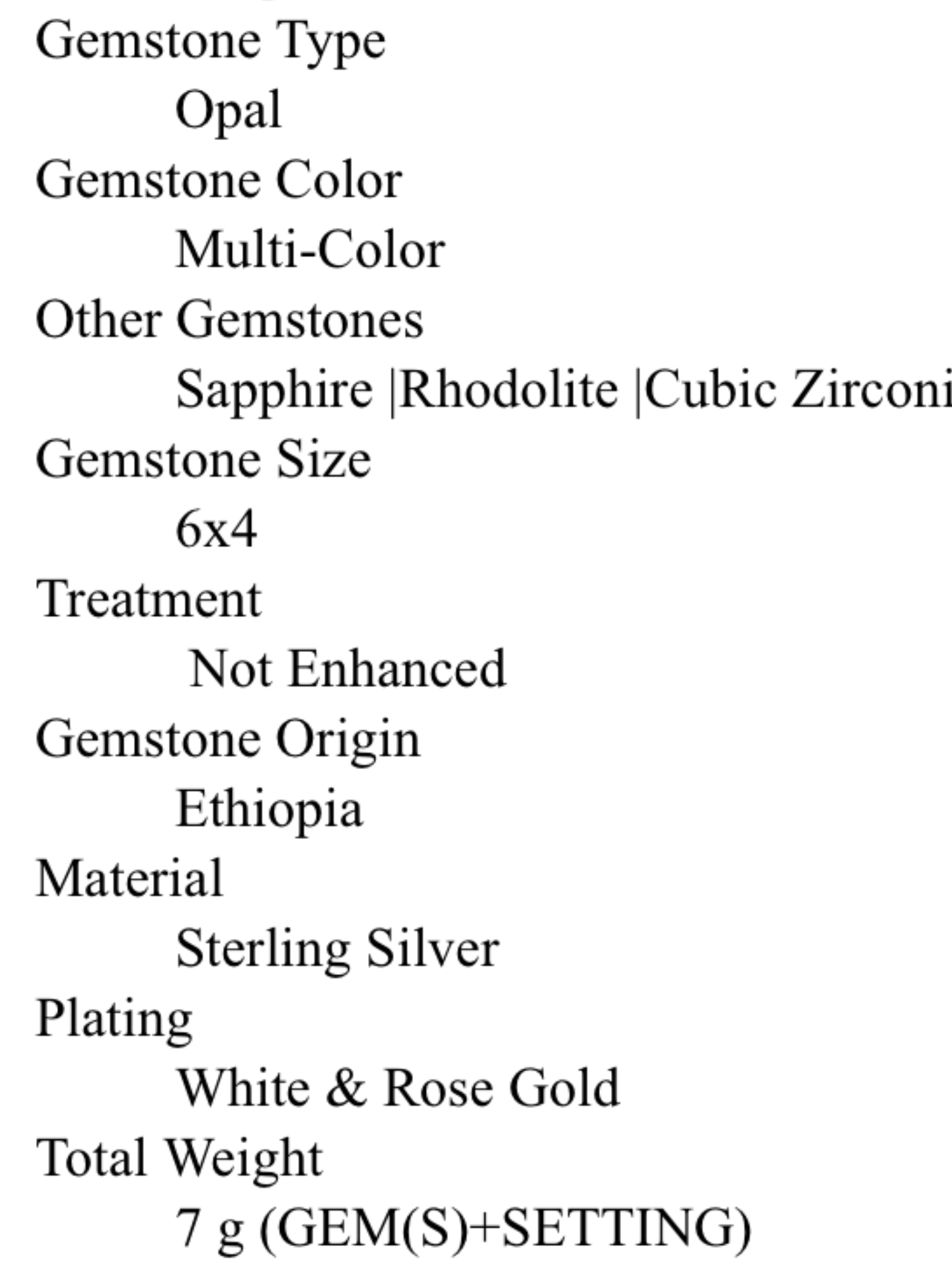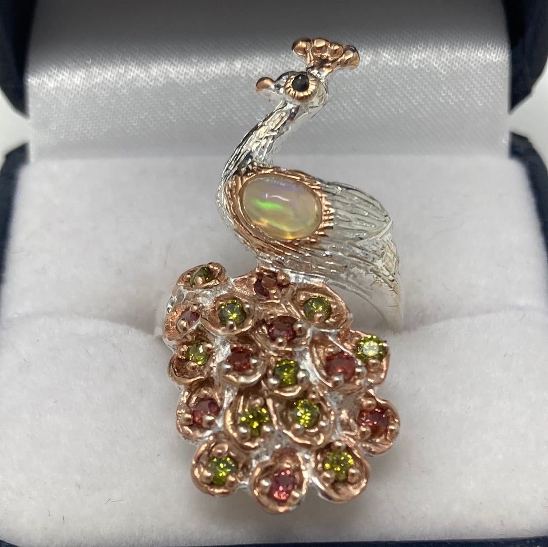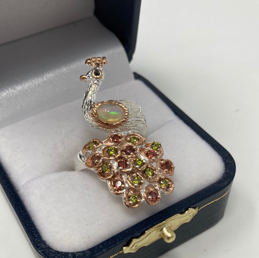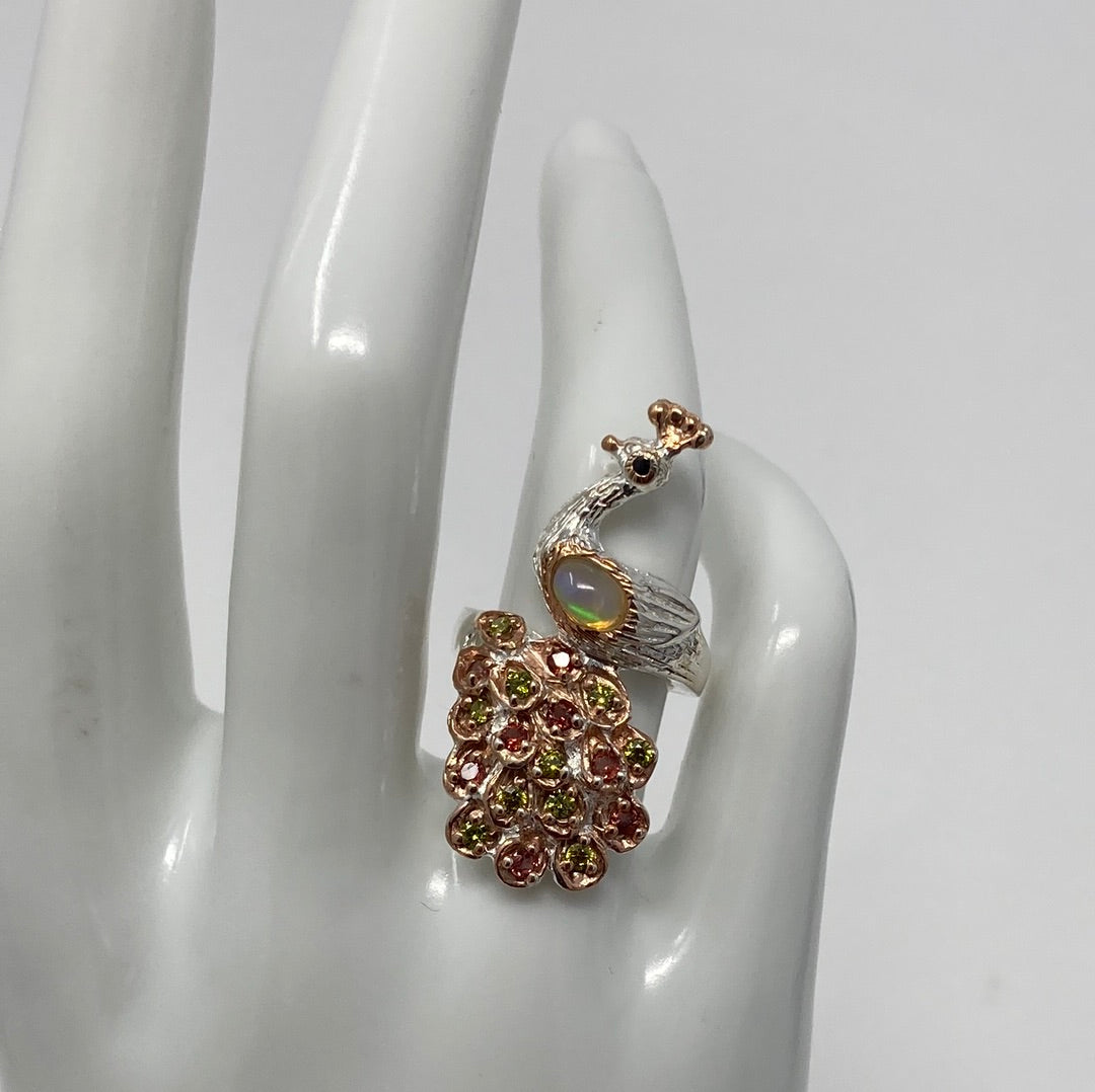 This sweet peacock design features a genuine Opal and an exquisitely designed fanfare of a tail encrusted with genuine Orange Sapphires and Rhodolite Garnets. Interspersed with tiny CZS to accent the gemstones. This beauty is crafted in .925 sterling silver with a Rose Gold overlay. Size 6, Resize at your jeweler or use a ring guard.