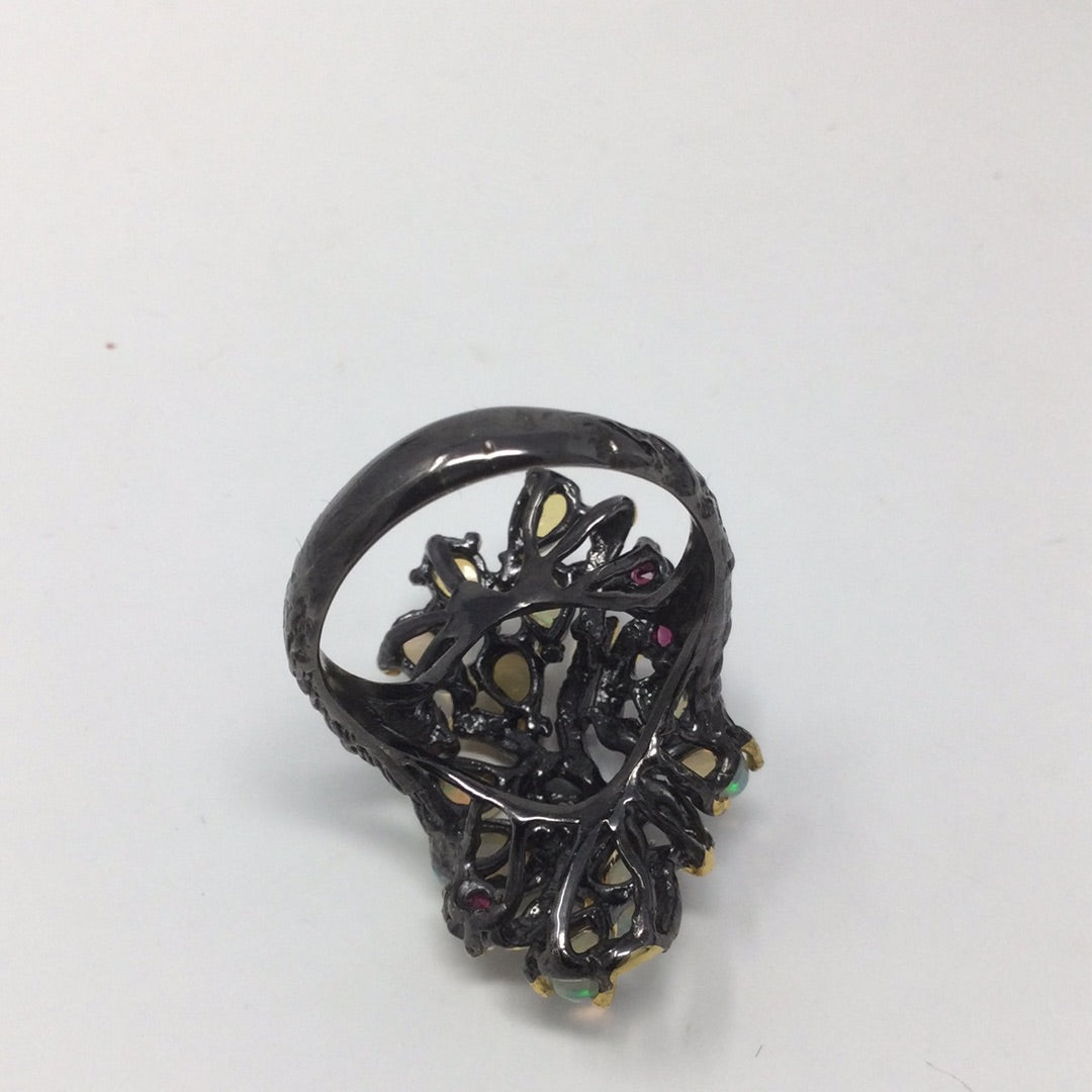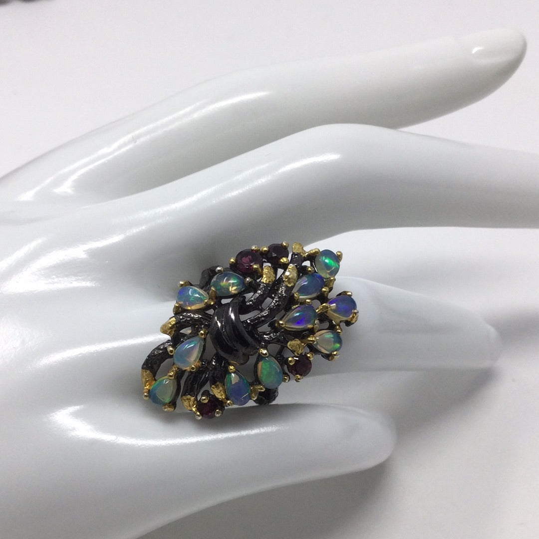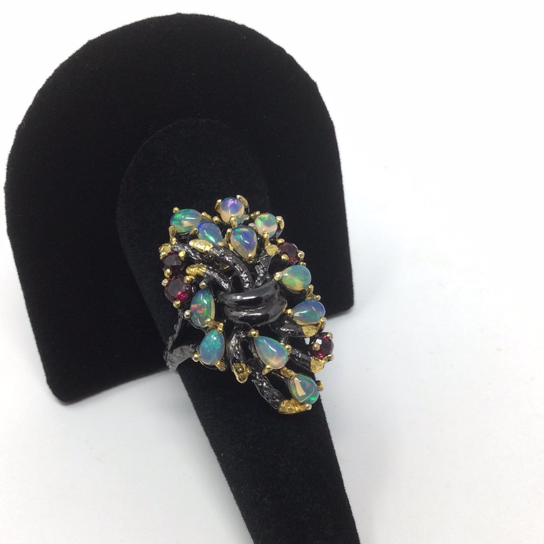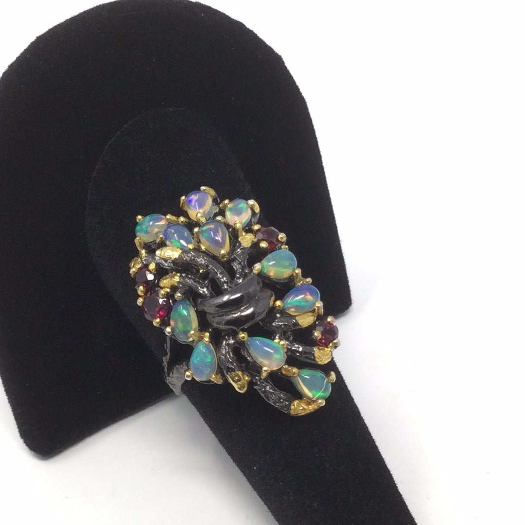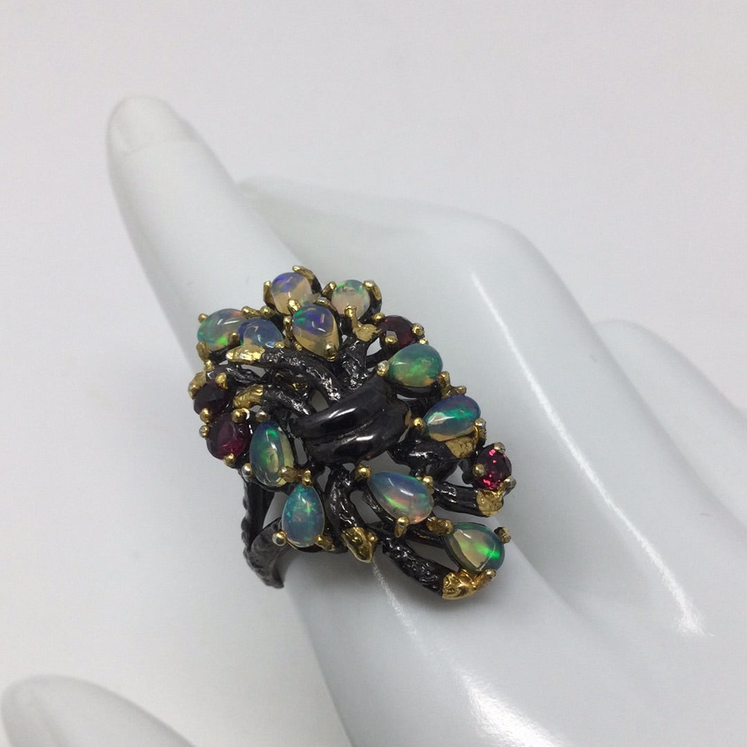 Genuine natural opals that have plentiful opalescence, all natural! A mysterious look of elegance to define your inner artistic side. Each gemstone is hand selected and artfully placed in this .925 setting that has a Rhodium overlay, and 14K yellow gold accents. Watch the video this is a beauty with mystique. My rings are not mass produced and are truly unique for those that don’t want what everybody else is wearing. Size 8, Rrsize at your jeeeler or use a ring guard.