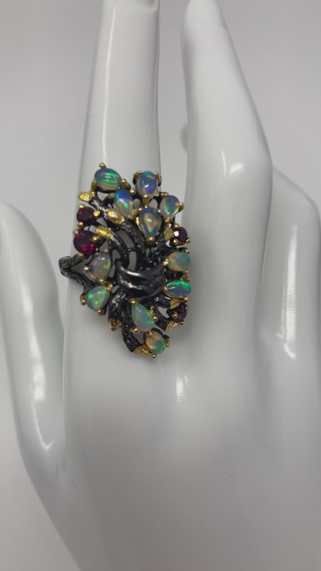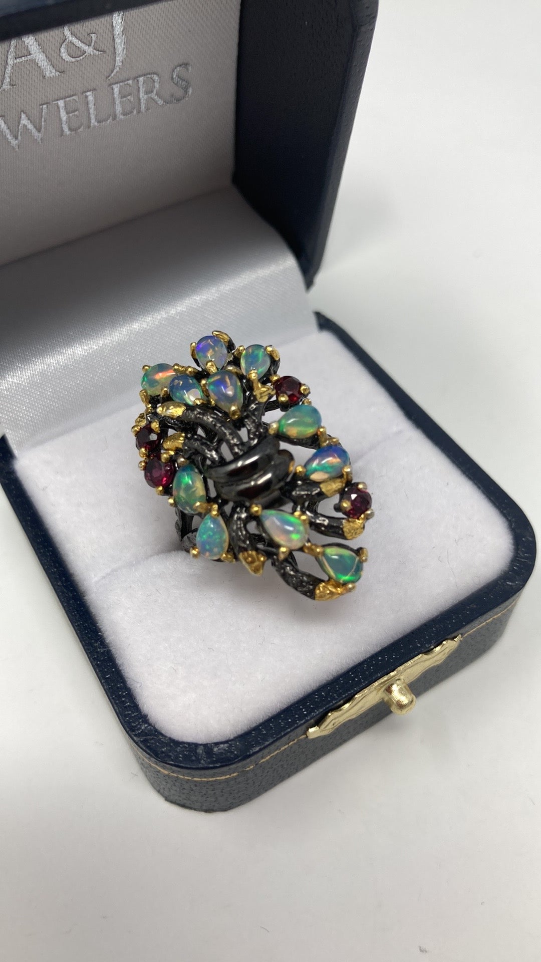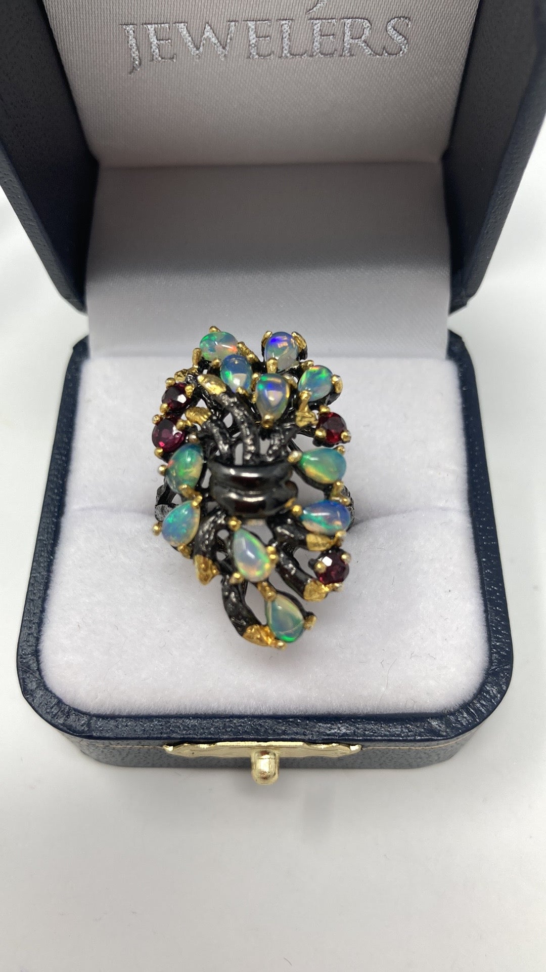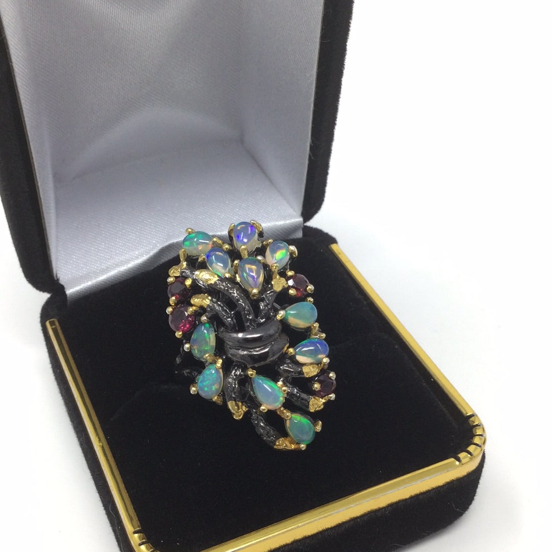 Genuine natural opals that have plentiful opalescence, all natural! A mysterious look of elegance to define your inner artistic side. Each gemstone is hand selected and artfully placed in this .925 setting that has a Rhodium overlay, and 14K yellow gold accents. Watch the video this is a beauty with mystique. My rings are not mass produced and are truly unique for those that don’t want what everybody else is wearing. Size 8, Rrsize at your jeeeler or use a ring guard.