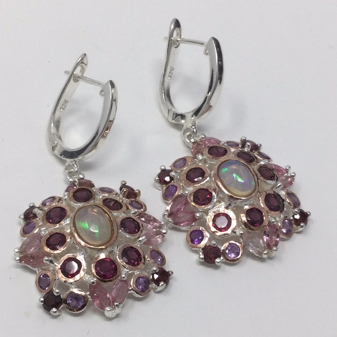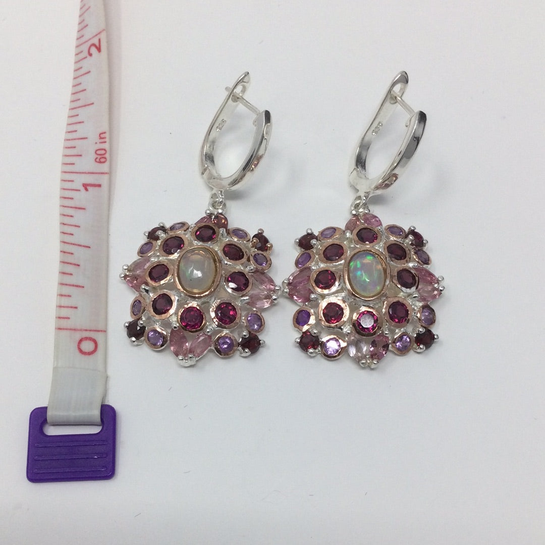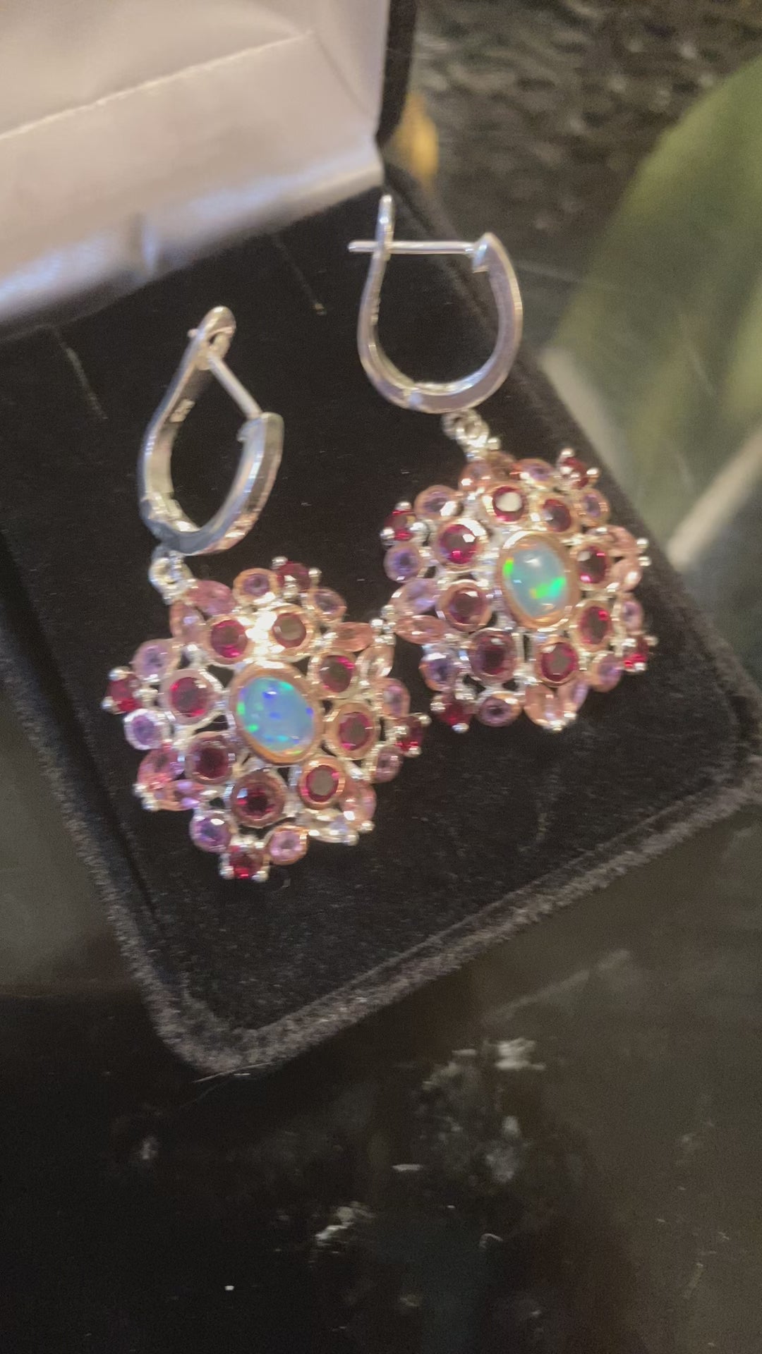 Spectacular genuine fiery Opals, Pink Tourmalines, Amethysts and Garnets! A magnificent way to frame your face ! You will light up the room in luminescence. Watch the video of these fabulous earrings, custom crafted, a one of a kind masterpiece. Invest in genuine gemstones. Approximately 1” long.