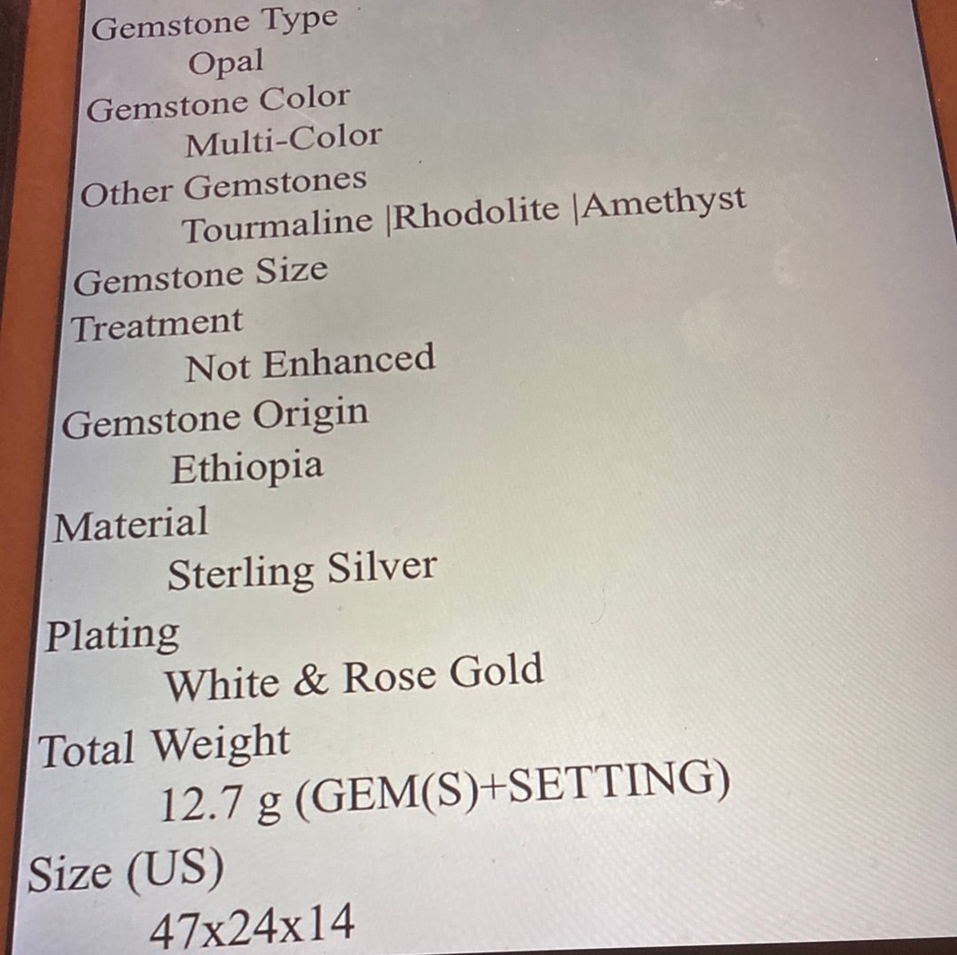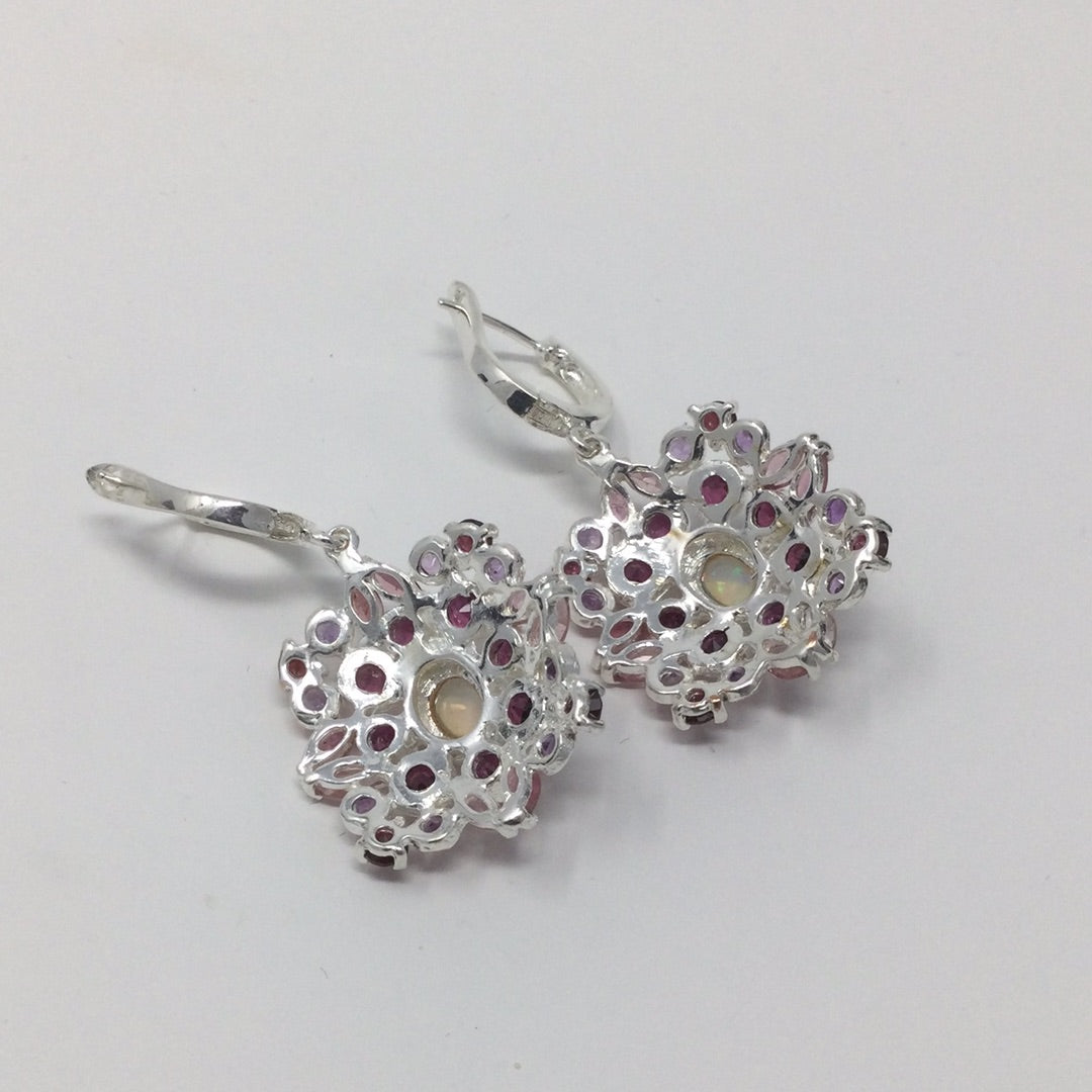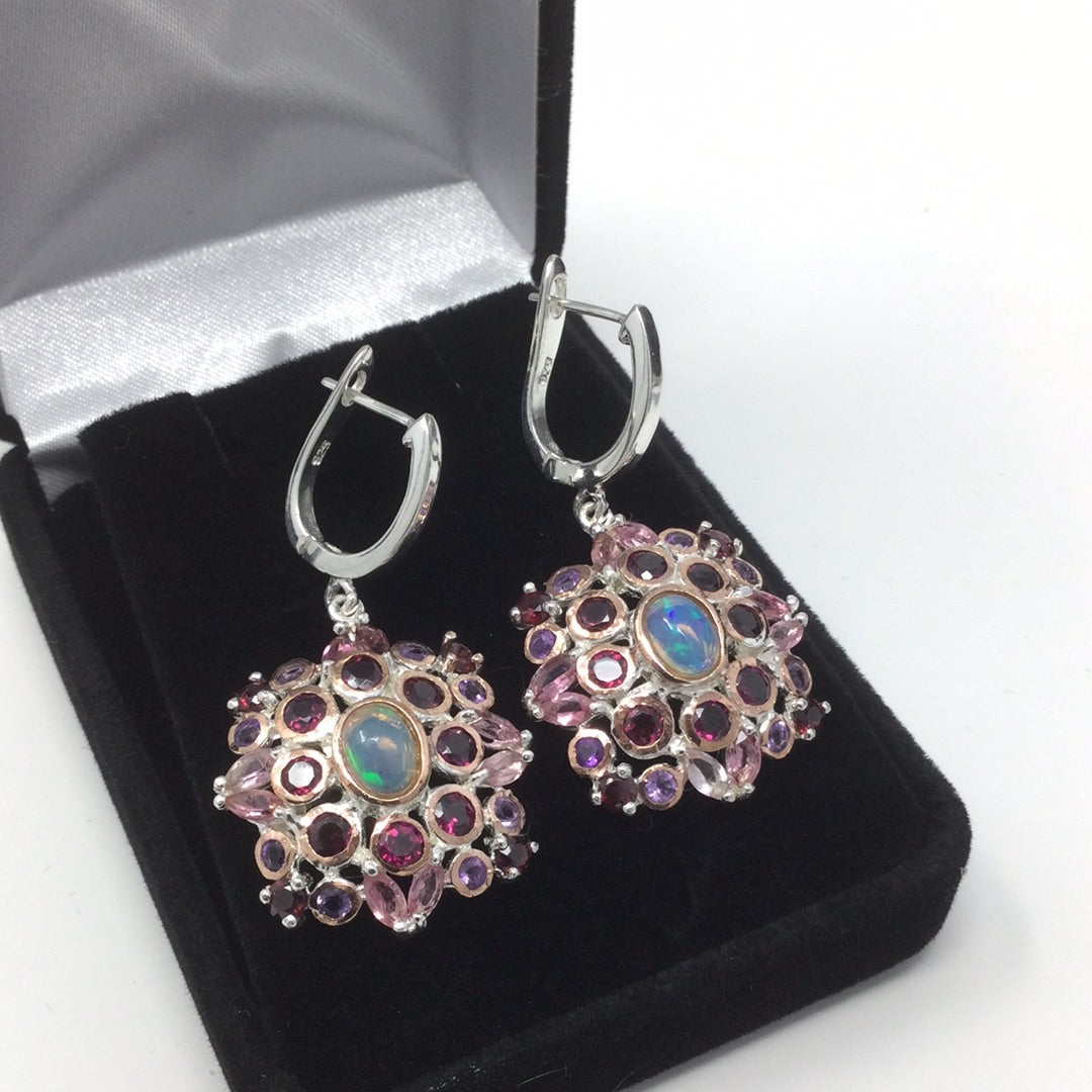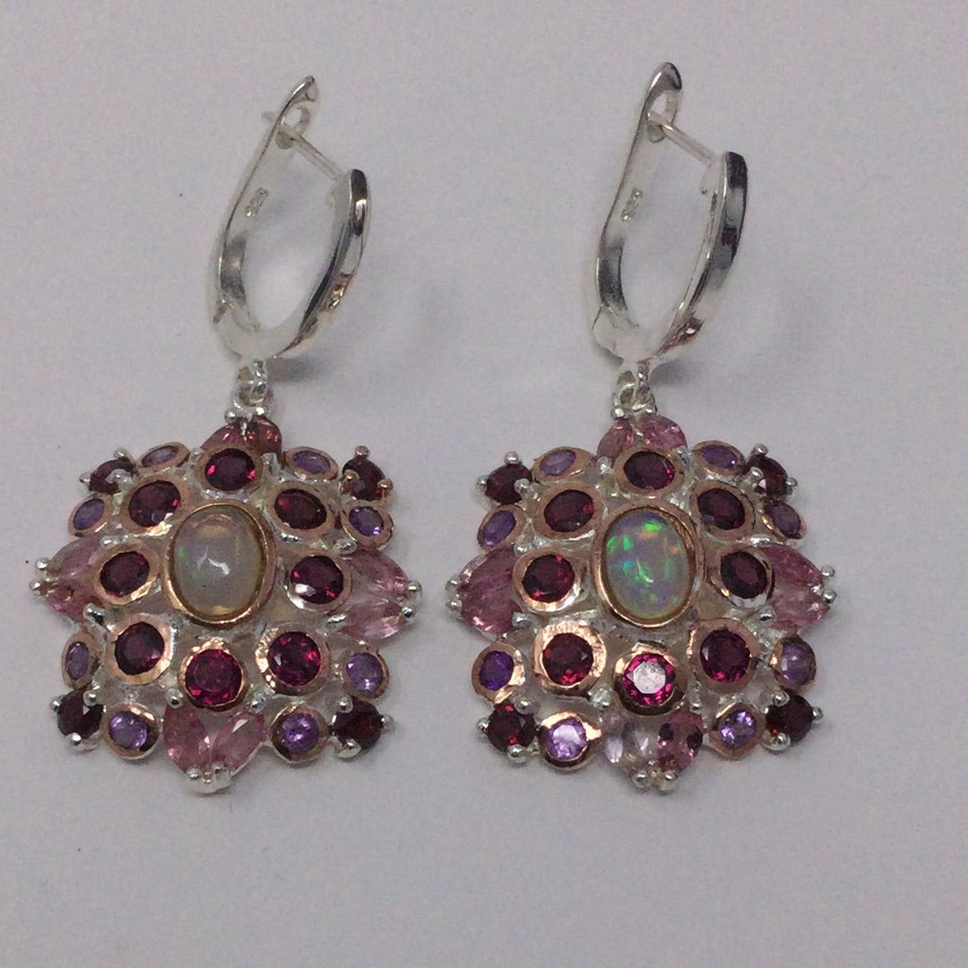 Spectacular genuine fiery Opals, Pink Tourmalines, Amethysts and Garnets! A magnificent way to frame your face ! You will light up the room in luminescence. Watch the video of these fabulous earrings, custom crafted, a one of a kind masterpiece. Invest in genuine gemstones. Approximately 1” long.