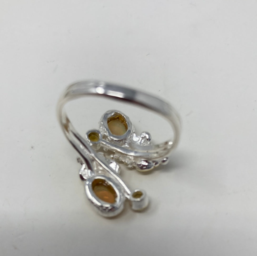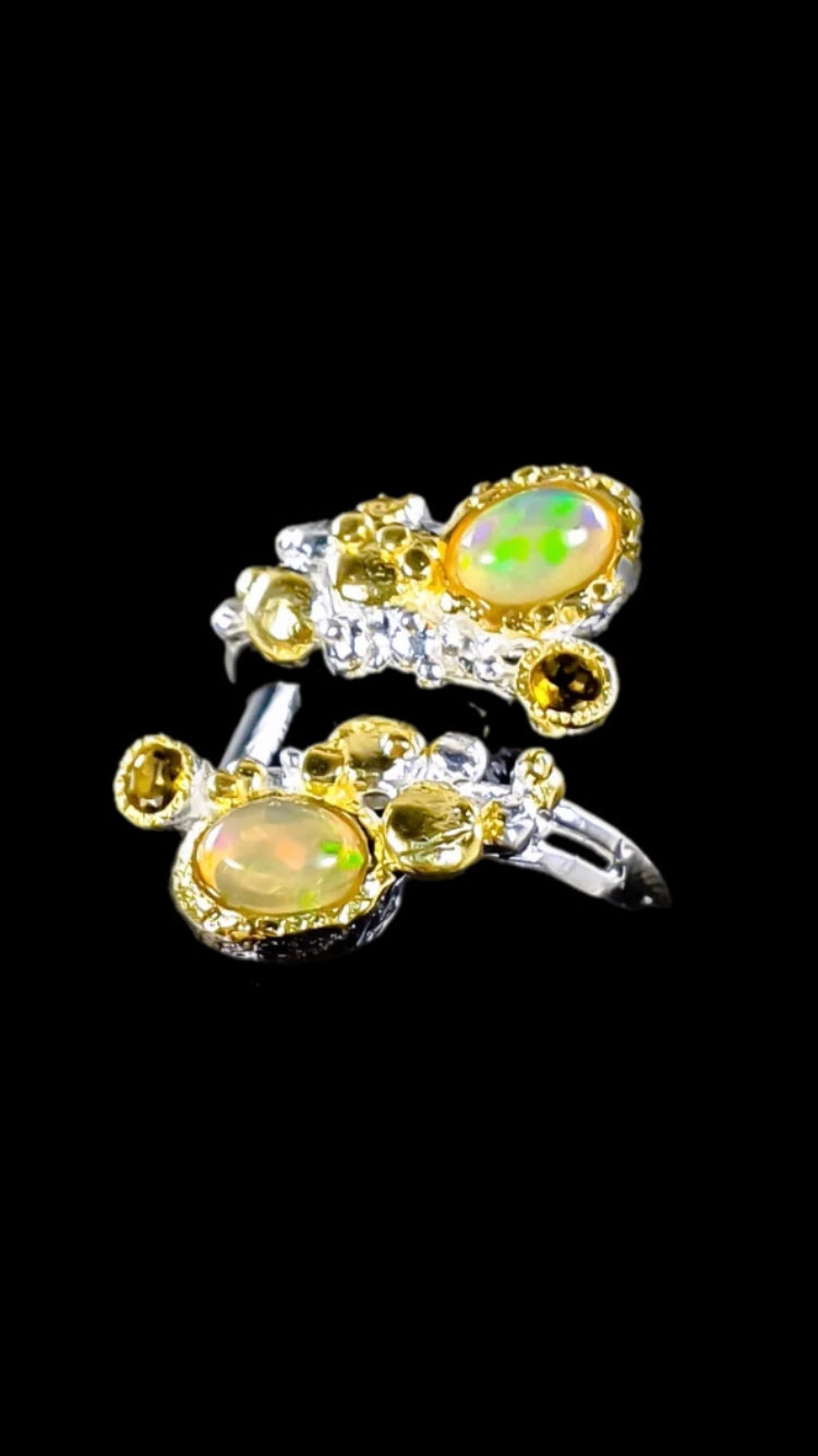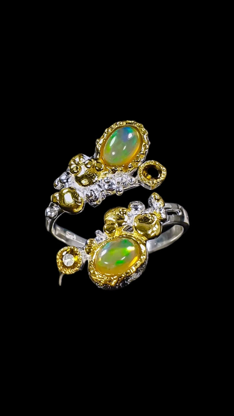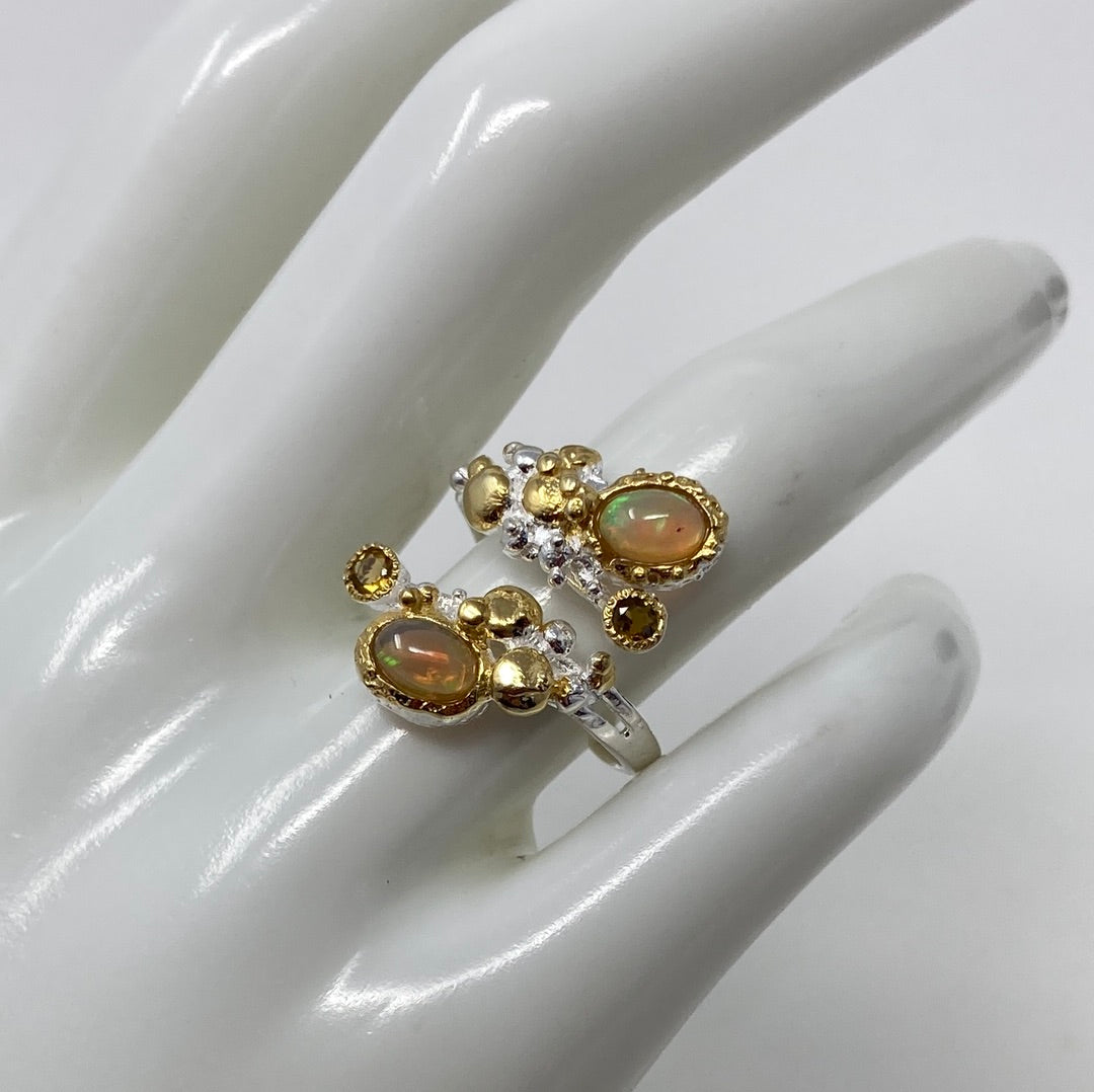 Super classy and elegant, this contemporary styled, hand crafted ring. A one of a kind that is crafted by the talented artisan I’ve done business with for over ten years. Custom made, one of a kind, crafted in . 925 Sterling Silver with accents of yellow gold. This ring feature gorgeous Opals measuring 6mm by 4mm with lots of natural occurring opalescence. Size 7 1/2