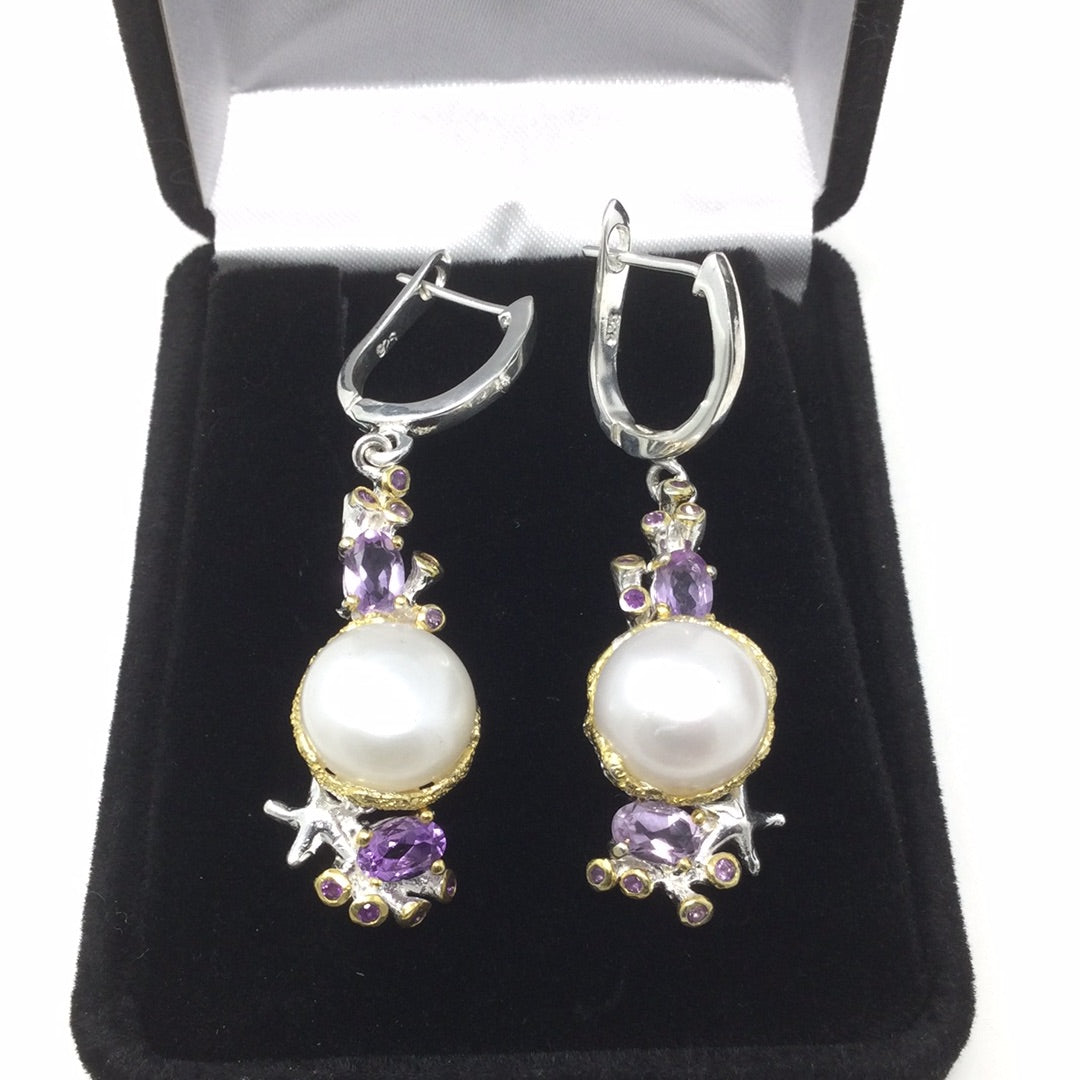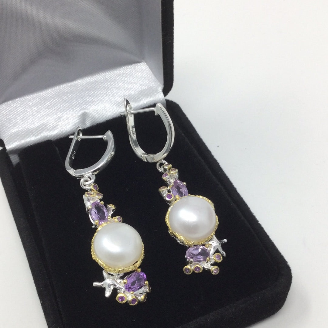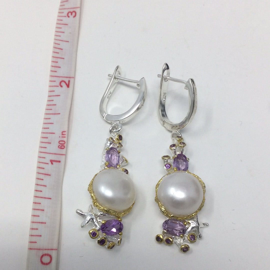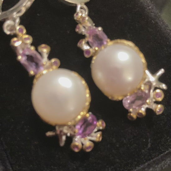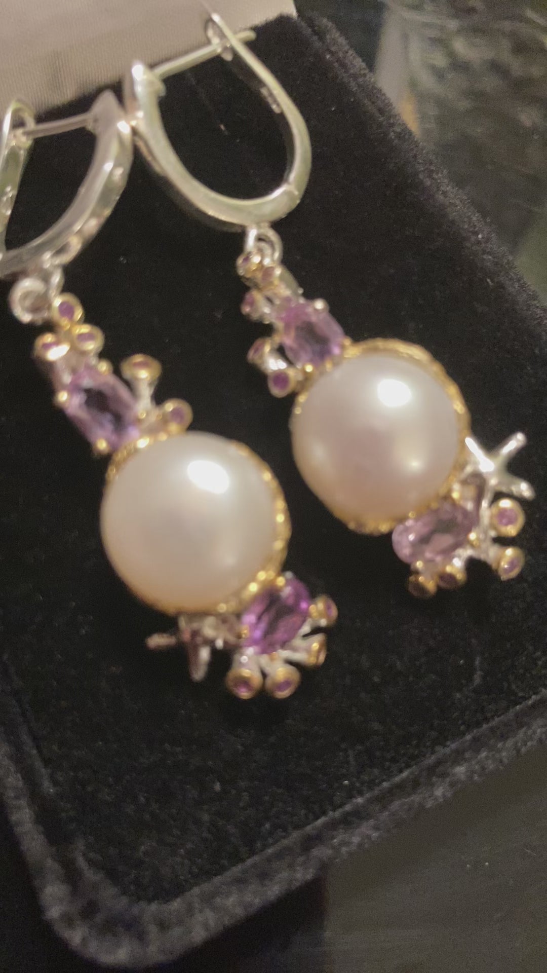 Totally luscious genuine 12mm creamy, Freshwater Pearls earrings accented with genuine faceted Amethysts. These pearls are a nice size, approximately 12mm set in .925 sterling silver with accents of yellow gold too. Every jewelry box should contain some interesting pearls, a cut above the rest. These jewel encrusted pearls are future heirlooms for your family and they’re custom made, one of a kind, never mass produced. We believe in special here at Gem House Studios and everyone is a unique work of art. Approximately 1 1/2” Long