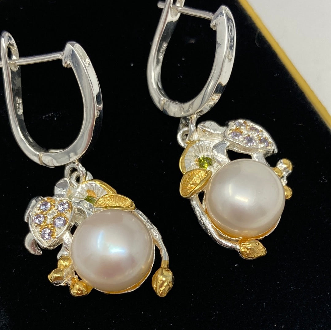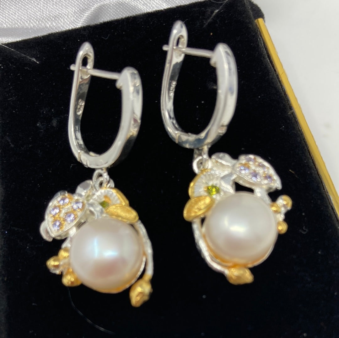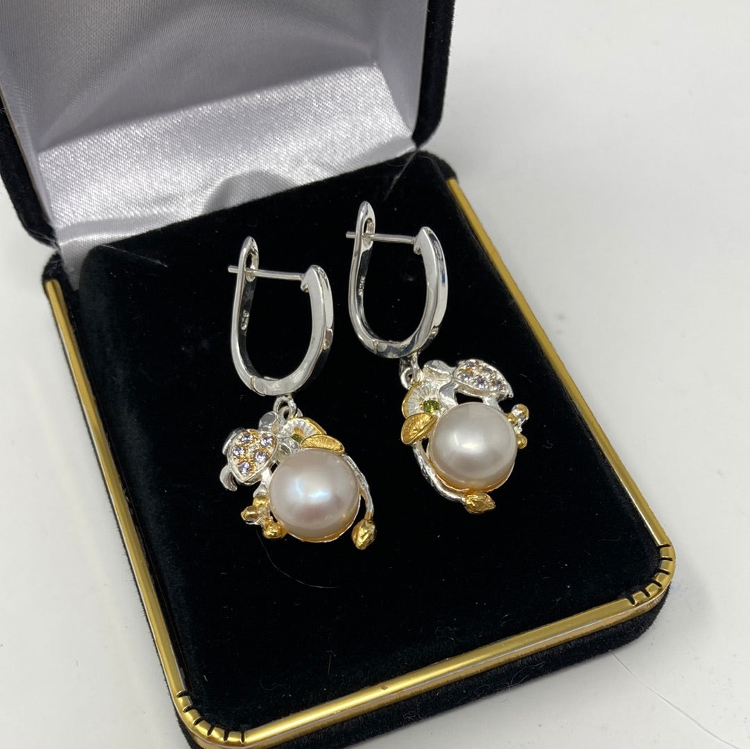 Every girl needs some classic genuine Pearl earrings in her jewelry box. It is a celebration of class and elegance. Your Audrey Hepburn moments for impact and romance. These genuine pearls are set in a .925 setting which a white and yellow gold overlay for durability and beauty. Accented with tiny sparking CZS to showcase the Pearls.