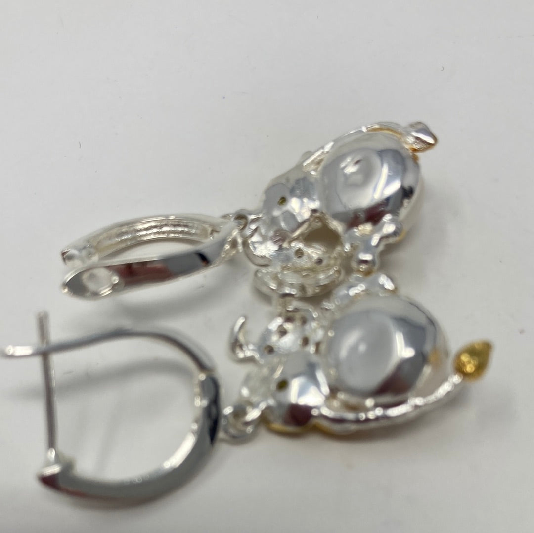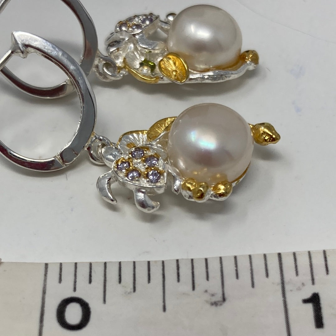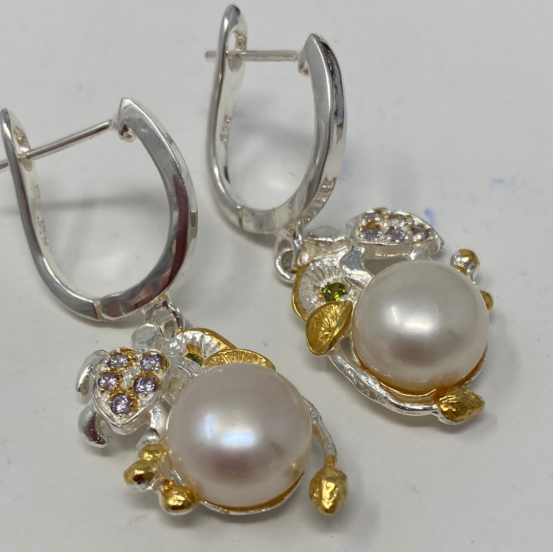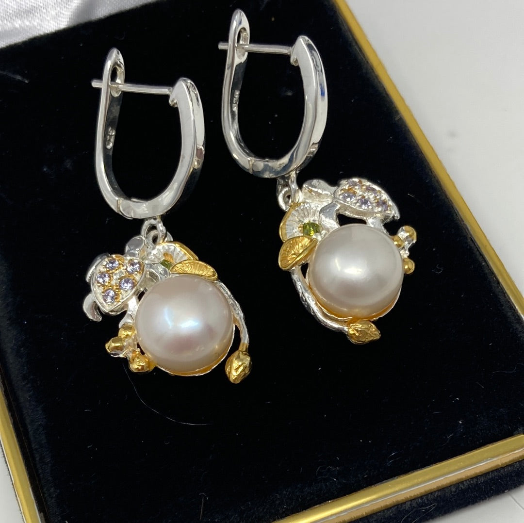 Every girl needs some classic genuine Pearl earrings in her jewelry box. It is a celebration of class and elegance. Your Audrey Hepburn moments for impact and romance. These genuine pearls are set in a .925 setting which a white and yellow gold overlay for durability and beauty. Accented with tiny sparking CZS to showcase the Pearls.