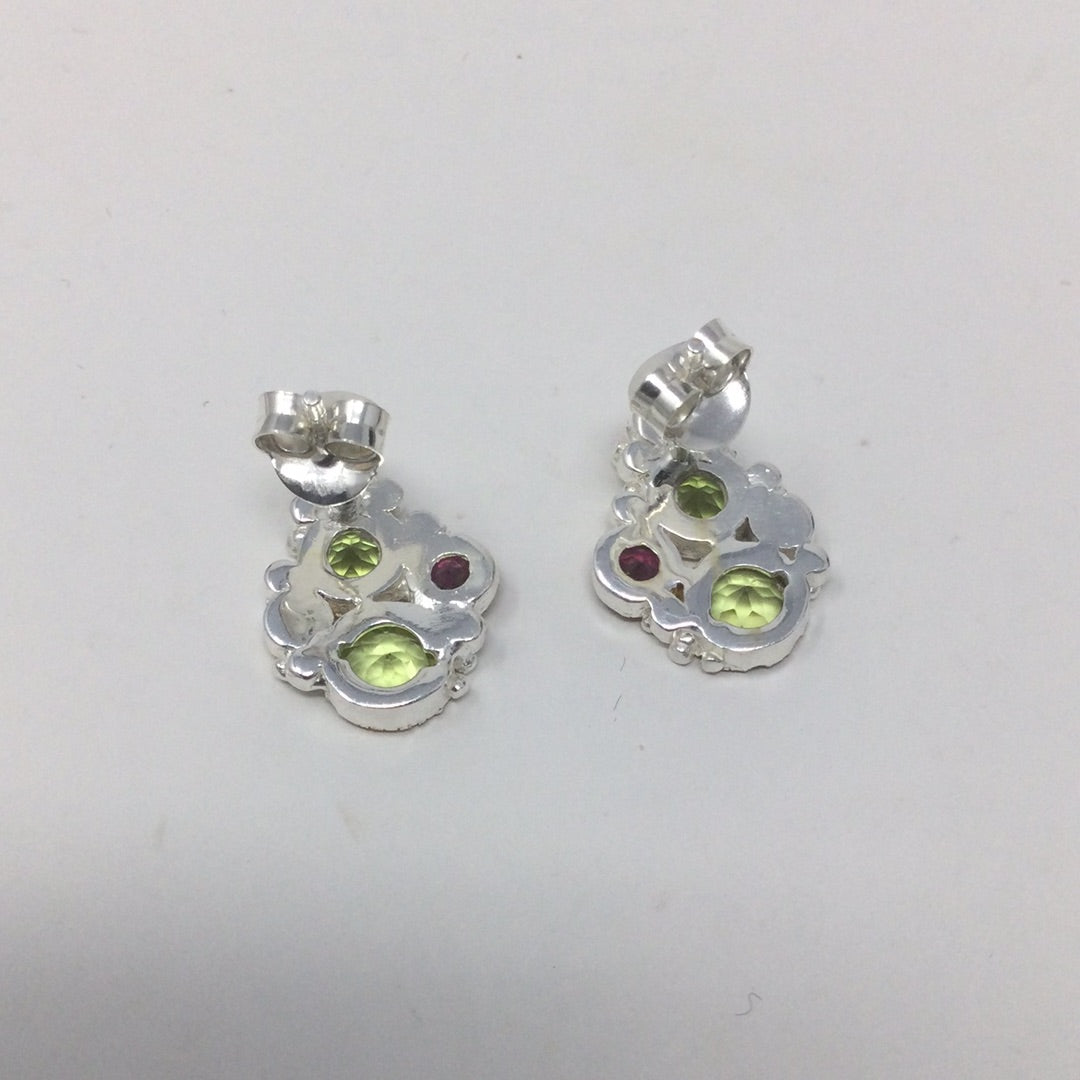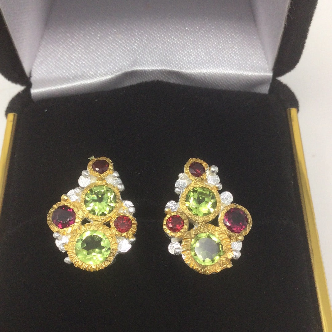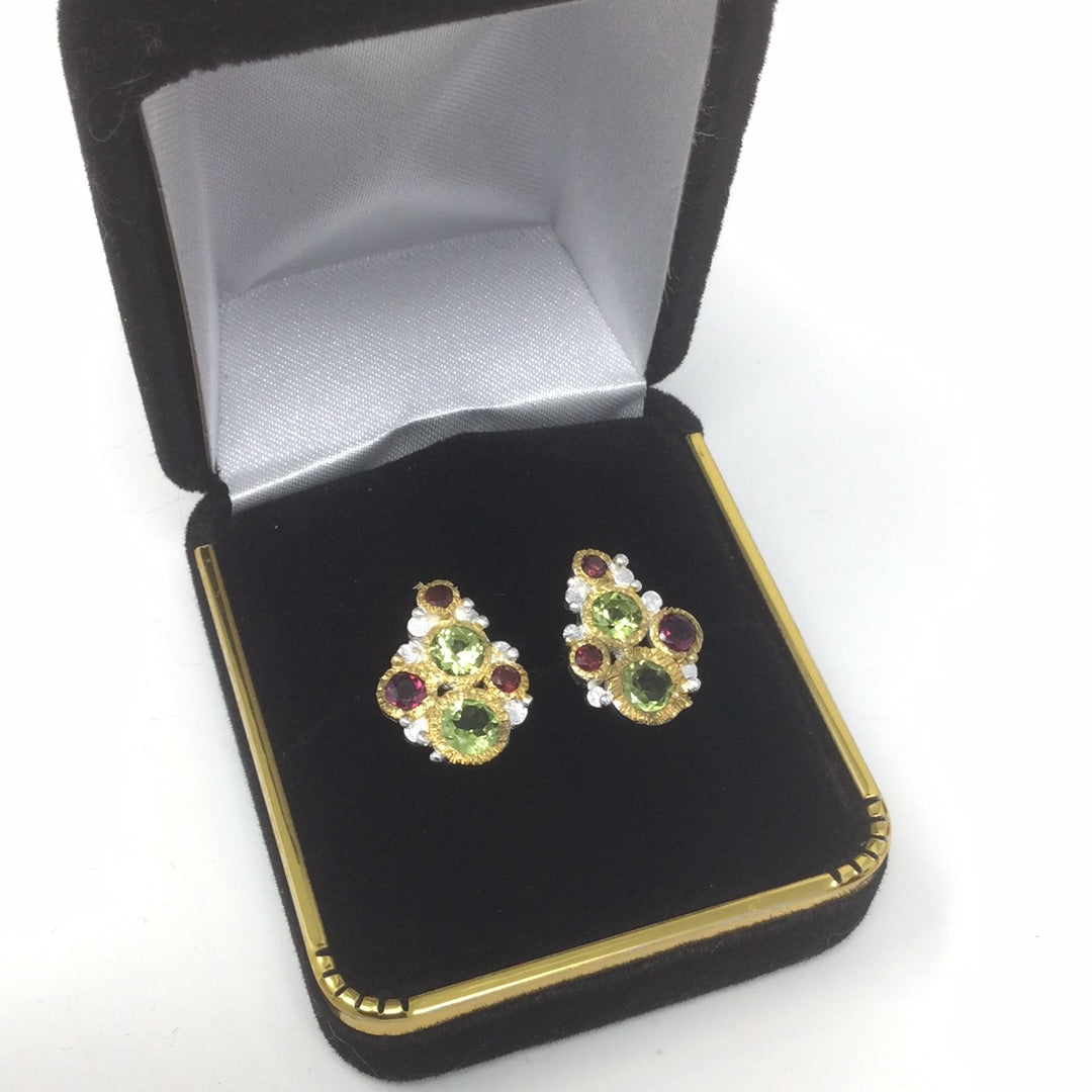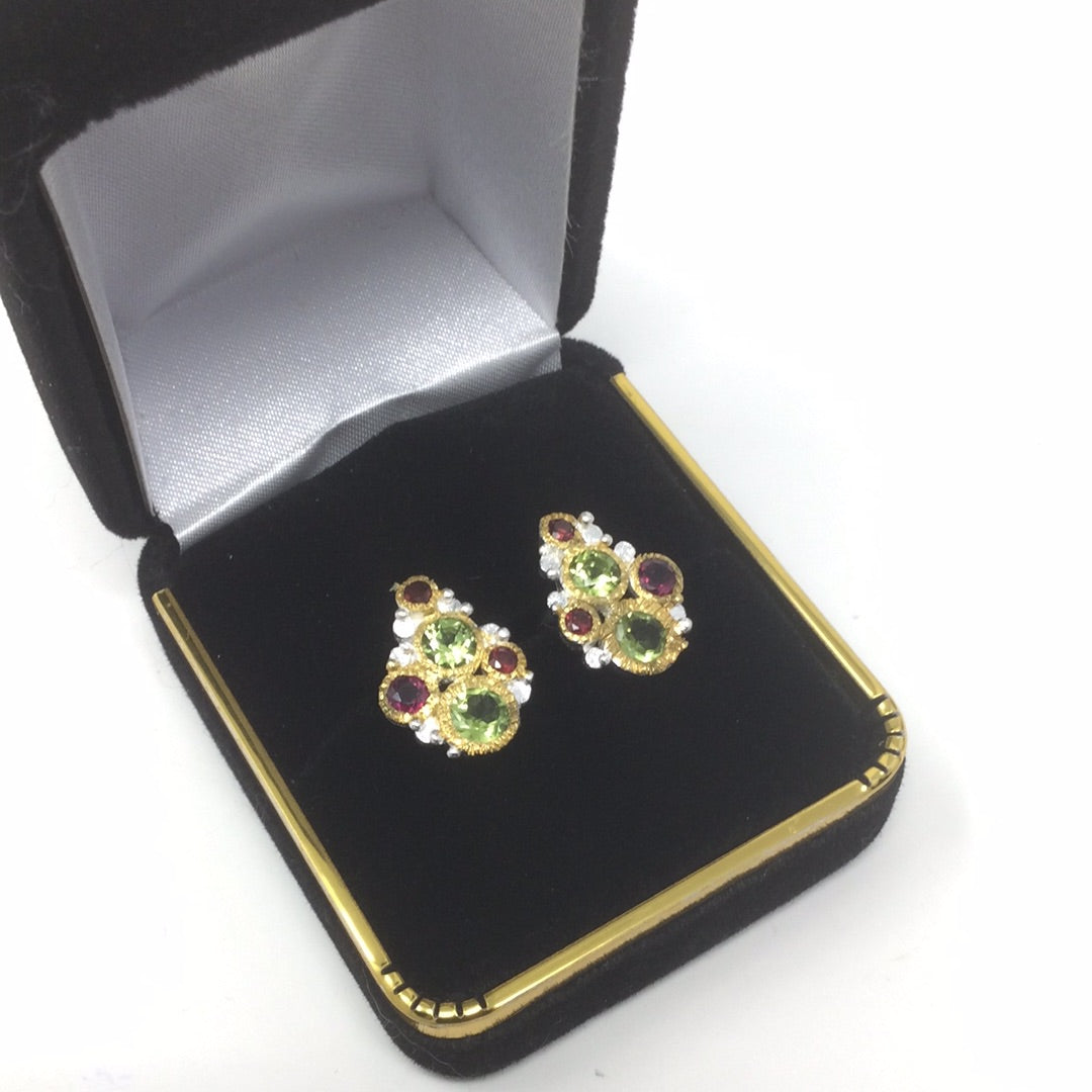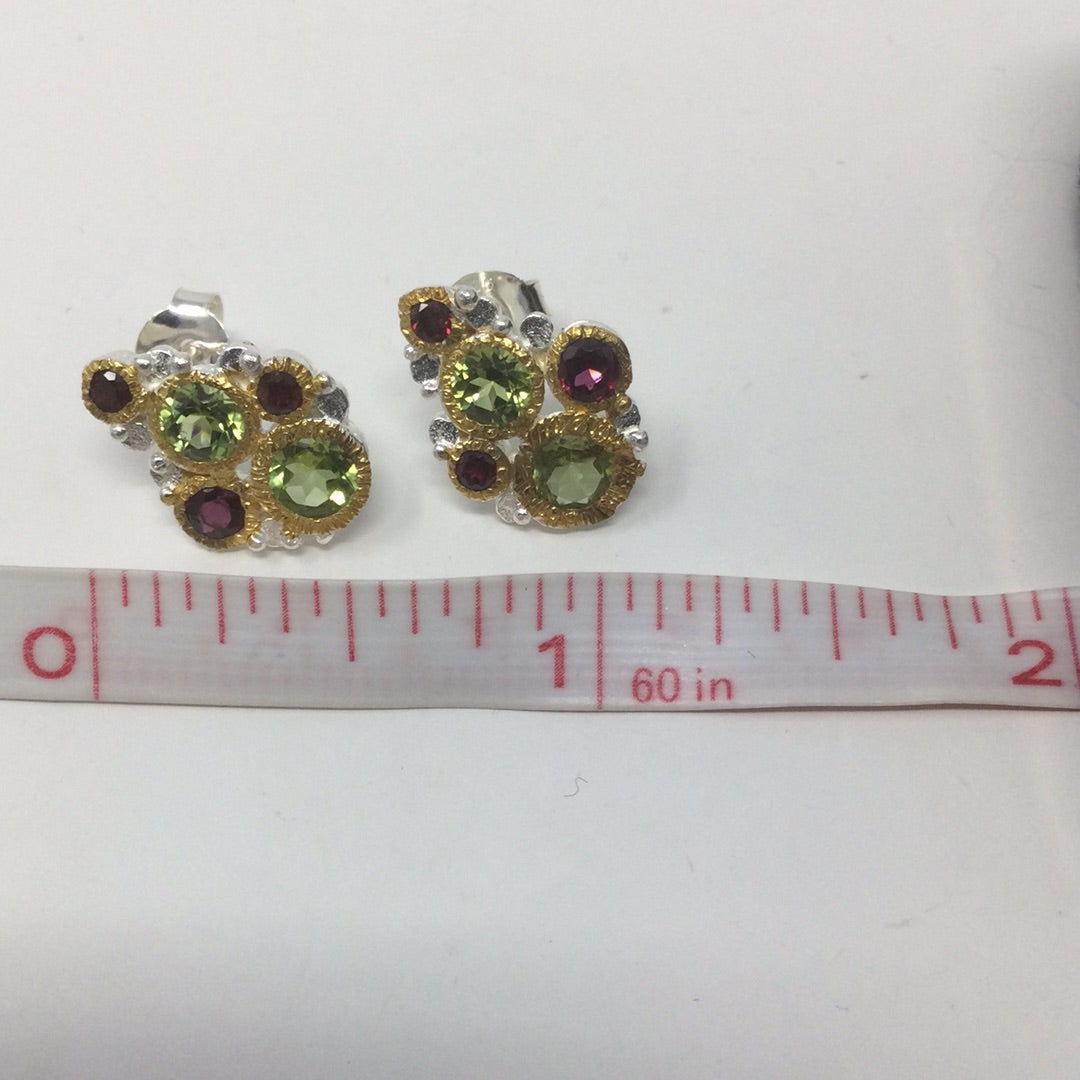 Exceptional genuine gemstones in this passionate combination, fiery Garnets with the cooling of Peridot. These will frame your face in an exquisite way that will enhance and elevate your whole look. Set in .925 sterling silver with a white and yellow gold overlay. Invest in genuine gemstones, a lifetime of style and good taste.
