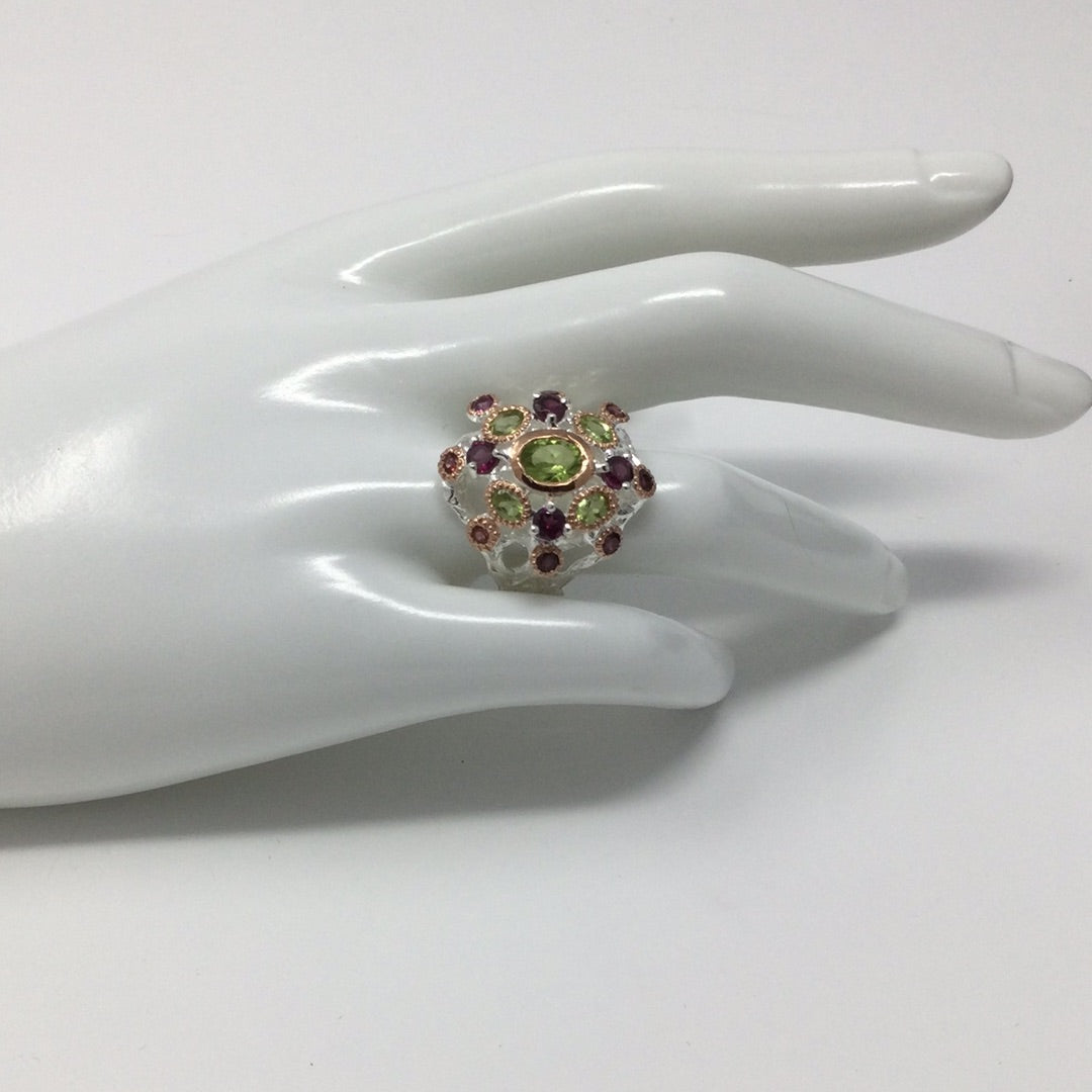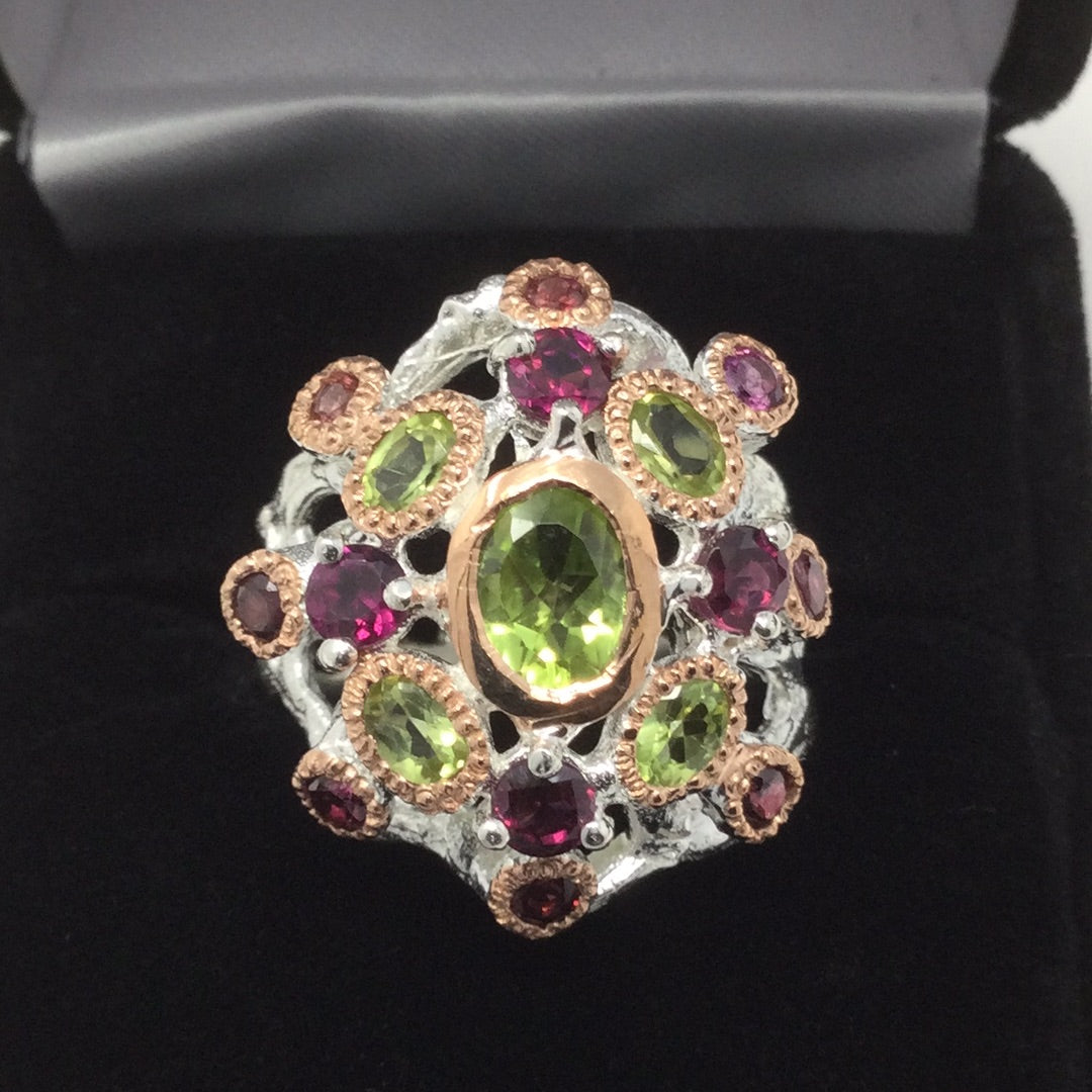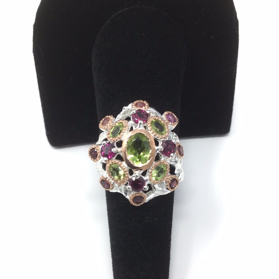 A majestic jeweled ring that is a special gemstone treasure, featuring genuine Peridot and Rhodolite Garnets. This is a powerhouse of stunning jewels, set in .925 sterling silver with a 14K white gold overlay. Heads will turn, it looks like something from the Crown Jewels. Each gemstone is encircled with yellow gold, it’s those details that separate this collection of jewelry apart from others. This is a custom made one of a kind. Size 8, Can be resized at your jeweler.