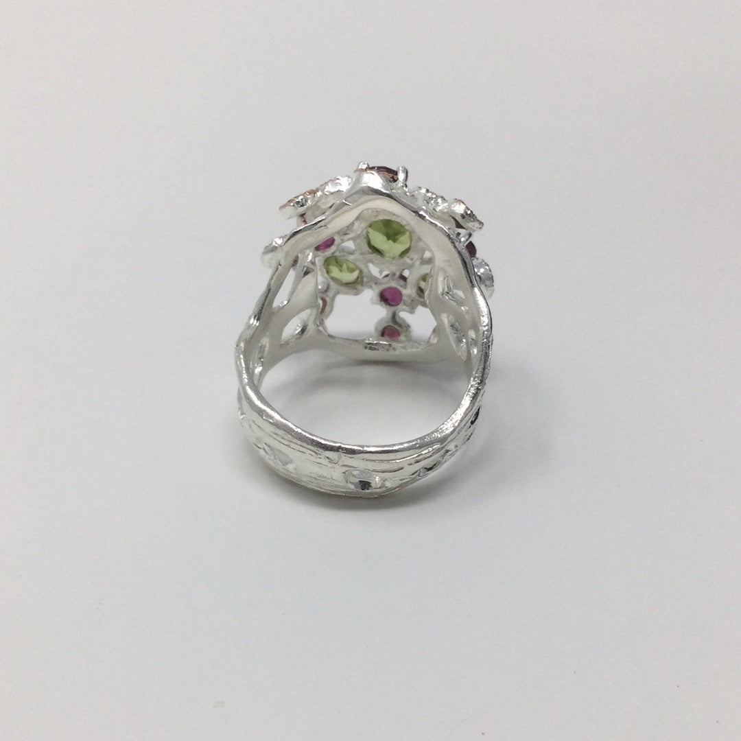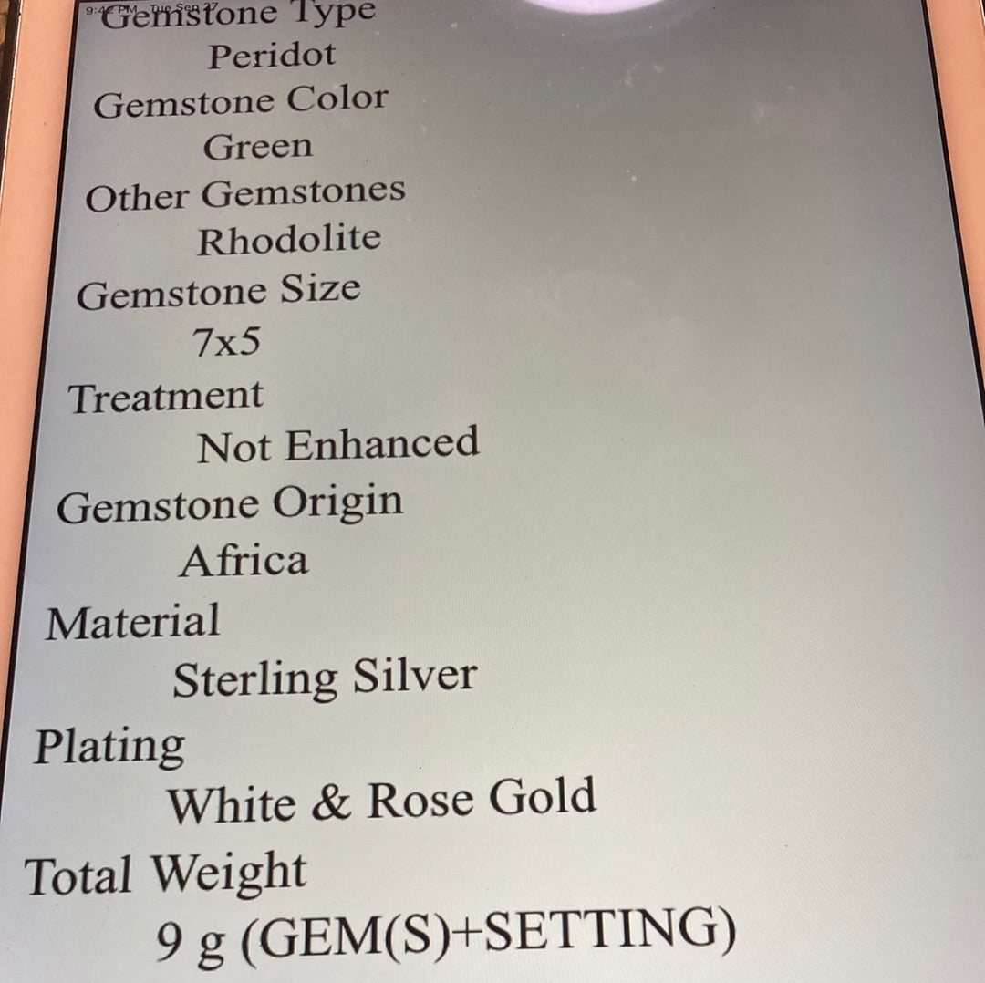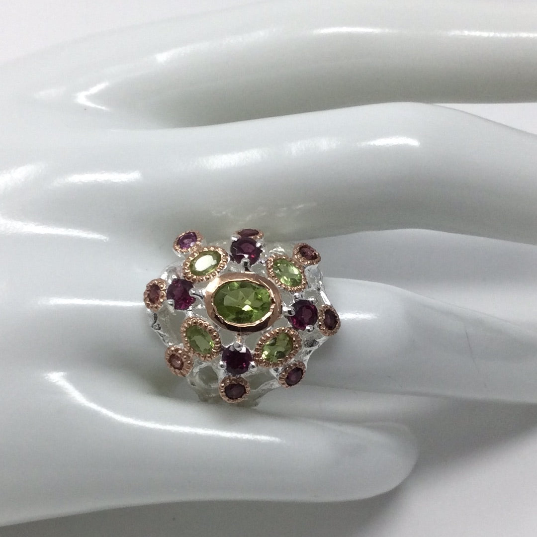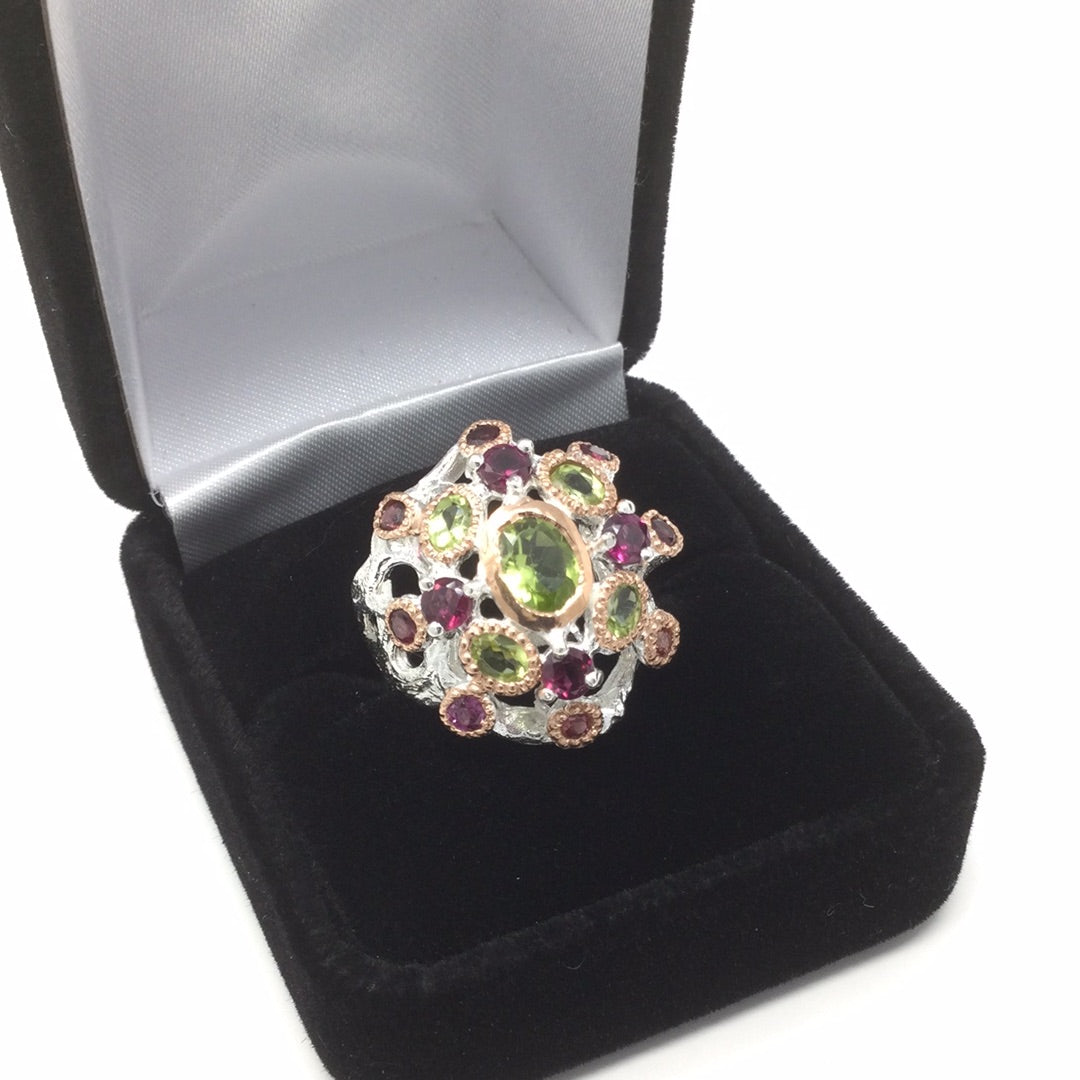 A majestic jeweled ring that is a special gemstone treasure, featuring genuine Peridot and Rhodolite Garnets. This is a powerhouse of stunning jewels, set in .925 sterling silver with a 14K white gold overlay. Heads will turn, it looks like something from the Crown Jewels. Each gemstone is encircled with yellow gold, it’s those details that separate this collection of jewelry apart from others. This is a custom made one of a kind. Size 8, Can be resized at your jeweler.