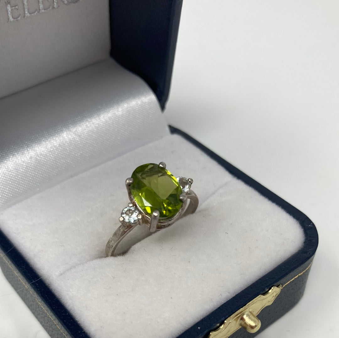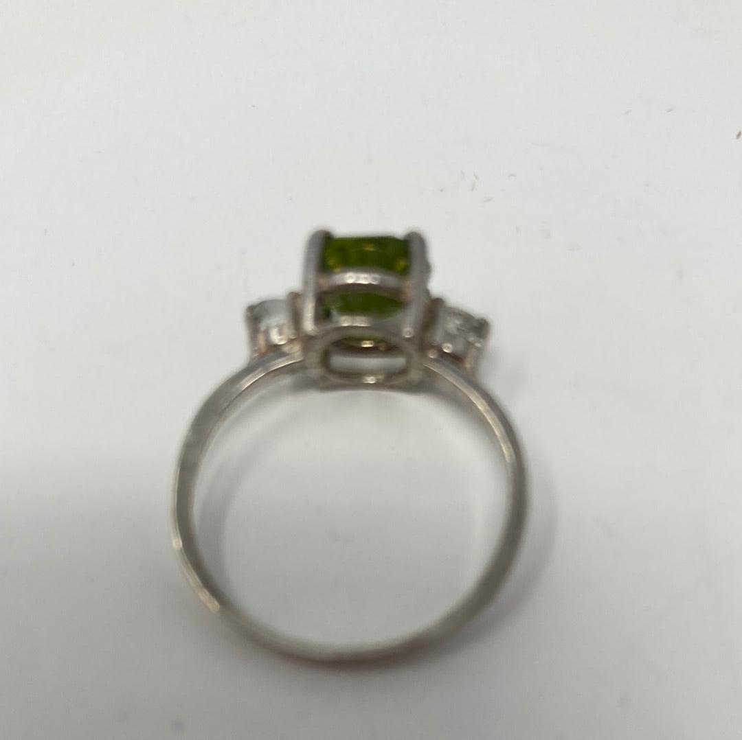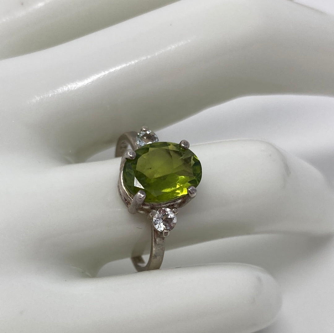 This is a top quality 8mm by 10mm Genuine Peridot flanked by Genuine Aquamarines. It is a symphony of gemstones in this custom made, one of a kind work of art. Set in .925 sterling silver, this classy setting is sure to elevate your look. Always invest in genuine gemstones. Size 7, resize at your jeweler.