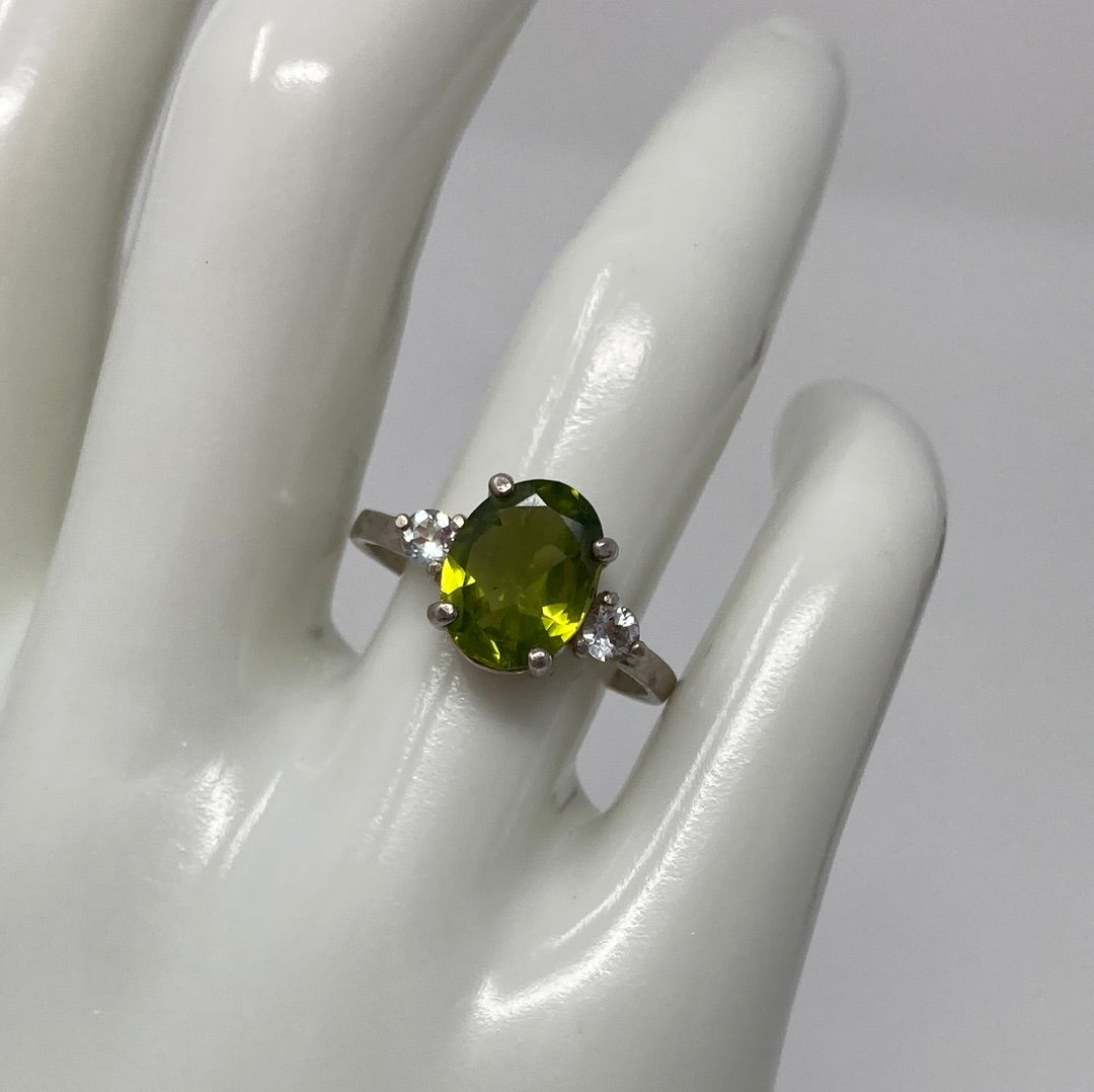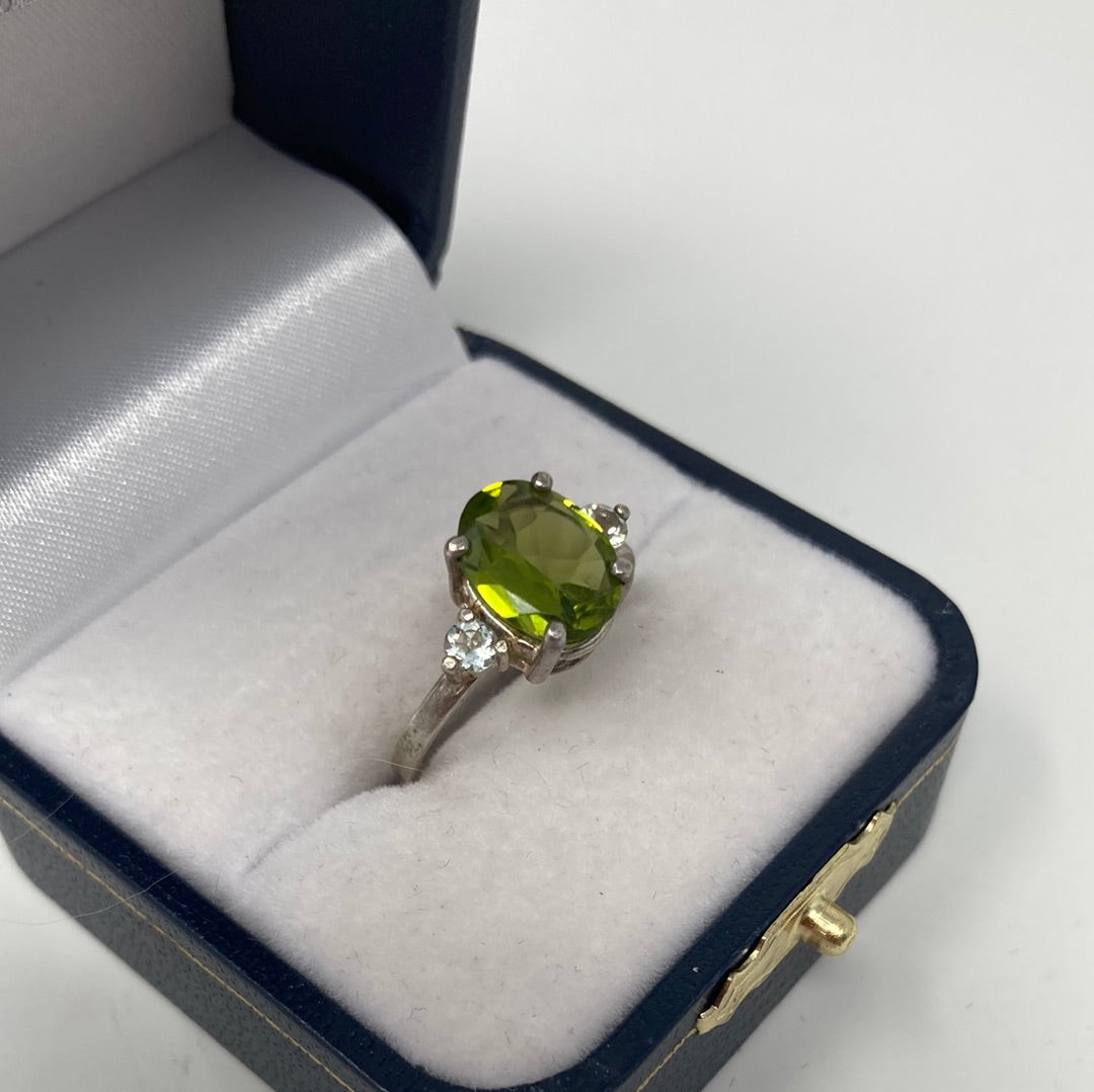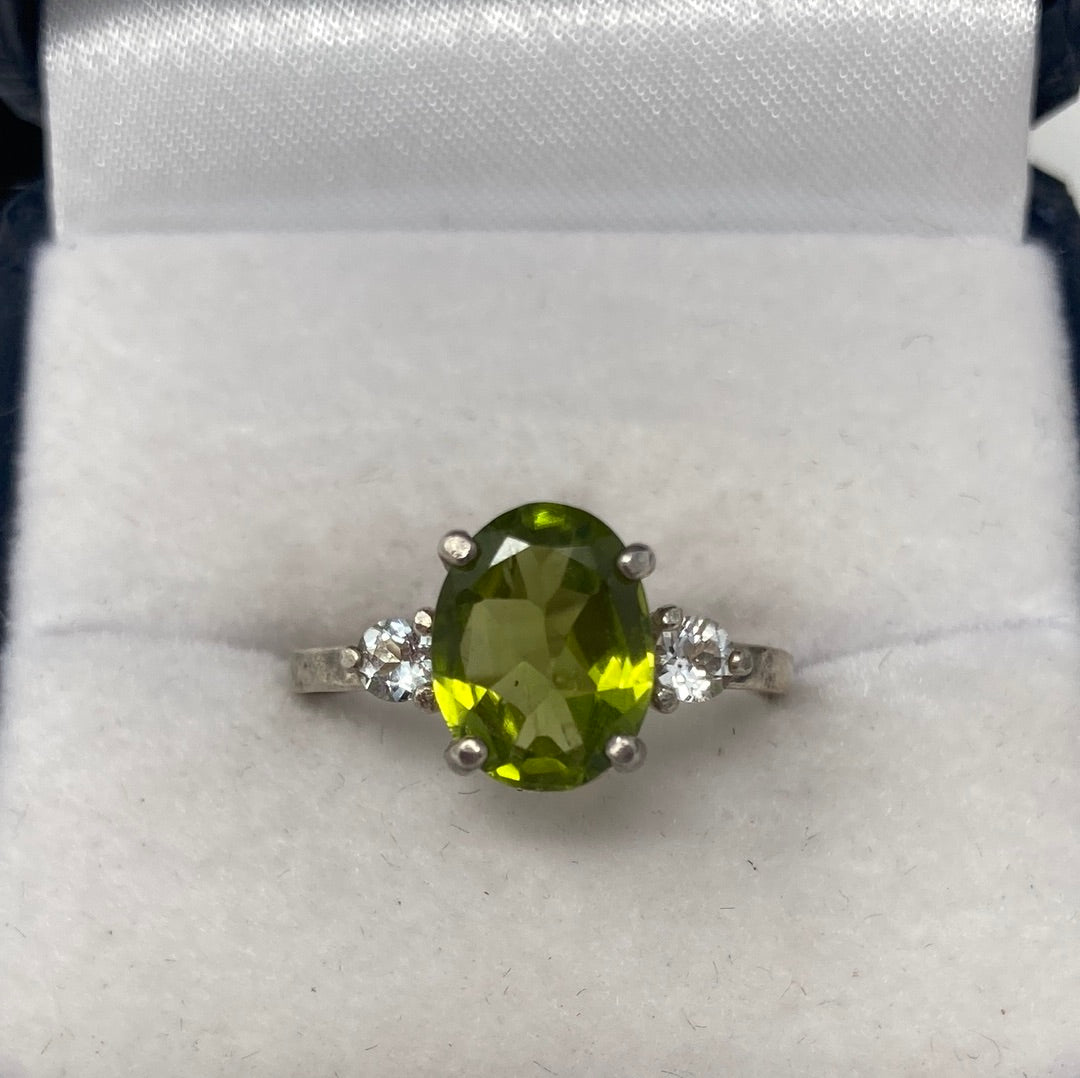 This is a top quality 8mm by 10mm Genuine Peridot flanked by Genuine Aquamarines. It is a symphony of gemstones in this custom made, one of a kind work of art. Set in .925 sterling silver, this classy setting is sure to elevate your look. Always invest in genuine gemstones. Size 7, resize at your jeweler.