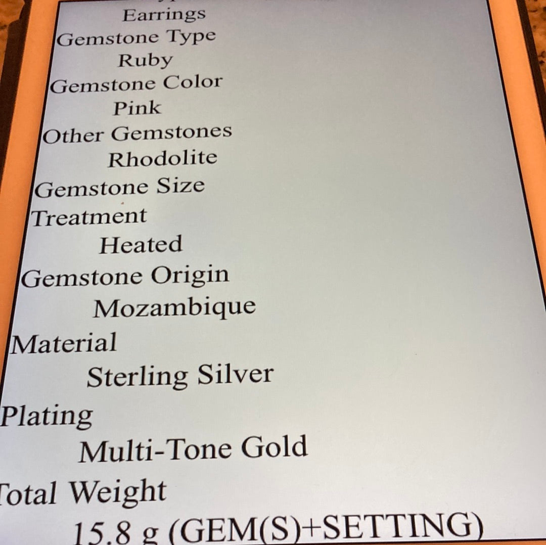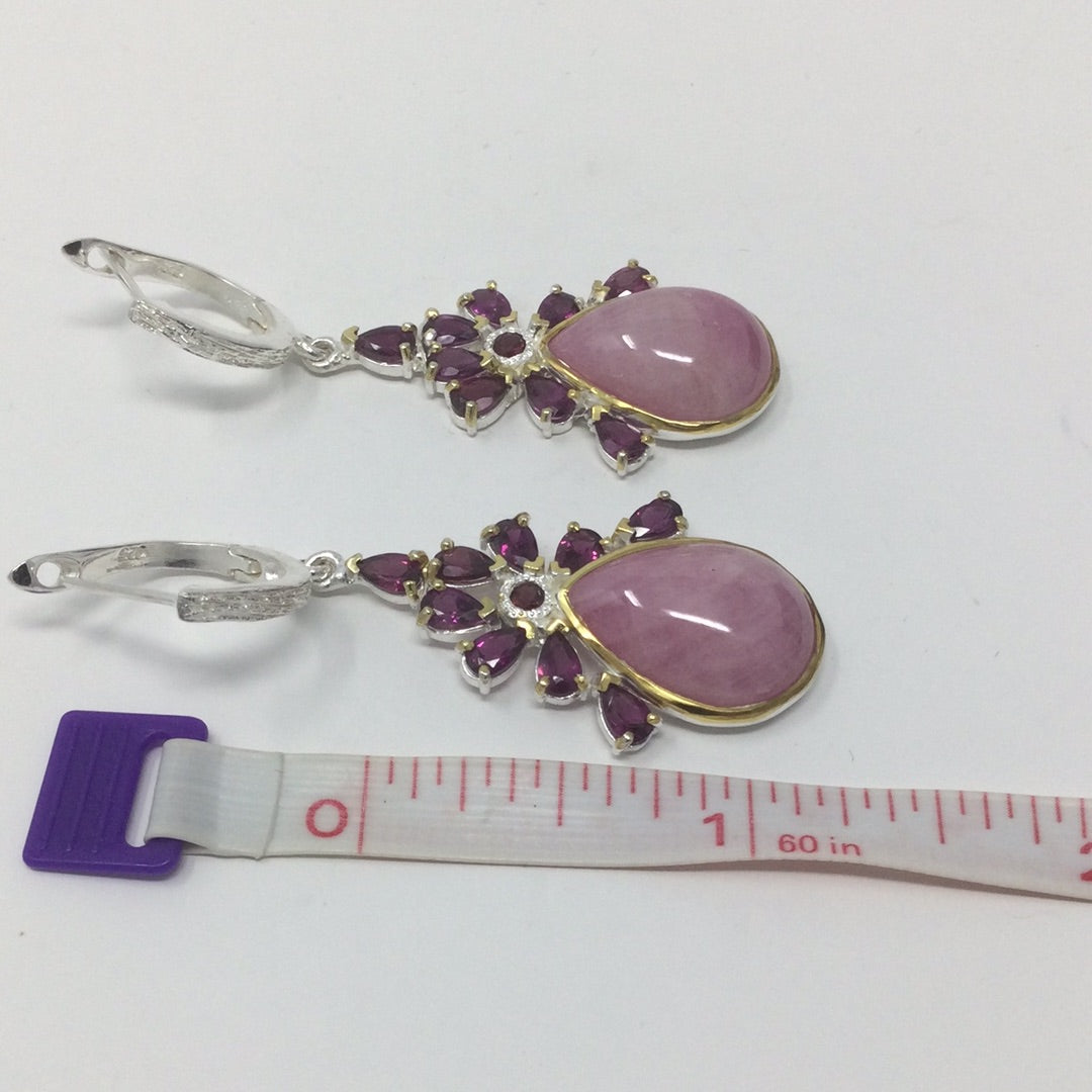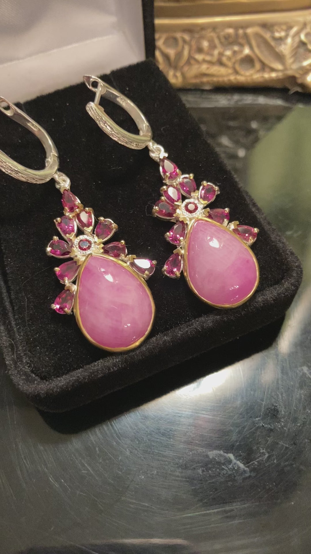 Outstanding genuine soft pink Ruby cabochons, majestically accented with genuine Rhodolite Garnets, a symphony of enchantment. These are custom made, one of a kind artisan made gemstone earrings. Every girl should have genuine gemstones in her jewelers collection especially unique pieces such as these. Each gemstone is hand selected as if for a cohesive work of art. The only way worthy to frame you face with luminescence, genuine gemstones. Set in .925 sterling silver overlaid with 14 K white gold with 14K yellow gold accents. Approximately 1 1/2” Long.